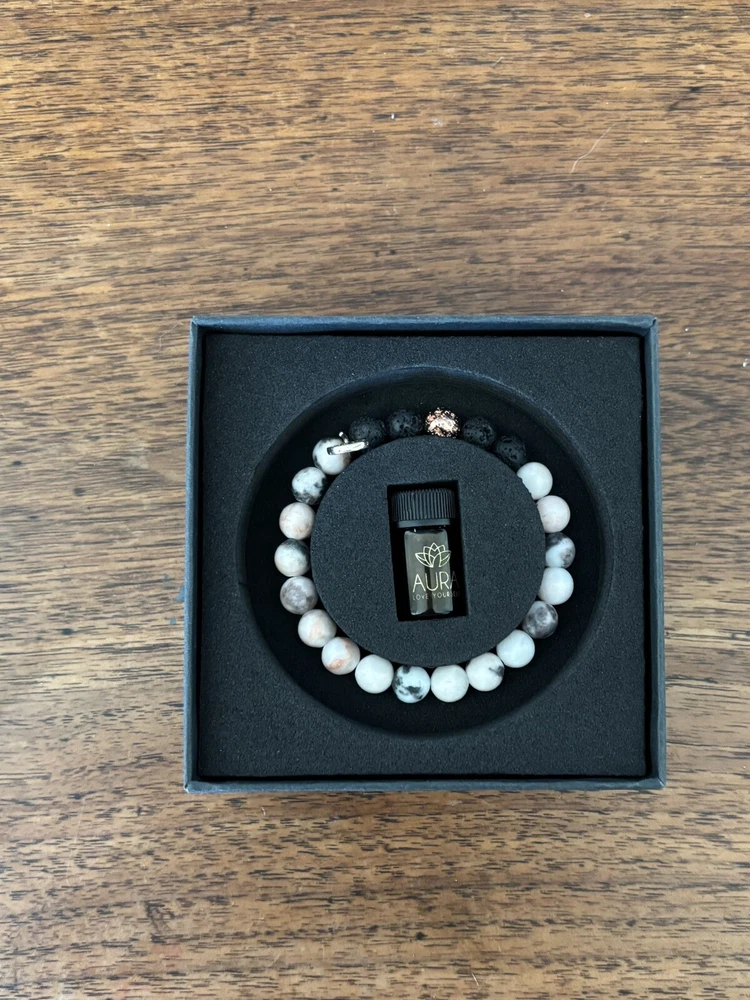 Lovely Relaxation gift Lava Rock Bracelet Beads with Calming Essential Oil.brand new in box although box is very slightly shopworn- please see pictures. Perfect gift for Valentine’s Day!!