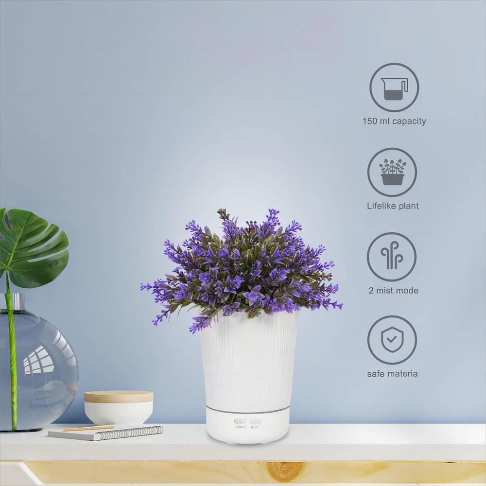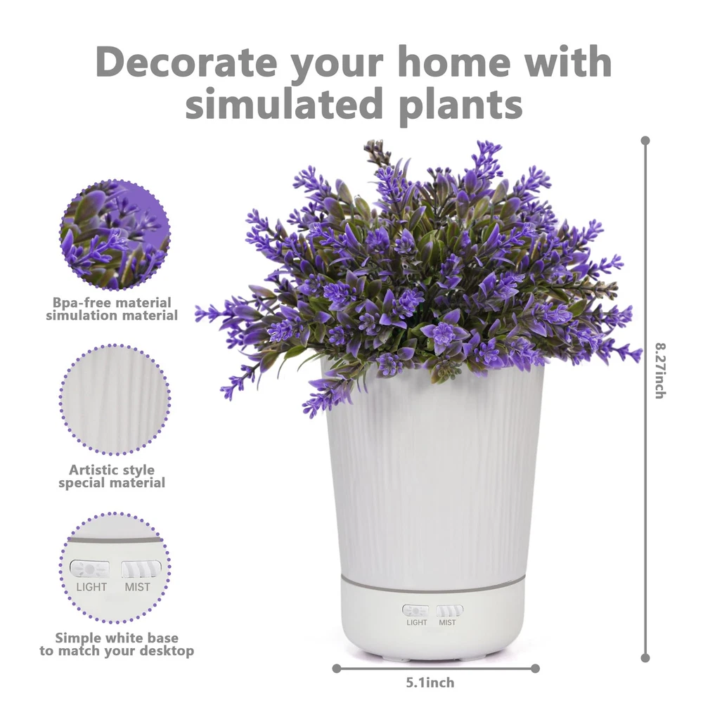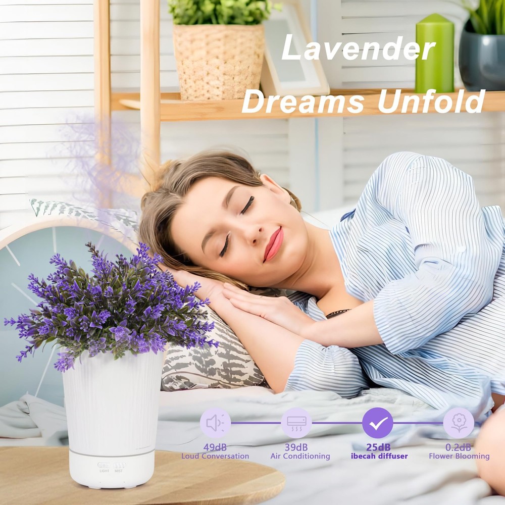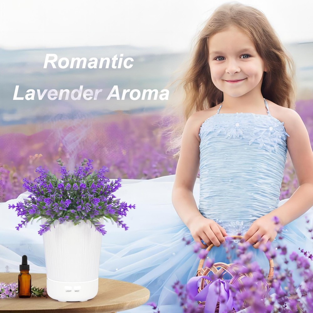 Experience tranquility and well-being at your fingertips with our Essential Oil Diffuser designed to mimic a beautiful Lavender Plant. This unique 120ml diffuser promises an ambient, aromatherapy experience with the added benefits of a cool mist humidifier. With impressive silent operation and a safety-feature of waterless auto shut-off, it's an addition to your space you'll love, and a perfect gift for those you care about. Join us on a journey of serene, aromatic relaxation that truly transforms your living space. 💗IMMERSIVE ROMANTIC: Not just a oil diffuser, but a beautiful decorative item you can proudly display on any countertop. Lavender signifies eternal love, making this the perfect gift to show that your love remains unchanging. Pair with lavender essential oil to experience the true tranquility of a lavender field in your own home! 💗WHISPER QUIET OPERATION: Quiet your mind and achieve relaxation with this ultra-quiet , aromatherapy diffuser operating at less than 30 decibels. It provides pleasant aromas, improves room odors, increases humidity, nourishes your skin, and supports healthier breathing. Ideal for a peaceful night's sleep! 💗WATERLESS AUTO SHUT-OFF: No need to worry about traditional candle hazards anymore! With a built-in water shortage cutoff protection, this essential oil diffuser eliminates worries of running dry and auto shuts off to ensure utmost safety during use, even while you’re asleep or busy. 💗IDEAL GIFT CHOICE: Finding the perfect gift for holidays and special occasions can be stressful. Our lavender diffuser is not just a gift, but a gesture of well-being. Perfect for Christmas, Mother's Day, Valentine's Day, and birthdays, this diffuser promises a healthier, aroma-filled lifestyle to your loved ones. 💗PROFESSIONAL AND CARING CUSTOMER SERVICE: We place your satisfaction as our top priority. Our oil diffuser is safety tested and durable. We offer 100% after-sales service, with hassle-free returns and exchanges for any quality issues.