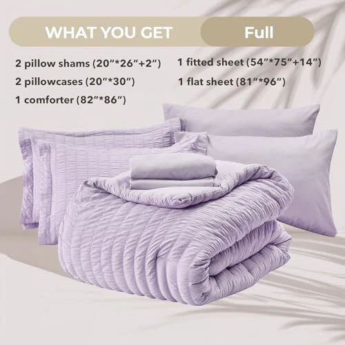 Return Policy Fast Delivery Trusted seller Lavender Full Size Comforter Sets Seersucker 7 Pieces, All Season Luxury Bed in a Bag for Bedroom, Bedding Set with Comforters, Sheets, Pillowcases & Shams Product Description Certified Safe Fabric: This full size comforter set is certified by OEKO-TEX Standard 100, ensuring it meets high safety standards and is free from harmful substances; made from soft microfiber, the interior is filled with premium 240 GSM microfiber, providing a cloud-like sleeping experience suitable for all seasons Anti-Wrinkle Textured Design: Unlike traditional, plain duvet covers, our slightly pleated seersucker texture is both beautiful and delicate; creates a vivid three-dimensional wavy pattern; the striped texture enhances this design, which is wrinkle-resistant and easy to care for; the gentle seersucker queen bedding set adds a unique sense of romance and elegance to your room Deep Pocket Fitted Sheet: Our stretchy deep-pocket fitted sheet easily fits any 12-15 inch mattress and stays in place no matter how you toss and turn; the soft brushed microfiber fabric provides just the right amount of warmth and comfort What's Included: The full size bed set includes 1 Comforter (82" x 86"), 2 pillowcases (20" x 30"), 2 Pillow Shams (20" x 26" x 2"), 1 Fitted Sheet (54" x 75" x 14"), 1 Flat Sheet (81" x 96"); the set is packed in a vacuum bag; simply dry on low heat or gently fluff under the sun to restore its loft Easy Care: Our bed in a bag set is easy to care for; simply machine wash in cold water; if you have any questions or concerns, our customer service team is to help Shipping Returns Payment Shipping Shipping is FREE to all addresses other than APO/PO boxes in the lower 48 states. All our stock ships from US-based warehouses. Shipped via USPS or UPS (depending on location and package weight) Unless stated otherwise, all orders will ship within 24-72 hours of your payment being processed. Check our feedback to see the great reviews of FAST shipping we offer. Returns Seller does not accept returns Payment We currently accept payment via eBay managed payments only. Once payment is cleared, we will dispatch your shipment within 1-3 business days. Please refer to the "Shipping" tab for more information regarding shipping speed to your destination.