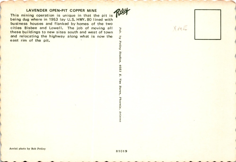 MAKE AN OFFER. THE MORE YOU BUY THE BETTER DEAL I WILL ACCEPT The postcard features an aerial view of the Lavender Pit Copper Mine, a unique mining operation located in Bisbee, Arizona. The Lavender Pit was a large open-pit copper mine that was in operation from 1950 to 1974. It was named after Harrison M. Lavender, who was a mining engineer for Phelps Dodge Corporation.