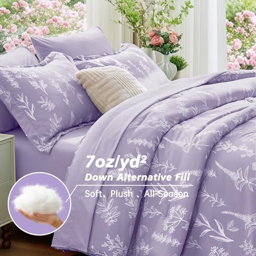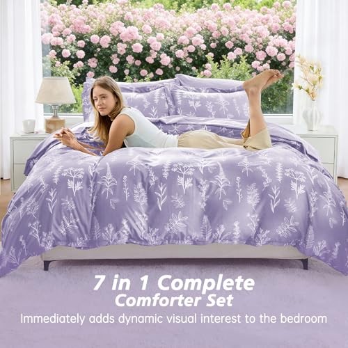 Lavender Purple Bed in a Bag Queen 7 Pieces, Queen(88"x 88") Lavender Leaves