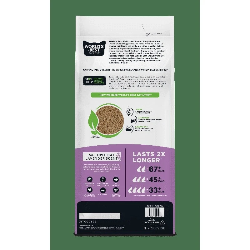 You may also like Coconut Clumping Cat Litter 2 Pack All Natural Lightweight Odor Control 8.5 lbs 44.97 USD 47.34 USD Free shipping 5% off Non-Clumping Cat Litter Pellets 2 Pack Low Dust Odor Control 3.5lb Pouch New 44.63 USD 50.31 USD Free shipping 11% off Lightweight Multi-Cat Cat Litter Clumping Odor Control Low Dust 21-Day Action US 31.86 USD 33.54 USD Free shipping 5% off Non Clumping Cat Litter Febreze Freshness 14lbs Odor Control Easy Cleanup New 13.13 USD 13.82 USD Free shipping 5% off Non Clumping Cat Litter Odor Control Multi Cat Low Dust Instant Action 40lb New 53.88 USD Free shipping Instant Action Clumping Cat Litter Low Dust Odor Control Multi Cat 14 lb Jug New 14.85 USD 15.63 USD Free shipping 5% off Multi-Cat Clumping Cat Litter Low Dust Odor Control 4-in-1 Fresh Floral 20 lb US 18.4 USD 19.37 USD Free shipping 5% off Lightweight Clumping Cat Litter Odor Control 24/7 Fast Acting Low Dust 17lb New 36.74 USD 38.67 USD Free shipping 5% off Non Clumping Cat Litter W/ Febreze Fresh Odor Control 14lbs 2 Pack Easy Cleanup 22.33 USD 23.51 USD Free shipping 5% off Unscented Cat Litter Low Dust Clumping Odor Control Activated Charcoal 35lb Pail 27.03 USD 28.45 USD Free shipping 5% off Scented Advanced Odor Control Clumping Cat Litter 20lbs Dust Free Low Tracking 16.76 USD 17.64 USD Free shipping 5% off Fresh Scented Non-Clumping Cat Litter 20lbs 2 Pack Odor Control High Absorbency 20.56 USD 21.64 USD Free shipping 5% off World’s Best Cat Litter® Multiple Cat Lavender Scent formula – the perfect choice for those who prefer a fresh scent in their litter. Made from whole-kernel corn grown in the U. S. , this formula is similar to the Multiple Cat Unscented formula but includes a natural lavender oil blend for a pleasant fragrance. All World’s Best Cat Litter® formulas are crafted from natural, renewable ingredients, free from harmful chemicals, synthetic perfumes, or clays. Our advanced, patented process harnesses the natural absorbency of renewable ingredients, ensuring our litter is pet-, people-, and planet-friendly. The lavender fragrance is derived from plant-based oil and contains no synthetic ingredients, providing a fresh scent without harming your pets. If your pet shows any adverse reactions or begins to eat the litter, discontinue use immediately. The fragrance may dissipate over time, but the litter will continue to perform effectively. Store unused portions in a cool, dry place, sealed in the bag or bin. All World’s Best Cat Litter® formulas are rigorously tested to be sewer- and septic-safe, allowing you to scoop, flush, and move on with your day. Choose Multiple Cat Lavender Scent formula for a naturally fresh, effective, and sustainable litter solution. NEW LOOK, SAME FORMULA: Our bag’s getting a makeover, but our purrfect litter stays unchanged! The same formula, the same litter and the same great clump. New look coming soon. OUTSTANDING ODOR CONTROL — More cats shouldn’t mean more smells — keep your cats happy with a natural litter with long-lasting odor control. QUICK CLUMPING & EASY SCOOPING — No more chiseling and scraping thanks to a fast-acting natural litter that leaves less mess in and around your litter box. LIGHTWEIGHT & 99% DUST FREE — Naturally free of silica dust, this lightweight cat litter offers low tracking and less mess — so you and your cat can breathe easy. For the best results, do NOT mix with a non-clumping litter. PET, PEOPLE & PLANET FRIENDLY — A naturally safe litter made from whole-kernel corn that offers no harmful chemicals and no artificial perfumes. Bathroom Sink Hair Catcher Stainless Steel Drain Protector Universal Fit 1 Pack 18.75 USD 19.74 USD Free shipping 5% off Coconut Clumping Cat Litter 2 Pack All Natural Lightweight Odor Control 8.5 lbs 44.97 USD 47.34 USD Free shipping 5% off 4.00-6 Wheelbarrow Tire All-Terrain Utility Non-Radial Load A Durable Traction 25.12 USD 26.44 USD Free shipping 5% off Hanging Closet Organizer W/ 6 Shelves & 3 Side Pockets Adult Clothes Storage New 27.29 USD 28.73 USD Free shipping 5% off Self Adhesive Shelf Liner Gridded Back Easy Peel No Residue 2 Pack 30 SQ FT New 13.15 USD 13.84 USD Free shipping 5% off 8in Wheel Replacement Walk-Behind Mowers Troy-Bilt Snapper Yard Machine Murray 29.3 USD 30.84 USD Free shipping 5% off Bermudagrass Grass Seed Mix Full Sun Fast Establishment Drought Tolerant 8.75 lb 48.49 USD 51.04 USD Free shipping 5% off Extreme Odor Control Small Animal Bedding 99% Dust Free Absorbent Nesting New 17.38 USD 18.29 USD Free shipping 5% off Programmable 1 Zone Water Timer Automatic Garden Irrigation Flow Control System 44.37 USD 46.71 USD Free shipping 5% off Allergen Defense HVAC Air Filter 800 MPR pleated 3-in-1 technology cleaner air 17.38 USD 18.29 USD Free shipping 5% off Dipped Dog Biscuits Peanut Butter Flavor Crunchy Treats All Sizes 32oz 2Count 25.09 USD 26.41 USD Free shipping 5% off Waterproof Mattress Pad 200 Thread Count Twin Cotton Hypoallergenic Protector US 27.45 USD 28.89 USD Free shipping 5% off