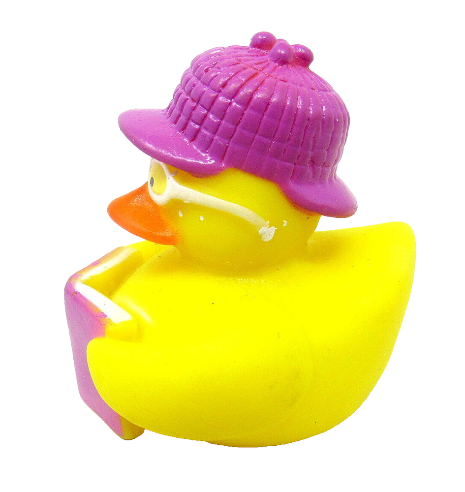 Reading Mystery Book, Rubber Duck, 2", Lavender, Squirter, Sherlock Holmes Deerstalker Hat , US Seller. Use as gift tie, party favor, float in hot tub, stocking stuffer or gift basket Condition - New. Perfect condition. Never used. There may be slight paint smudges from manufacturing. Not Recommended - for Children Under 3 Years of Age. Actual Size - 2 " tall Squirter - There is a hole in the beak. Not guaranteed to float upright. All our packages ship with tracking. Stored & Ships from our smoke free - pet free home If there is a problem please contact us we try to respond within a few hours. Thanks for looking and please visit us again, very soon. HerbsCraftsGifts