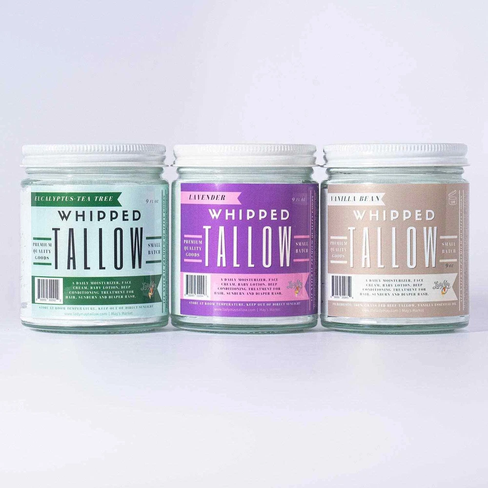 Experience the ultimate in natural skincare with Lady May Lavender Whipped Tallow , a luxurious, all-natural moisturizer made from beef tallow . Light, fluffy, and nutrient-rich, this whipped tallow deeply hydrates, soothes irritation, and promotes healthy, radiant skin. Infused with calming lavender essential oil , it provides a relaxing, therapeutic skincare experience. Pure & Natural Benefits Deep Hydration - Locks in moisture to heal and restore dry, cracked skin. Nutrient-Rich Formula - Packed with Vitamins A, D, E, and K plus essential fatty acids to nourish and protect. Soothes Skin Conditions - Helps with eczema, dry patches, diaper rash, and sunburn . Anti-Aging Properties - Rich in antioxidants that combat fine lines, wrinkles, and UV damage . Gentle & Preservative-Free - Ideal for sensitive skin , including babies and those with allergies. Multipurpose Use - Works as a skin treatment, hair mask, cuticle balm, and natural healing balm . Product Specifications Whipped for a light, airy texture 100% natural, preservative-free, and non-toxic Non-greasy, fast-absorbing formula Safe for all ages, including babies Handcrafted in small batches for superior quality Perfect For: Daily face and body moisturizer Healing dry, cracked skin and rough patches Soothing irritated, inflamed, or sensitive skin Restoring skin elasticity and softness Relaxing aromatherapy skincare with calming lavender Natural alternative to chemical-based lotions Sustainable Features Ethically sourced, beef tallow Zero synthetic additives or artificial preservatives Eco-friendly packaging Handmade in the USA Transform your skincare routine with Lady May Lavender Whipped Tallow , the ultimate all-natural moisturizer for soft, healthy, and nourished skin. FREE SHIPPING WHEN YOU SPEND OVER $75.00