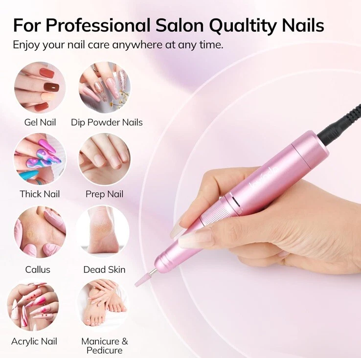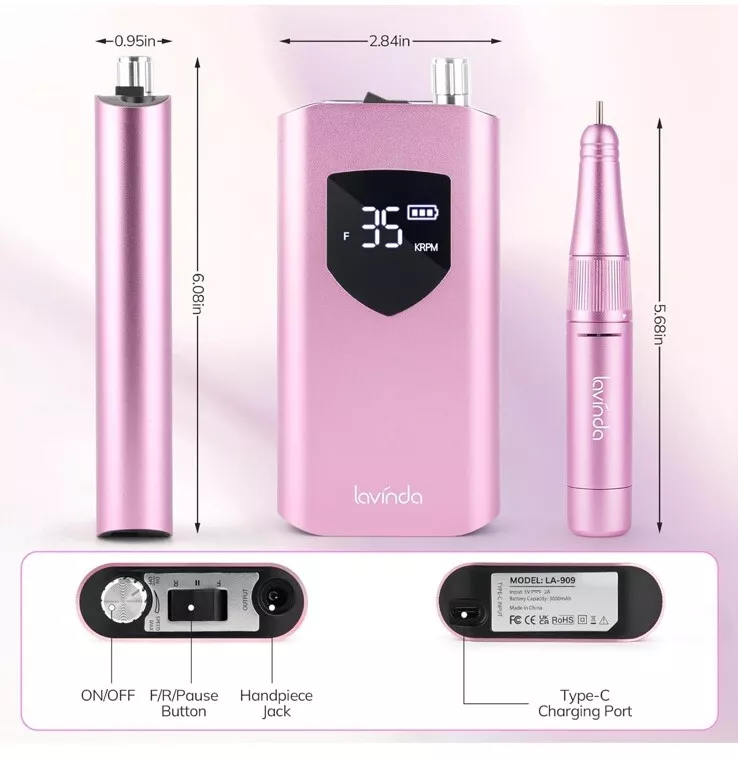 High Speed up to 35000 RPM: This electric nail drill machine is equipped with high-quality bearings, which enables it to work smoothly at a high and adjustable speed (0-35000 RPM) by rotating the speed control knob easily. Whether you’re a seasoned salon professional or a DIY enthusiast, this nail file drill is the perfect tool for achieving flawless nail art. Rechargeable, Cordless: Boasting a high-capacity 3000mA battery, this cordless nail drill charges fully in just 2-3 hours and provides 8-10 hours of continuous use. The smart LCD display keeps you informed of the speed and power levels. With reduced vibration and heat generation, it ensures a smooth and comfortable experience. The rechargeable nail drill is compact enough to fit in a travel bag or suitcase. You can use this cordless nail drill anytime and anywhere. Ergonomic Handpiece: Crafted from high-quality aluminum alloy, the handpiece of this electric nail drill is designed for comfort and efficiency. The ample ventilation holes effectively dissipate heat, while the pencil-shape and lightweight design minimize hand fatigue, even during extended use. Compatible with all 3/32” shank bits, it offers precision and control. Versatile Nail Drill Set: This comprehensive set includes 6 different nail drills and 6 sanding bands, accommodating a wide range of 3/32 inch shank drills. Whether you’re shaping nails, smoothing calluses, or removing gel or acrylic nails, this set has everything you need for sanding, cutting, carving, filing, and buffing. User-Friendly Operation: Changing the bit’s rotating direction is as simple as pressing the F/R button, making it suitable for both right-handed and left-handed users. The intuitive speed control ensures precise nail grinding without causing damage. We are committed to the quality of our product. If you encounter any issues with the Lavinda nail drill, please contact us through "contact sellers," and we will provide a satisfactory solution within 24 hours.