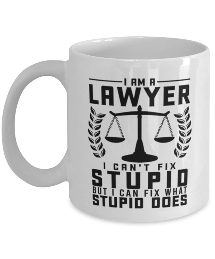 Lawyer Funny Graduation Mug I'm A Lawyer I Cant Fix Stupid But I Can Fix What Product Details.. This high quality 11oz. ceramic white mug has a premium hard coat that provides crisp and vibrant color reproduction sure to last for years. Perfect for all hot & cold beverages. The highest quality printing possible is used. It will never fade no matter how many times you wash it. Material: 100% Ceramic. Print both sides. Dishwasher and Microwave Safe. High Gloss + Premium White Finish. Printed in the U.S.A. Personalized & Custom. We support personalized and custom mug to add custom, when placing an order, you can add notes to the "order note" in shipping address section. Also you can contact us directly via message. Shipping Info. Ready to ship in 1 to 2 business days, All products are made-to-order and proudly printed in the United States. Shipped by USPS and DHL, You will receive your order in 5-7 days. Replace & Refund. All products are defective during shipping broken, chipped will be replaced free of charge. You are not satisfied with the product, we will refund 100% money to you. If any other issues arise, please do not hesitate to message, we would be more than happy to assist you.