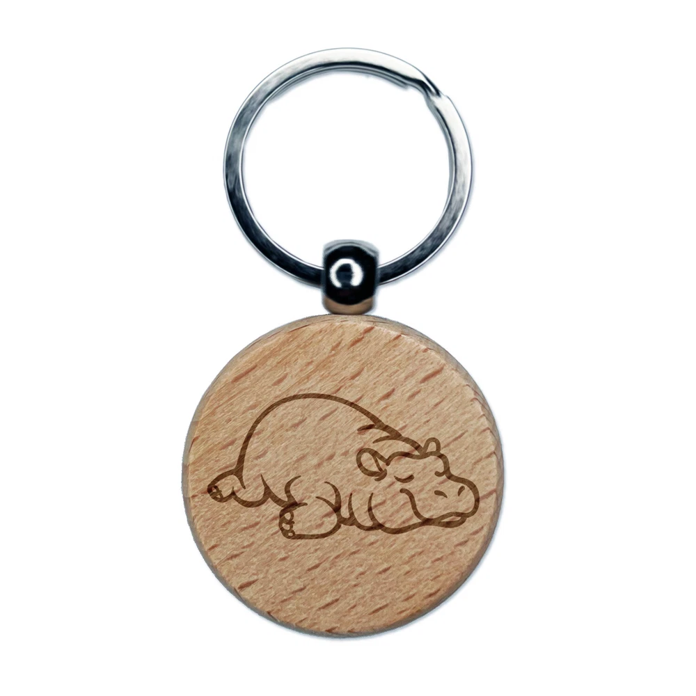 Lazy Hippo Hippopotamus Cute Engraved Wood Round Keychain Tag Charm