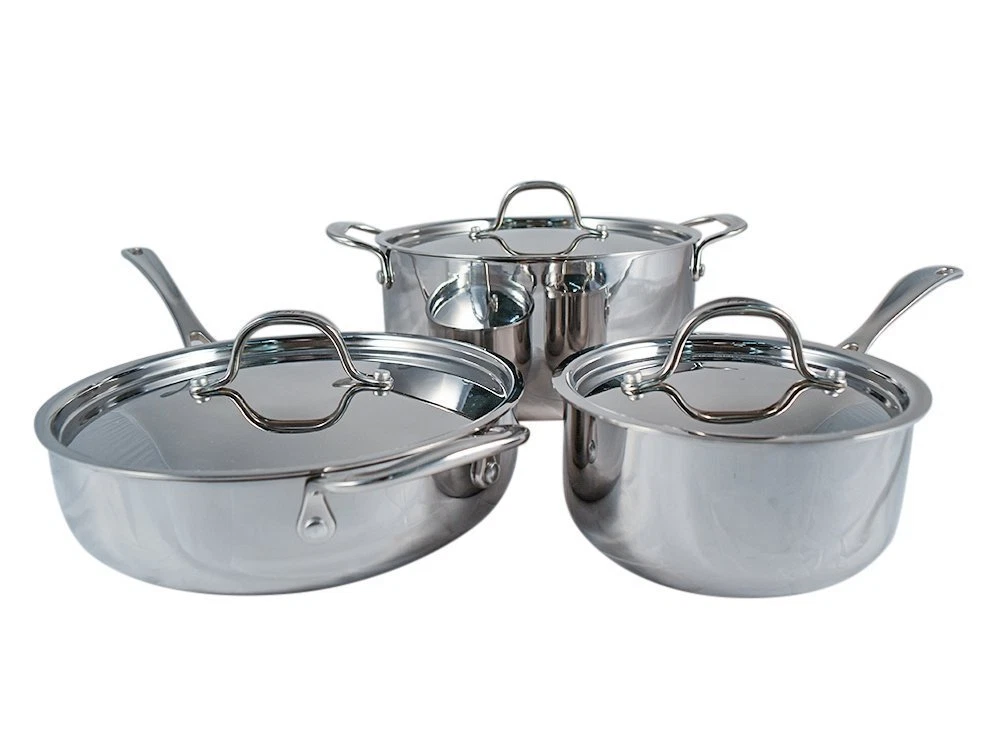 Le Chef 5-ply Stainless Steel 6 Piece Cookware Set with Stainless Steel Lid. Clearance Sale! Le Chef® 5-ply Stainless Steel 6 Piece Cookware Set with Stainless Steel Lid is a great staple piece to add to your cookware collection. For easy transition from stovetop to oven. Le Chef 5-ply Stainless Steel 6 Piece Cookware Set making delicious gourmet-class dinners at home has never been so enjoyable. Boil pasta for penne primavera showcasing tomatoes and zucchini freshly picked from the garden. Or, create a steaming batch of bison chili to ward off the chill of a winter night. The cookware's durable five-ply construction features an aluminum core between layers of stainless steel for excellent, efficient heat distribution all the way up the sides of the pan. This 6 piece cookware set is suitable for use on all stovetops and the polished, sophisticated stainless steel exterior is easy to clean. Comfortable, stylish handles are dual riveted for strength, and the deep-seated coordinating stainless steel lid seals in heat and moisture for a clean, professional look and performance. Like all the durable, versatile pots and pans from the Le Chef 5-Ply Stainless Steel collection, this 6 piece dutch oven set is a great addition to every home kitchen. 5-ply Stainless Steel 6 Piece Cookware Set Feature: 5-ply construction consisting of a 18/8 stainless steel interior, 3-layer aluminum core, and magnetic stainless steel exterior. The inside is mirror polish. 5-Ply Stainless Steel Cookware combines the durability of stainless steel with the heating efficiency of aluminum. The cookware set is dishwasher safe for convenient cleanup and oven safe to 500°F. Heavy-duty 5-ply construction suited to daily, utilitarian use for a lifetime performance. Set includes:1 1/2-qt .Round Sauce Pan, 5-qt.Round Dutch Oven, 2 3/4-qt.Round Saute Pan. 2.5mm thick 5-ply 18/8 stainless steel pans with 2.0mm thick 18/8 stainless steel lids. There are holes in the handles to hang. Guarantee Top Quality. * Manufacturer's 3-year limited warranty. * This Photo Is Taken From Actual Object / Not A Stock Photo 18/8 Stainless steel Interior: Exterior: 18/8 Stainless steel Set includes: 1 1/2-qt .Round Sauce Pan: Length 13 1/2"(INCLUDE the handles)x Diameter 6 1/2"x Depth 3 1/4". 5-qt.Round Dutch Oven: Length 12 3/4"(INCLUDE the handles) x Diameter 9 1/2"x Depth 4 3/4". 2 3/4-qt.Round Saute Pan: Length 19"(INCLUDE the handles)x 9 1/2"x Depth 2 1/2". 2.5mm thick 5-ply 18/8 stainless steel pans with 2.0mm thick 18/8 stainless steel lids. Please check our other items and we will gladly combine items to save you money on shipping! Please allow 1~2 working business days of handling time after payment received or cleared. UPS is used for most of shipments in the US. Please allow 1~6 business days for delivery. USPS Parcel / Priority Mail will sometimes be used for light-weighted shipments. All shipment will be shipped with insurance which has already included in the shipping charge. We accept PAYPAL as the only payment type Credit Card ( VISA, Master Card, America Express ) & eCheck are also acceptable. Any physical payments are NO longer acceptable!! RETURN POLICY : Our Satisfaction Guarantee allows you to return item within 30 days for exchange or refund. In order for a return or an exchange to be covered by our Satisfaction Guarantee, the items must be: Returned in its original packaging as shipped / well packed and protected. Attached with the original receipt. Product MUST NOT be used. Customer must CONTACT us in order to obtain a valid RMA (Return Merchandise Authorization) before returning the item. On any return, the customer is responsible for all shipping charges, including any costs incurred in getting the product both to and from the customer, unless the return is due to the wrong item shipped or damaged item received. We will accept exchanging for damages that may occur during delivery. However, It is the customer’s responsibility to inform us of any problems with this type of delivery at the time of receipt of the products. If, upon inspection of a shipment, the product itself is visibly damaged, CONTACT us within 3 days of delivery and note any damages on the delivery receipt! This way, we have proof that the item was damaged by the shipping company and not by the customer. Doing these things will expedite receipt of a replacement product on your end, and reimbursement from the shipping company on our end. It is very important for buyer to inpect the item upon delivery. If an item is shipped and returned because it is not deliverable due to an incorrect address, the customer will be responsible for shipping both ways. If the product is returned because the freight company could not reach the customer, this will be considered a return, and the order will be subject to our regular return policies. All returns require previous communication us and obtain a valid RMA (Return Merchandise Authorization) Number. Please do not simply ship items back! Items must be returned prepaid in resalable condition with all documentations. Please packed your return shipment well and insure your shipment. If your return arrives to us damaged, you will have to file a claim with the shipping company to be reimbursed for the product. If we sent the wrong item, we will pay for the return shipping, and we will get the correct item to you at no extra cost or refund the full cost of the merchandise at your request. Customer must notify us within (3) days of receipt of any shipping damages. Customer is responsible for any damage to the product when shipping back to us. Simple click CONTACT to report any issues and we will gladly help you out. C are : Allow pan to cool before washing. Hand-wash; dry immediately with a soft cloth. Avoid using steel wool, steel scouring pads or harsh detergents. Stainless steel will develop a rich patina over time. This will not affect the pan’s cooking performance. WHOLESALES : We also have wholesale deal available on 