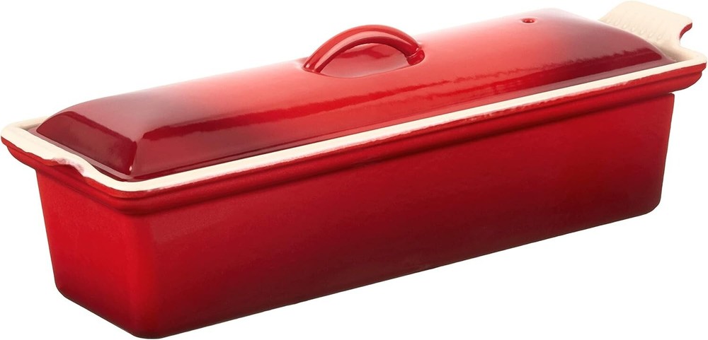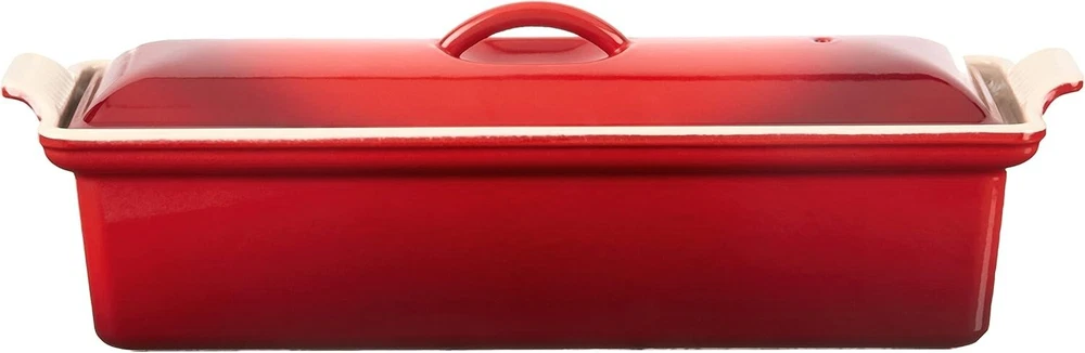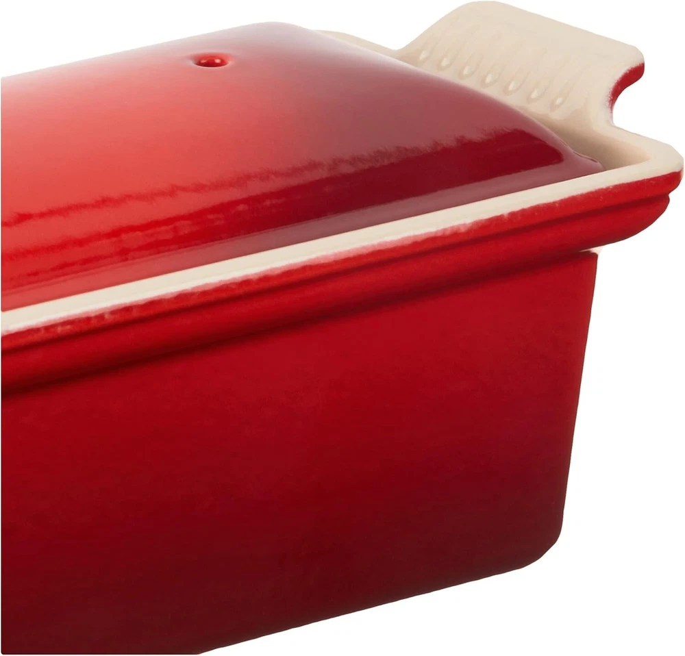 Le Creuset Enameled Cast Iron Pâté Terrine, 2 qt., Cerise Material Cast Iron Brand Le Creuset Color Cerise Finish Type Painted Shape Rectangular Capacity 1.3 Liters Item Weight 6.5 Pounds Product Care Instructions Oven Safe With Lid Yes Is Oven Safe Yes This cast-iron terrine from Le Creuset excels at gentle, even heating, essential for slowly cooked pâtés. Ideally sized for lasagna, meatloaf, bread or even custard, the heavy, tight-fitting lid seals in steam, so foods emerge tender and moist. 1 1/2-qt. cap. Cast iron coated with durable porcelain enamel distributes heat slowly and evenly. Easy-clean nonreactive interior does not require seasoning. Ideal for use in the oven or on any cooktop, including induction. Vibrant, colorful exterior for stove-to-table presentation. Made in France. Commercial Grade: Thoughtfully designed and expertly engineered to meet rigorous standards and best practices from select commercial testing.