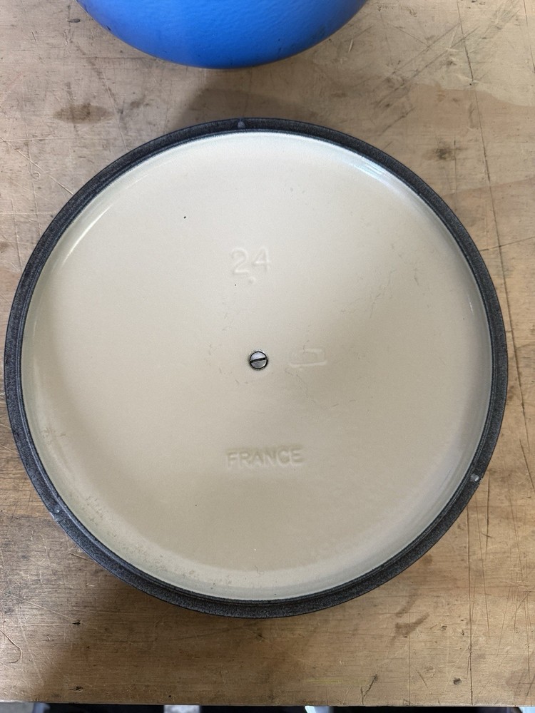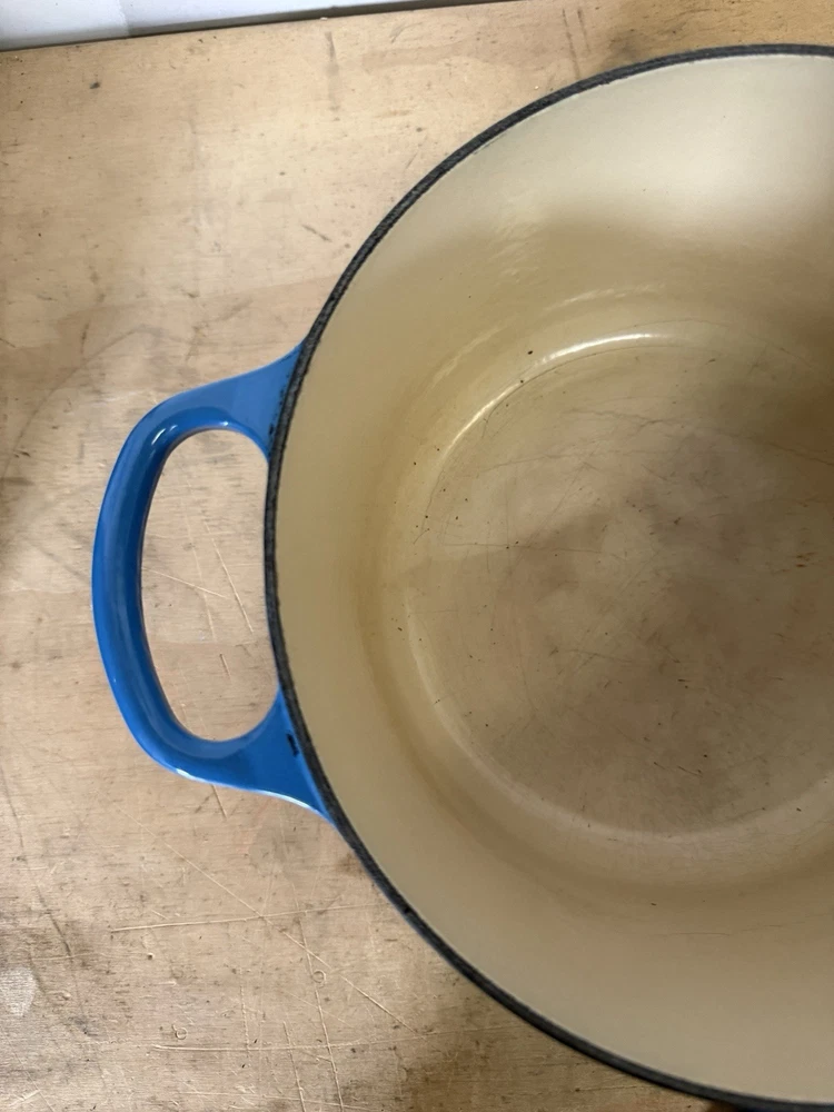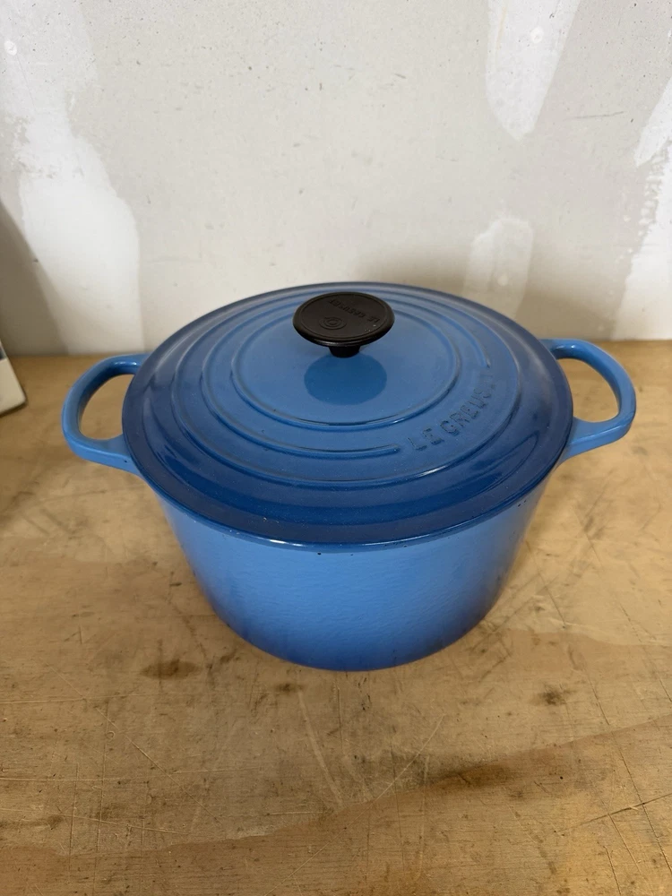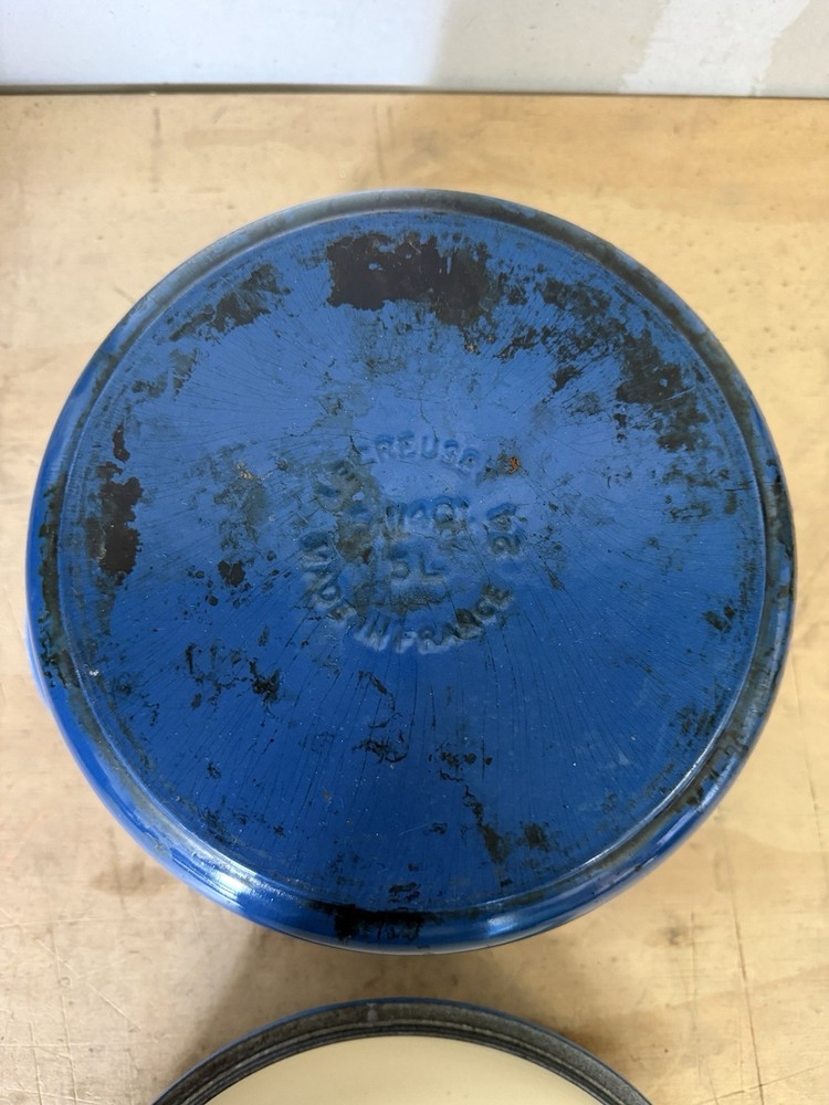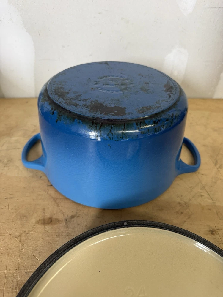 Le Creuset enameled cast iron Dutch oven, size #24. Capacity marked on the bottom: 5 liters / 5.25 qt. Blue color. Pre-owned with normal signs of use, surface wear, and wear on the bottom as shown in the photos. Lid included.