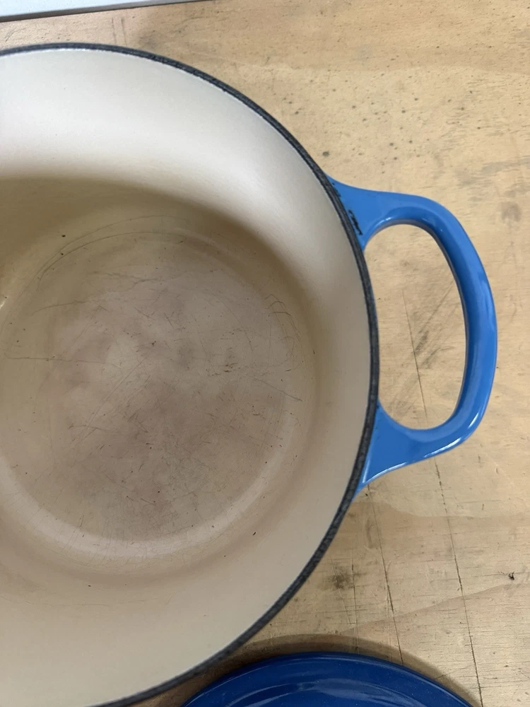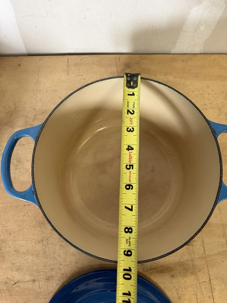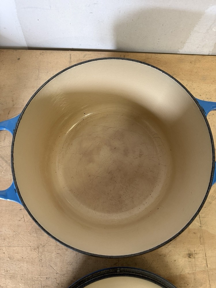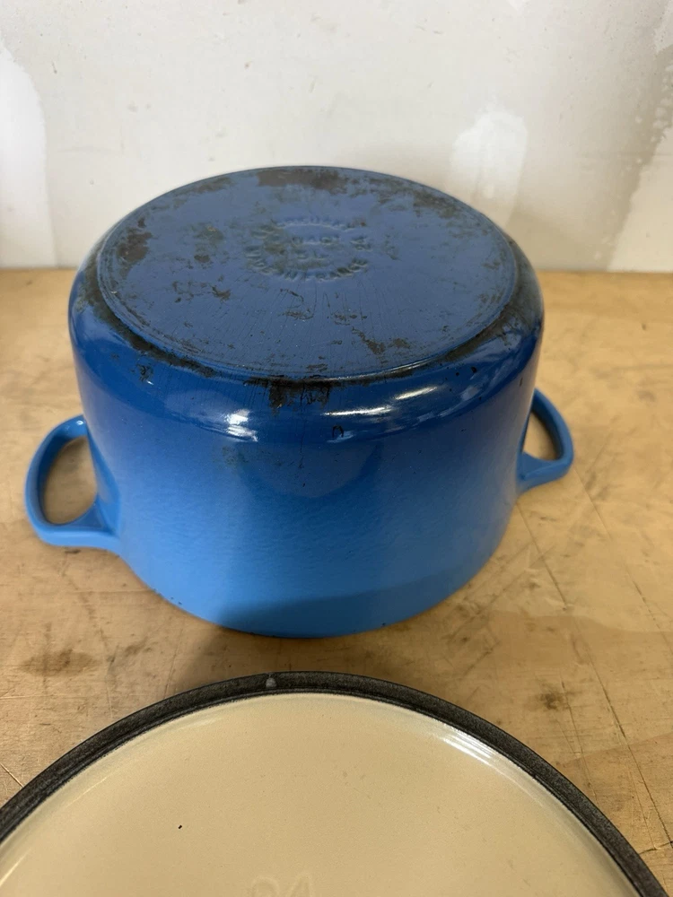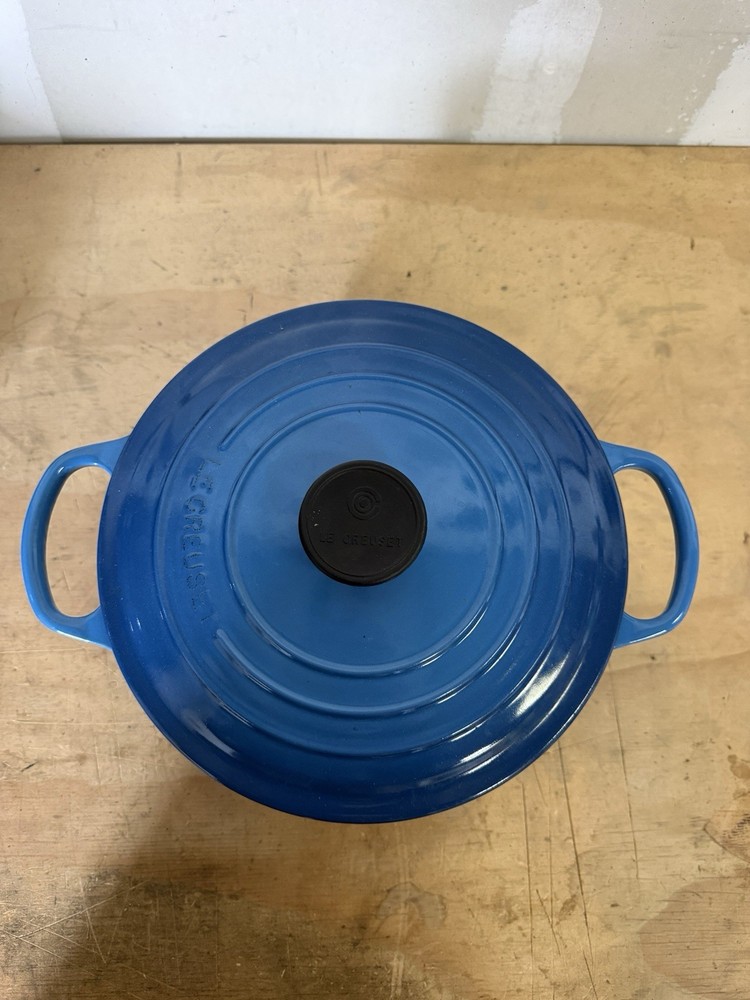 Le Creuset enameled cast iron Dutch oven, size #24. Capacity marked on the bottom: 5 liters / 5.25 qt. Blue color. Pre-owned with normal signs of use, surface wear, and wear on the bottom as shown in the photos. Lid included.