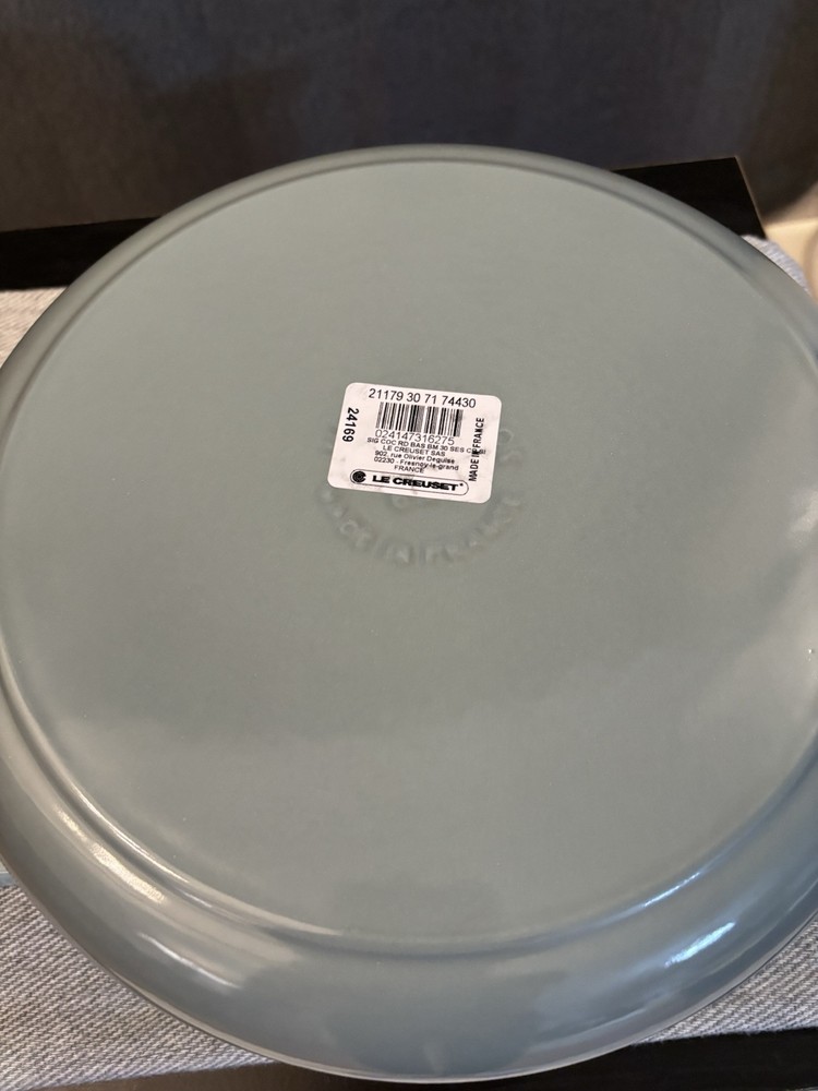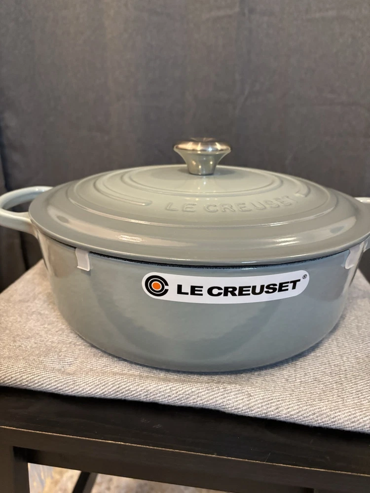 Le Creuset Signature Round Wide Oven, 6.75qt, Sea Salt Color Color: Sea Salt Size: 6.75qt Servings: 6-7 Enameled cast iron delivers superior heat distribution and retention Ready to use, requires no seasoning Easy-to-clean and durable enamel resists dulling, staining, chipping and cracking Light colored smooth interior enamel allows easy monitoring of cooking progress Tight-fitting lid is specially designed to circulate steam and return moisture back to the food Ergonomic knobs and handles are designed for easy lifting Lightest weight cast iron by quart on the market Compatible with all cooktops and oven-safe up to 500° Open box item