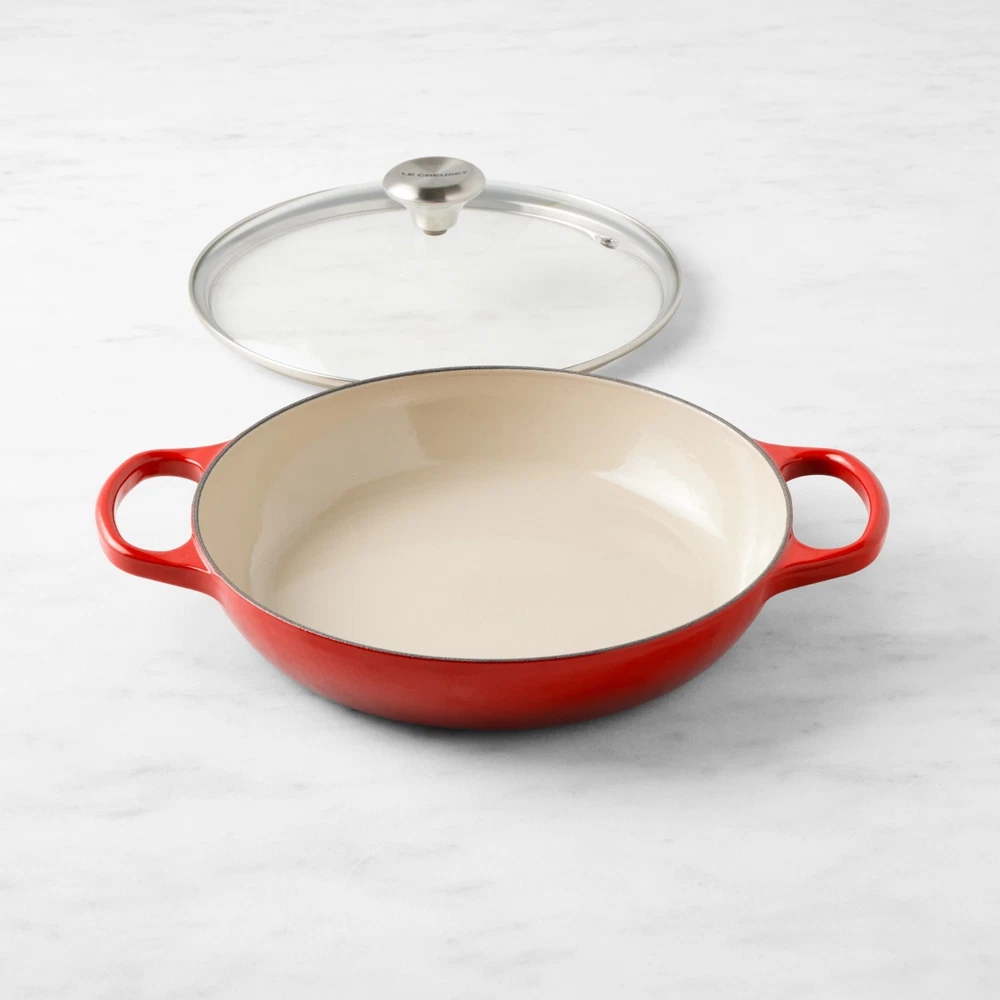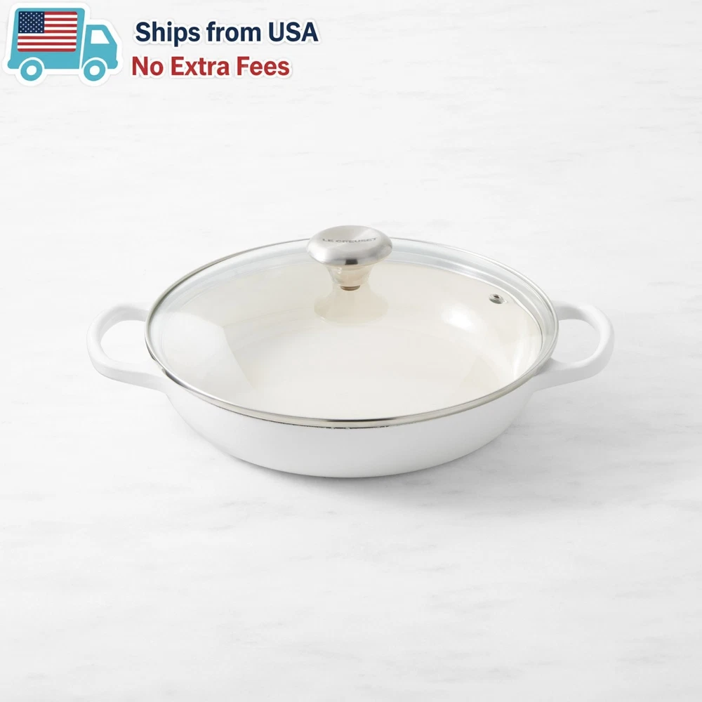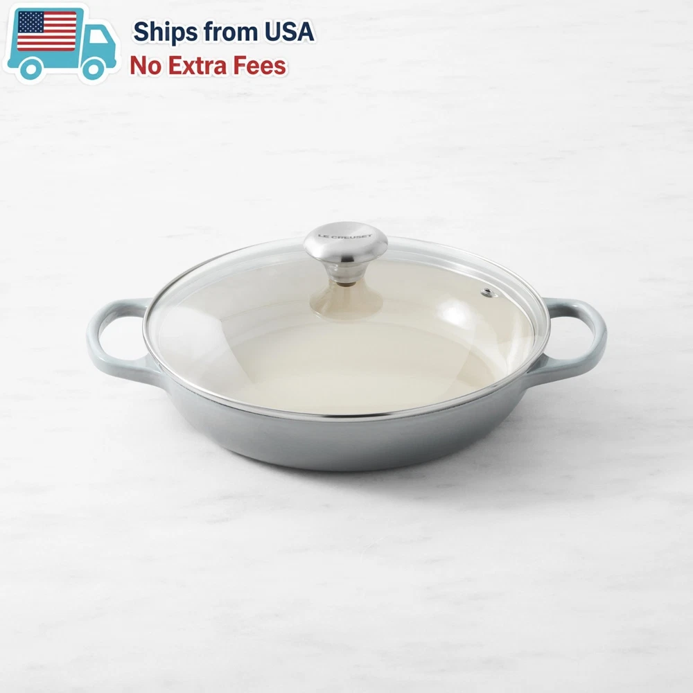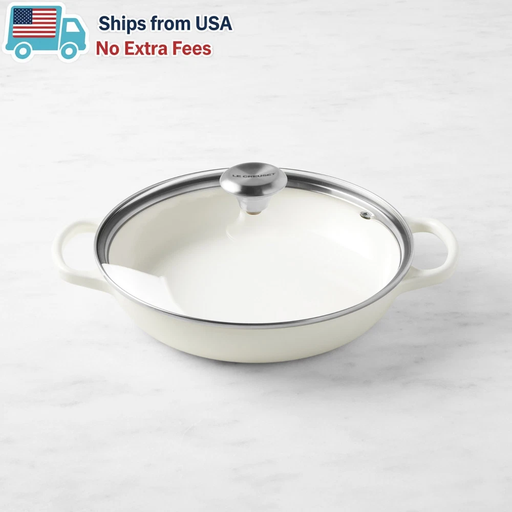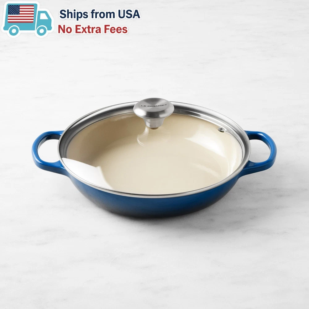 Le Creuset Signature Enameled Cast Iron Braiser with Glass Lid, 2 1/4-Qt An essential pan for everyday cooking, Le Creuset's braiser features a wide, flat base for searing and a tempered glass lid to lock in moisture and flavor. Its cast-iron construction ensures superior heat distribution. and the vibrant enameled finish is easy to clean and maintain. Use this pan for sautéing, shallow frying, steaming, baking casseroles, roasting vegetables and more. Enameled cast-iron construction boasts superior heat-retention and requires no additional seasoning. Dish-like shape and vibrant color make it perfect for serving directly at the table. Optimized for steady, even heat, Le Creuset's improved enamel interior resists staining, dulling, and wear and tear. Glass lid fits snugly to retain heat and moisture while allowing you to monitor food. Stainless-steel knob. Dishwasher safe. Dimensions & More Info 14" x 11" x 5" high. 6.6 lb. with lid. Made in France. Additional Information Enamel interior's light sand color makes it easy to monitor food while cooking, ensuring less sticking and burning. Stabilizers in the newly engineered lid prevent rocking, keeping the lid snugly in place. Use Ideal for use on any cooktop, including induction. For best results, use low to medium heat on cooktop. Pan is oven and broiler safe to 500°F; lid is oven and broiler safe to 425°F. Safe for use with metal utensils. Do not slide pan on stovetop. Enamel can chip or crack if dropped or banged on hard surface. Care Allow to cool before washing. Dishwasher safe. Avoid using steel wool, steel scouring pads, harsh detergents or abrasive cleansers. Stubborn food residue and stains can be removed with nylon scrubbing pad or sponge. - All orders are shipped directly from our U.S. warehouse - no extra or hidden fees involved. - If you need any assistance regarding the product or your order, please message us. We will respond within 24 hours THANKS FOR WATCHING !!!