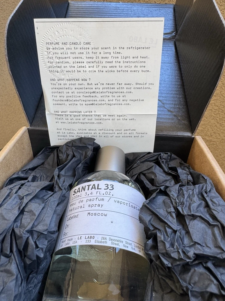Fragrance Name: Santal 33 Size Type: Regular Size Features: All Natural Ingredients, Cruelty-Free/No Animal Testing Type: Eau de Parfum Formulation: Spray Volume: 3.4 fl oz Brand: Le Labo Scent: Sandalwood