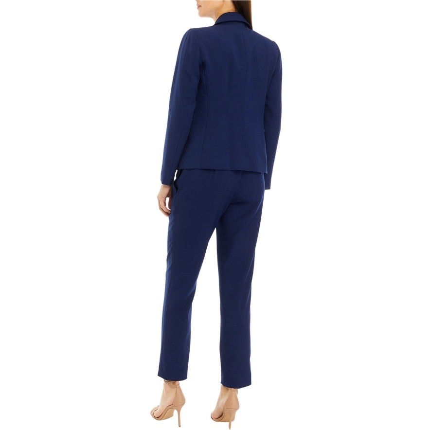 Le Suit Women Indigo Blue Crepe Classic One-Button Blazer Pantsuit Set Size US 4 New with tags MSRP $225 Jacket: Notch collar Single button closure at front Shoulder pads Side welt pockets Lined Length 25" Armpit to armpit 18" Sleeve 23.5" Shoulders 15.5" Regular pants Mid rise Slim leg Zip fly with hook-and-eye closure Side slit pockets Inseam 30.5" Waist flat lay 15.5" Shell: 97% polyester, 3% elastane Lining: 100% polyester Dry clean