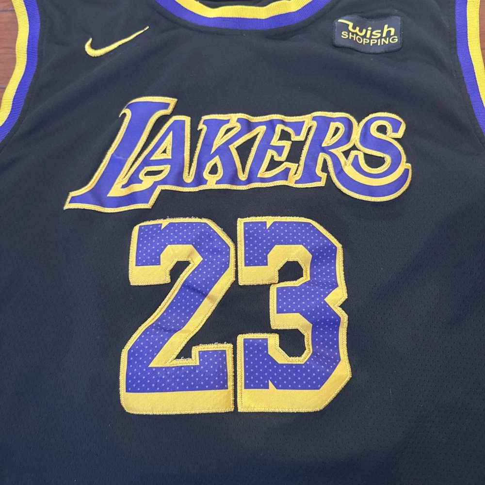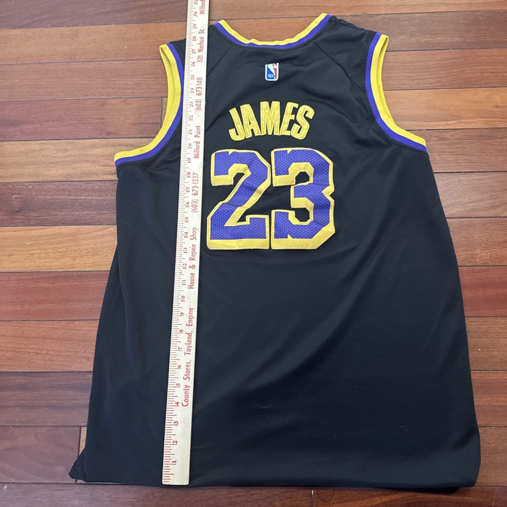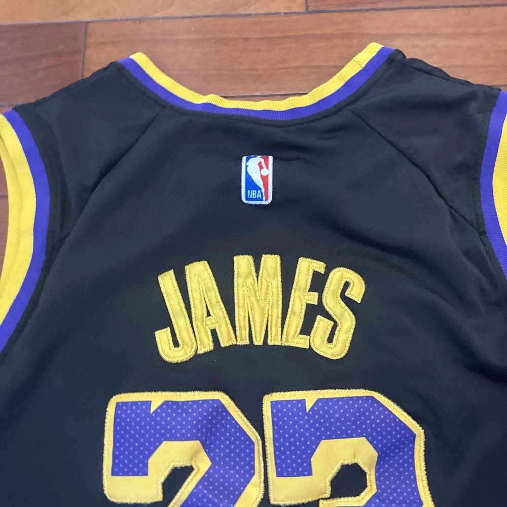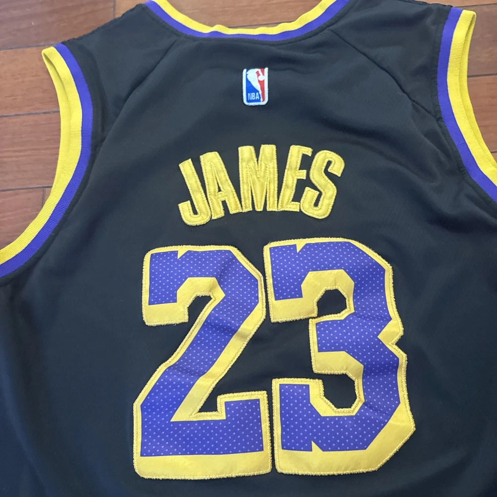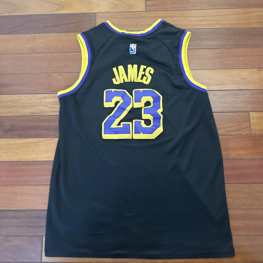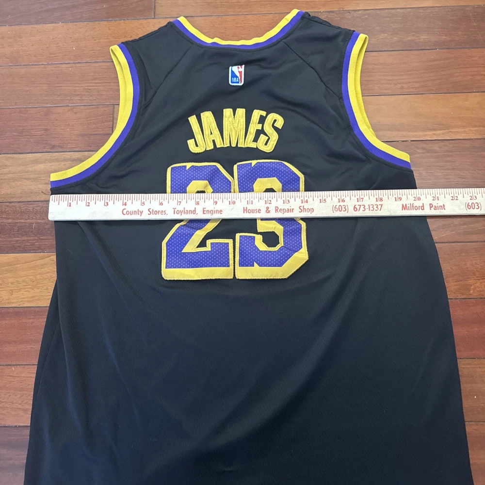The product is a Nike LeBron James black jersey in size Large (54) for the Los Angeles Lakers basketball team. It is an authentic NBA swingman jersey suitable for unisex adults who are fans of LeBron James and the Lakers in the National Basketball Association (NBA).