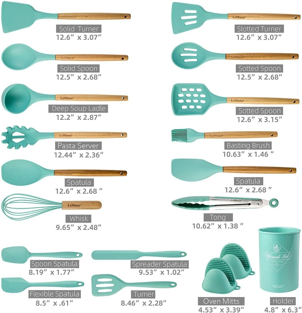 ✅ PROFESSIONAL KITCHEN UTENSIL SET - 18 professional silicone kitchen utensil set will meet all your needs for cooking. Every one of utensils set has its unique use. It would be your great companion in the kitchen. Elevate your kitchen and prepare to savor these unique kitchenware as much as the food itself. ✅ FOOD GRADE SAFE SILICONE - The silicone cooking utensils are made of food grade silicone and BPA free. Food grade silicone can be safely used for cooking any type of food and it won't melt and cause pollution even at high temperatures. ✅ DURABLE WOODEN HANDLE - The wooden ergonomic handle of this silicone utensil set fits the palm of your hand, making it more stable, protects you from being scald and allows you to enjoy cooking for long time without feeling tired. ✅ SOFT SILICONE & HEAT RESISTANT - The soft silicone material can protect your cookware and the non-stick heads makes it easy to clean up. The cooking utensils set can with stand temperatures up to 446°F, Even if they are used in the high temperature environment of frying, you don't have to worry that it will melt when you accidentally leave it in the pot for a while. ✅ CUSTOMER SERVICE - We are committed to providing each customer with the highest standard of customer service. If you have any problem about the silicone cooking utensil set, please feel free to contact our customer service, we're always here for you.