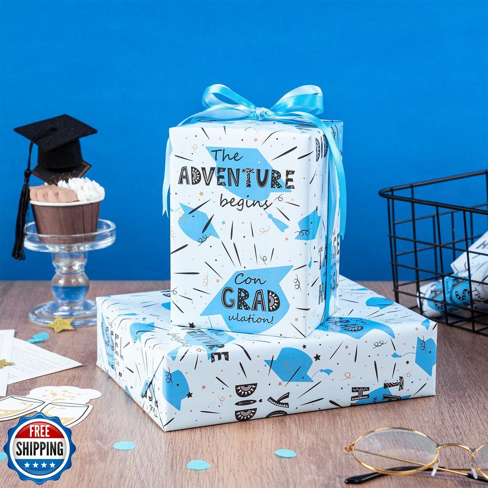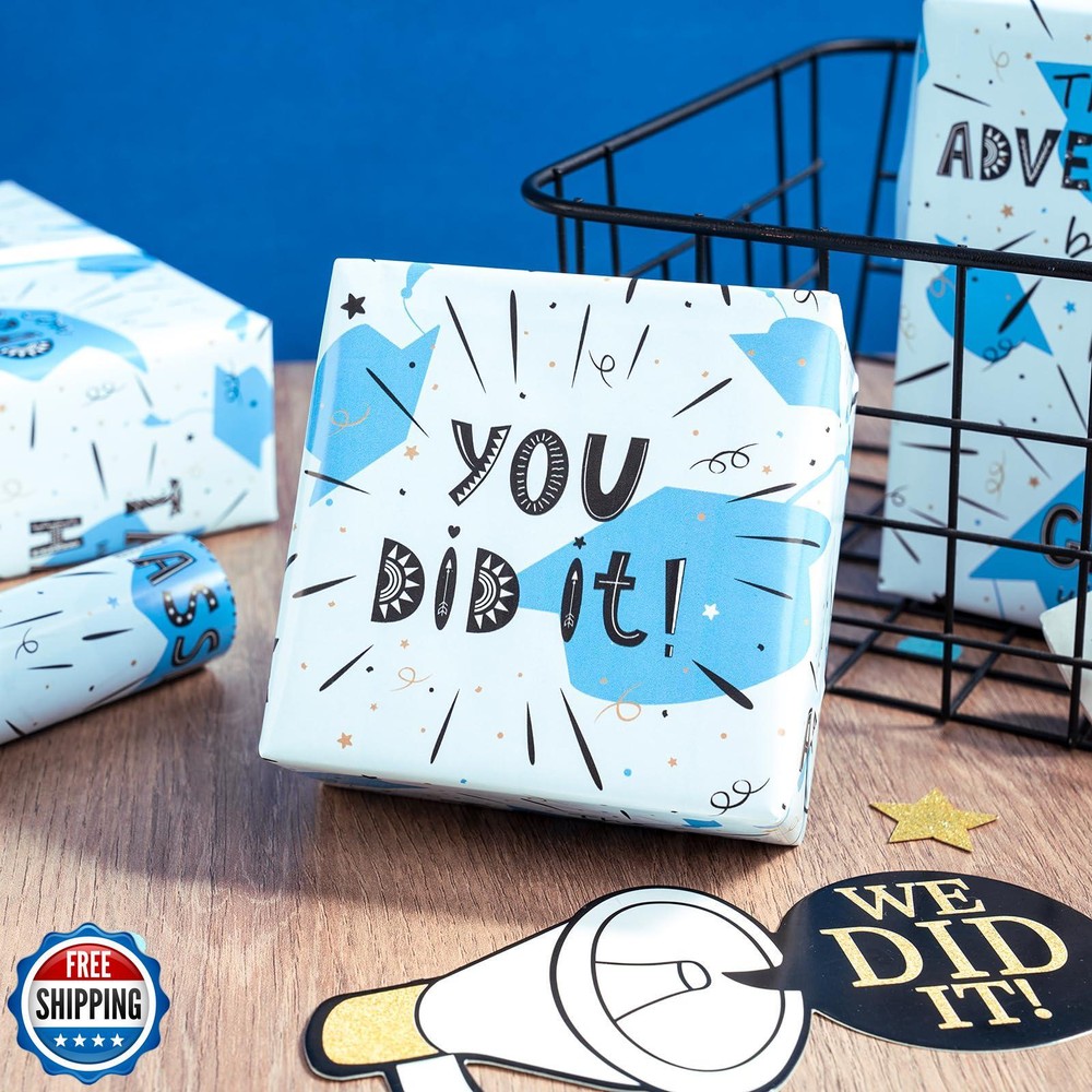 LeZakaa Blue Graduation Wrapping Paper Roll, You Did It!, The Tassel Was Worth The Hassle, Con GRAD ulation and Caps Design, Mini Roll, for Graduation Gifts Wrap, 17 inches x 16.4 Feet Features Celebratory Graduation Wrapping Paper: This cheerful and energetic wrapping paper features exciting phrases like "You Did It!" and "The Tassel Was Worth The Hassle," paired with a playful "Con GRAD ulation!" These motivating statements are set against a backdrop of graduation caps, stars, and confetti. The blue, gold, and black accents create a fun, celebratory feel, making it perfect for wrapping graduation gifts. Mini Roll: Measuring 17 inches wide by 16.4 feet long, this wrapping paper provides 23.2 square feet of coverage—perfect for wrapping several small to medium-sized gifts. Premium Quality: Crafted from high-grade coated paper, this wrapping paper is thick, durable, and tear-resistant. Each roll is carefully wrapped in shrink film to prevent scratches and dust, ensuring it arrives in flawless condition. Perfect for Graduation Celebrations: Ideal for a graduate about to embark on the next exciting chapter of their life. Whether it’s a high school or college graduation, this design perfectly celebrates the achievements and milestones reached. It’s perfect for anyone who’s about to start a new journey, filled with excitement and optimism for the future! Customer Care: We’re committed to your satisfaction. For any questions or concerns, feel free to contact us—your happiness is our priority. Shipping Free & Fast Shipping: We offer free shipping to most of the USA with a normal delivery time of 3-7 days. However, due to the current situation, additional delivery time (up to 3 weeks) may be required for some items. Alternative Carriers: We may use alternative carriers (e.g., USPS, FedEx, UPS) to ensure your package arrives safely and on time. Due to the use of multiple carriers, we are unable to provide a tracking number automatically. Handling Time: Orders are processed and shipped within 1-2 business days of receiving cleared payment. Shipping Restrictions: Shipping to Alaska, Hawaii, Puerto Rico, Guam, and other US territories may incur shipping charges or delivery restrictions. Please contact us before ordering, or your order can be refunded/cancelled. State Restrictions: Certain items may not be shipped to California due to state regulations. Contact for Tracking Updates: If you require tracking updates or have any concerns about the delivery of your order, please feel free to contact us, and we will be happy to assist you. Return Policy 30-Day Hassle-Free Returns: If you are not completely satisfied with your purchase, you can return the item for free within 30 days of receiving it for a full refund or exchange. Easy Return Process: Contact us, and we will provide you with a prepaid return shipping label and detailed instructions. No Restocking Fee: There are no restocking fees for returns. However, the buyer is responsible for return shipping costs if the return is not due to a seller"s error. Refund Processing: Refunds will be processed within 1 business day of receiving the returned item in its original condition. Feedback Your feedback is extremely important to us. We strive to provide the best products and customer service possible. If you are satisfied with your purchase, please take a moment to leave us a positive review. If you have any concerns or issues with your order, please contact us before leaving negative feedback. We are committed to resolving any problems and ensuring your satisfaction. Contact Us If you have any questions or concerns, please feel free to reach out to our customer support team. You can contact us through the eBay messaging system. We are available Monday to Friday, 9:00 am to 5:00 pm EST, and we will do our best to respond to your inquiry within 24 hours. Thank you for supporting our small family business!