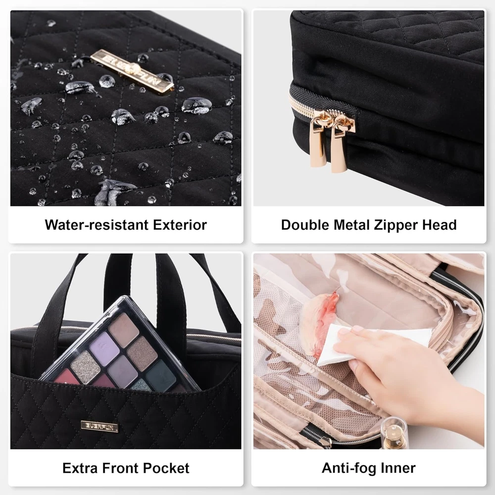 Store New Arrivals Add to Favorite View Feedback Contact Hanging Travel Toiletry Bag for Women Traveling with Leakproof Compartment Makeup Cosmetic Organizer Dopp Kit Travel Accessories Essentials Must Have Description Item model number EF-8011-02 Color Black Product Dimensions 12 x 9 x 4.5 inches Country of Origin China Item Weight 1.17 pounds Department Women Size Large STAY ORGANIZED & EASY ACCESS: This bag features 4 compartments, with multiple pouches designed for cosmetics securely holding small items; Elastic bands keep bottles upright; A front pocket offers additional storage and quick access to makeup essentials. DRY-WET SEPARATION: Independent leak-proof compartments in the first (top) and last compartments respectively, providing excellent protection and enhanced hygiene; Your toothbrush and towel can be stored after use without wetting other items. LARGER CAPACITY & CONVENIENCE: 12 x 9 x 4.5 inches (rolled), ample space for toiletries, makeup, pills, and more; The 360° metal hook enables versatile hanging, saving counter space; Transparent inner provides easy, full-view access to your belongings. UPGRADED MATERIAL: Features a U-shape zipper design with two-way metal closure for swift access; Water-resistant exterior and transparent inner, maintaining fog-free clarity; Reinforced stitching and heavy-duty material for durability and load-bearing. MULTIPURPOSE: EVERFUN's compact toiletry bag is ideal for women, girls, travelers, heavy packers, and makeup lovers; Use it as a portable makeup organizer, bathroom bag, or storage for daily life, travel, gym, weddings, cruises, and outdoors. Product Description The video showcases the product in use. The video guides you through product setup. The video compares multiple products. The video shows the product being unpacked. How durable is its hanging hook? The bag features a heavy-duty polyester construction complemented by a robust 360° metal hook, all designed to ensure maximum durability and reliability. Are its compartments leak-proof and waterproof? Yes, the bag's compartments are designed to be both leak-proof and waterproof. However, zippers aren't fully waterproof. Wring out wet items like towels before storing to prevent seepage. Is its interior easily visible and accessible? Yes, the compartments are totally see-through, and they have these elastic bands that keep everything in its place, making it really easy to find what you need. Are its compartments spacious for full-sized bottles? Yes, it has large capacity with organized compartments, it can fit full-sized products. You can easily put full-size shampoos into one compartment. What are the dimensions and weight of this toiletry bag? The large size measures 12x9x4.5 inches and weighs 1.16 pounds. The medium size is 11x8x4 inches and weighs 1.04 pounds. Both sizes offer larger capacities compared to other products, allowing them to hold more toiletries. ABOUT US We offer the best prices around on high quality products. Our E-store includes media such as books, movies, music and games while offering electronics, toys, sporting apparel, clothing, tools, general home, garden items and more. SHIPPING We are always working hard to ensure your package arrives as soon as possible. Please understand that some factors like weather, high postal traffic, and the performance of shipping companies are outside of our control. We offer free shipping to the lower 48 states and ship within 2 business days of payment, usually sooner. We do not accept P.O. Boxes. Please provide a physical address. For shipping outside of the continental USA, we only use eBay's Global Shipping Program.The item is shipped to KY and then sent to the rest of the world. International customers are responsible for all duties and taxes. Continue to check out in order to calculate costs for shipping the item to your country. Messages regarding eBay's Global Shipping Program MUST be directed at eBay EXCLUSIVELY. RETURNS We offer a 30-Day Return Policy on items which you are not completely satisfied with. You have the option for a full-refund or an exchange of the item. No returns are available on items shipped outside of the USA. PAYMENT We accept PayPal. CONTACT US This page content is yet to come Please ad us to your favorite seller and visit again later Thank You CUSTOMER SATISFACTION We try our very best to make sure every customer is completely satisfied. If there's a problem, message us! We're happy to help. WE ACCEPT Copyright © 2021 AutoDS. | All Rights Reserved