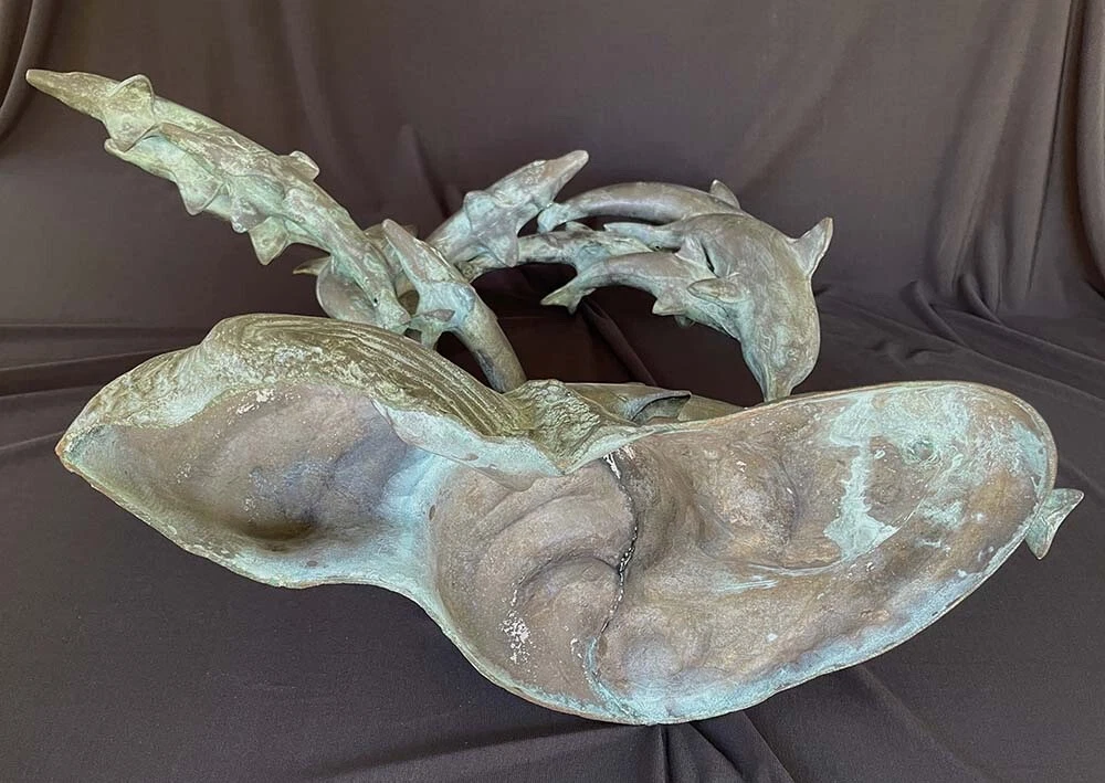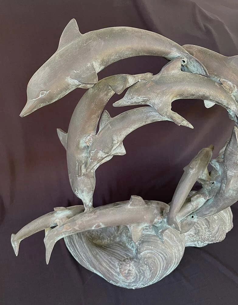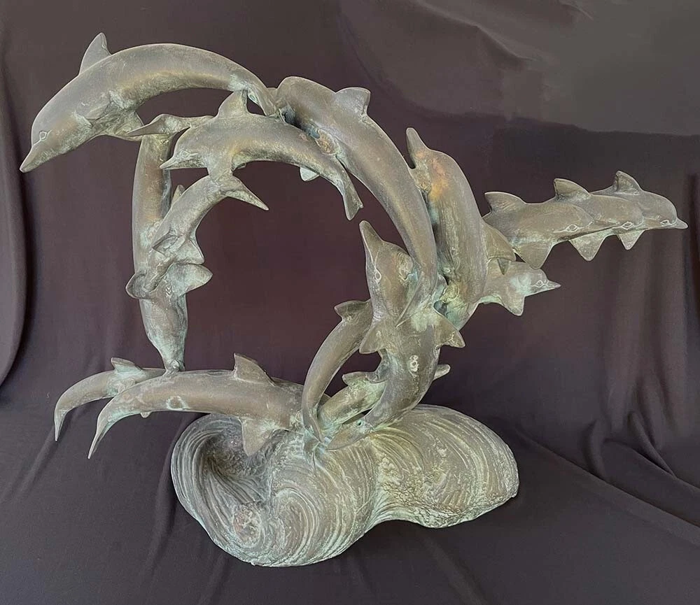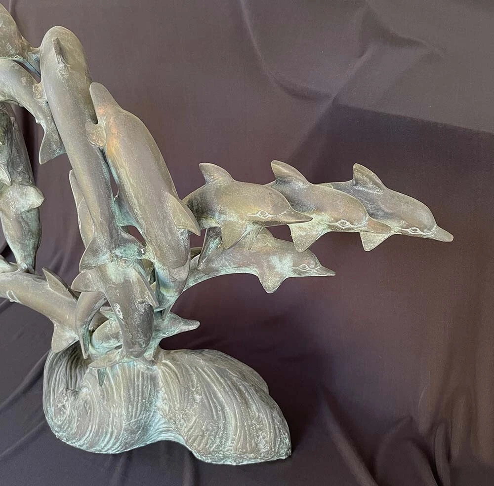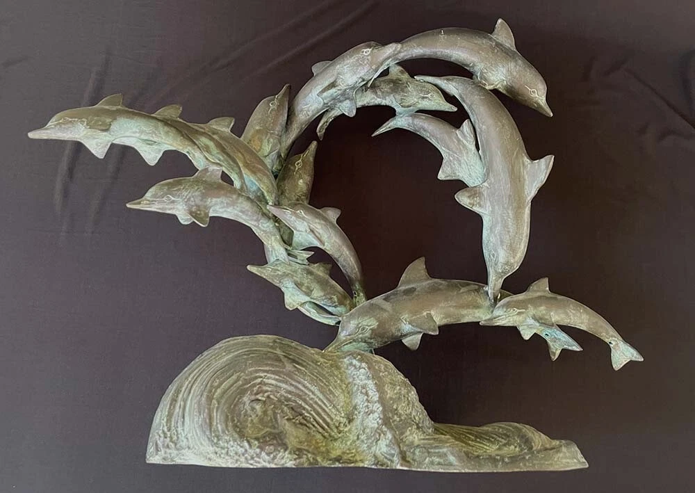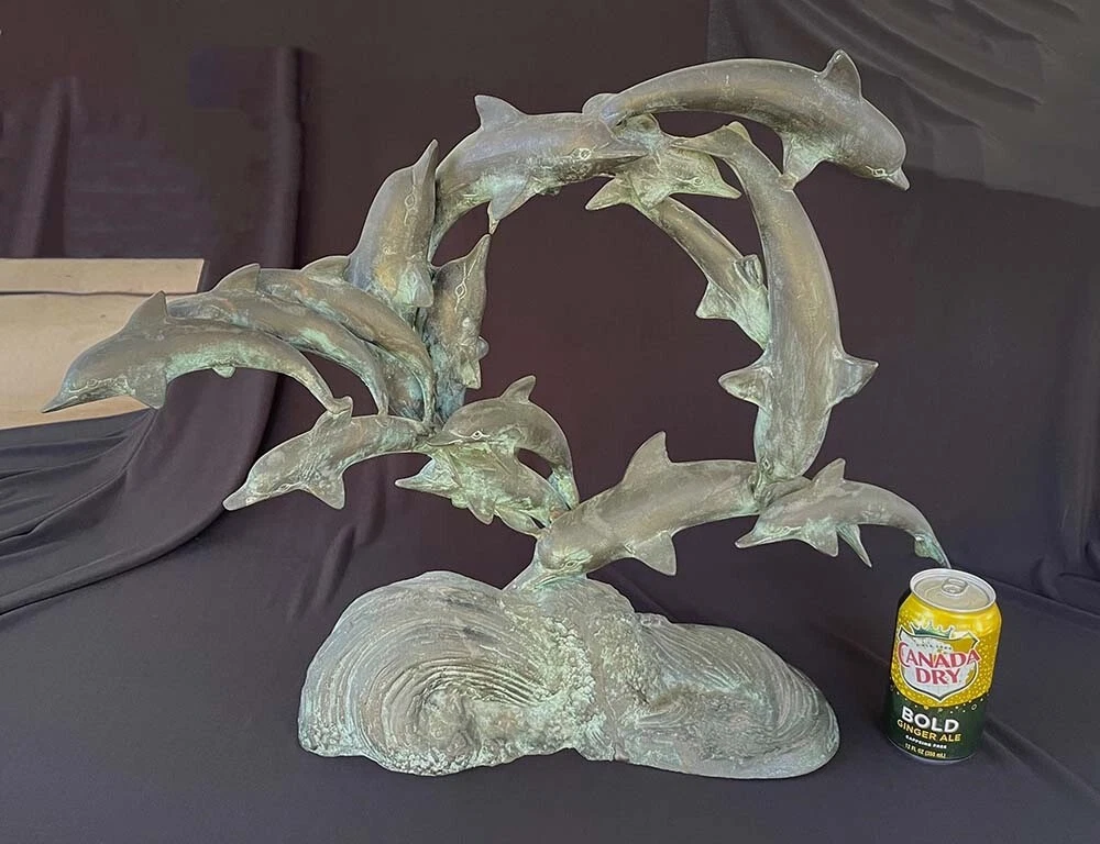 This is a large size stylish 15 dolphins sculpture in verdigris bronze (perhaps mixed metals) color. It measures about 24 inches wide, 19 inches tall and 8 inches deep. It weighs about 16.5 pounds. I do not see any mark or signature but it appears to be very well made. Condition is previously owned and as shown! A can of soda is placed for size reference and not included. Shipping cost is due to the bulking size, expensive shipping and the necessary insurance for your protection. I will probably ship via UPS Ground. * * * Non-smoking environment! * * *