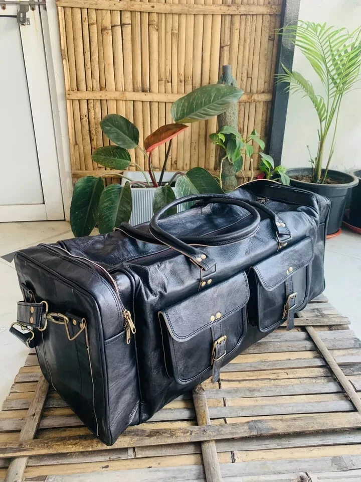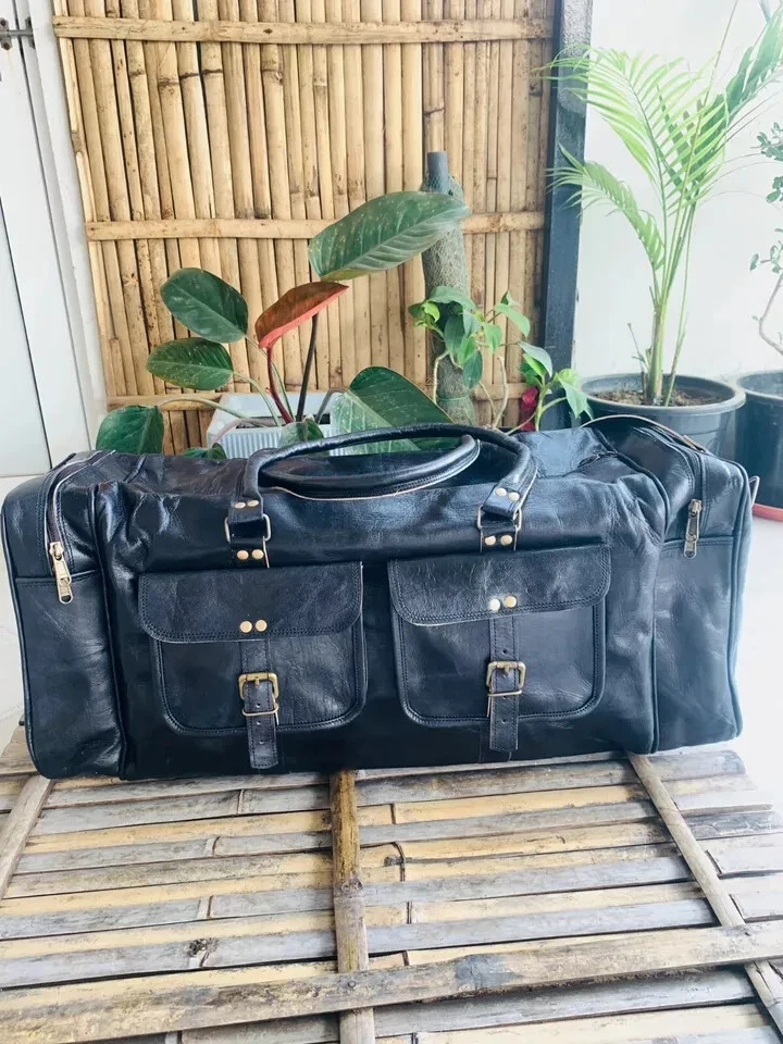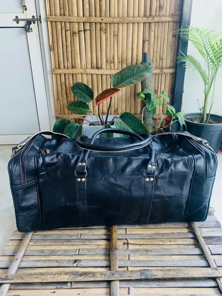 Each bag is individually made using goat leather by experienced crafts people .The bag gets better and better with the time as the leather softens and deep-ens in color. The tonality color of each bag might vary in accordance with the low and high temperatures from the heart of The Thar desert.The leather does not receive any chemical treatment. On the bags a special vegetable oil is applied to give more tonality to the dominant brown (light and dark) color of the bag also making it more resistant to the water.Each bag has its charm and style and a very special earthy smell that will assure you it’s real leather.Its lightness, flexibility and durability will not make you regret your purchase. For Sale Beautiful Genuine Vintage Leather Handmade Duffle Bag FOR TRAVEL,GYM & WEEKEND BAG Features 30X11X11 inch Medium Green canvas fabric 100 % genuine leather with canvas lining,Stylish and light weight For Internal 1 Large compartments Front Have 1 Big Pocket Side 2 Large Pockets With Zipper Made from the finest Hunter Goat leather and lined with high quality canvas this bag is hand crafted by artisans working with leather for decades Rustic Vintage look which makes each bag unique ( just like the person who owns them ) Perfect Accessory or Gifts for all Professionals , students , artists This is perfect to use as a: travel bag for men leather, travel bag for women leather, duffle bag leather, leather gym bag, holdall bag leather, leather bags, leather weekend bag, business leather bag, leather luggage bag, leather crossbody luggage bag, leather gym bag for men Adjustable strap (See the picture for more detail) Strong, light-weight goat leather, tanned without the use of chemicals Leather softens and darkens with use Color and texture of the leather varies Natural real leather smell, just like a luxury car or lounge suite Solid brass buckles and fixtures - will last for years Has a wonderful natural look, and feel Each bag is uniquely individual due to slight color and marking variations on natural leather Payment Using Paypal is the simplest and easiest way to pay, and is the way we prefer, but if you have a reason that you don't want to use Paypal that's OK, we will accept credit card payments and bank deposits, please contact us to arrange these after purchasing. we know that you will want to get your goods sent quickly so please remember to make your payment quickly after purchase, and we will dispatch within one business day after you have made your payment. if you need a bit of time to make your payment, that's also ok, please contact us to advise how long you need, we are happy to hold your goods for up to week before you pay. if you are purchasing from overseas,please be aware that we can only accept Paypal. Shipping · We will shipping the product; depend on purchase date of product. We will ship your product Within 2 Days By USPS/DHL Courier. WE SHIP THIS PRODUCT TO ONLY USA BUYER'S · It's not our responsibility about custom duty of your country. · Kindly check/verify custom charges of your country before purchasing. · We will provide the tracking information the next day of purchasing. · We will not able to shipping Festival holiday and Sunday. · We normally shipped your product, six working days, Monday to Saturday. Terms Of Sale Returns accepted · Customs duties and other duties levies in destination country are responsibility of the customer. · We will exchange the item if returned to us within 30 days of original packing. The item should not be used. · Buyer must inform within Two days after getting the product about any Issues with the Item. Please write to us before returning the item Buyer should contact us within 60 days of receiving the item Refund will be given in refund or replacement on buyer's choice. Return shipping will be paid by the buyer Item must be returned in its original condition Please write to us for any clarification on RETURN POLICY. About Us Namaste........ We are manufacturer and wholesaler of leather goods and specialized in Office Briefcases, Office Bag, College School bags, Travel Bag, Handbags, Purses, Wallets, leather journals and diaries and many more. We use quality leather of Goats and Camel. We offers customize designing and wholesale prices for bulk order. For more details, please write to us. Please contact us via eBay with any questions you have about our products. We normally respond to any questions within one or two working days.