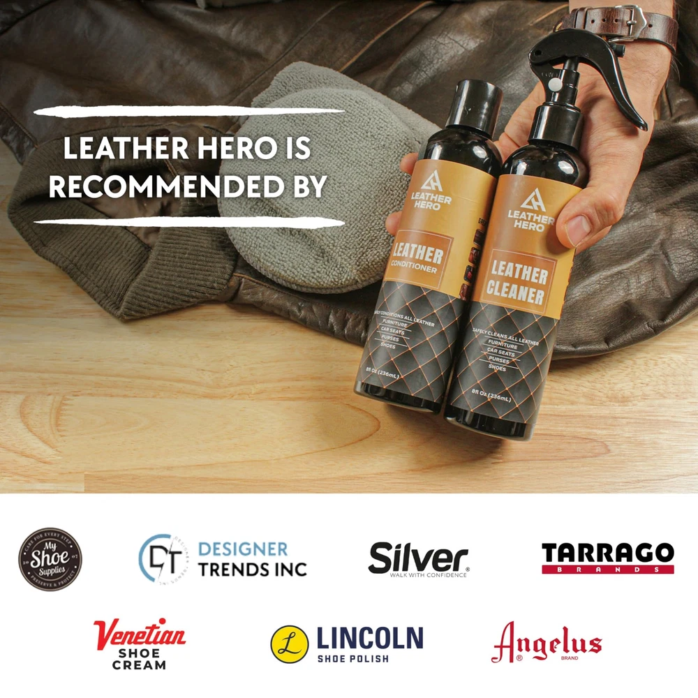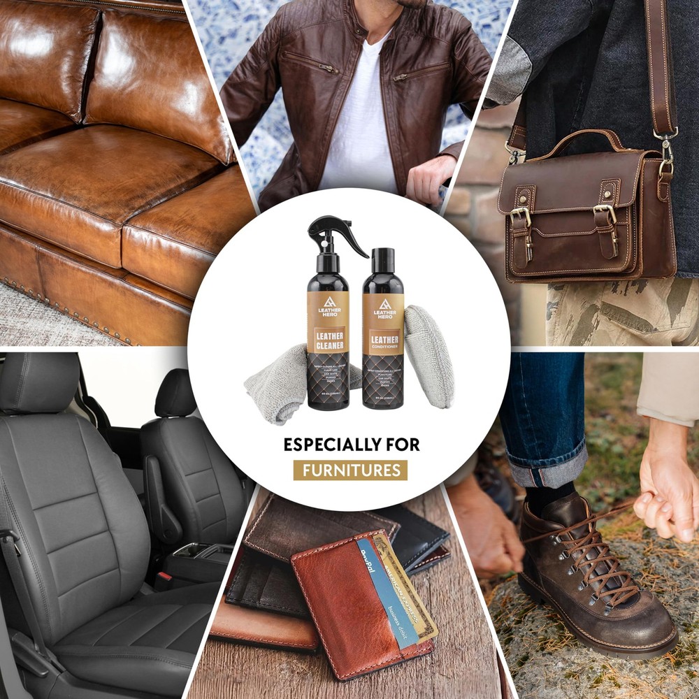 The 8oz Cleaner Spray and 8oz Conditioner Cream kit is your ultimate solution for keeping leather furniture, car interiors, couches, boots, and more in pristine condition. This complete leather care kit comes with everything you need: a powerful leather cleaner to remove dirt and grime, a premium conditioner cream to restore softness and shine, and a microfiber applicator with a premium cloth to ensure smooth, even application every time. Whether you're looking to clean and condition a leather couch, protect your car seats from cracking, or restore the look of your favorite boots, this kit is designed to meet all your leather care needs. The cleaner effectively lifts dirt while the conditioner nourishes and protects leather from drying out, cracking, or fading. Safe to use on all leather types, it’s perfect for maintaining leather furniture, car interiors, and even delicate items like handbags and shoes. Keep your leather looking fresh, vibrant, and long-lasting with the care kit. This kit is easy to use and provides professional-quality results. The 5" microfiber applicator allows for precise application, and the included cloth ensures a smooth finish. Whether you need to restore a leather sofa, rejuvenate cowboy boots, or give your leather chairs a quick touch-up, has you covered. Complete Leather Cleaner and Conditioner Kit: Includes 8oz leather cleaner, 8oz leather conditioner, a premium applicator cloth, and a 12"x12" microfiber cleaning cloth for effortless cleaning and conditioning. Ideal for maintaining leather couches, sofas, chairs, and furniture. Gentle and Effective Leather Cleaning Solution: Our leather cleaner removes dirt, grime, and stains while preserving the integrity of your leather. Perfect as a leather couch cleaner, leather sofa cleaner, or for other furniture items. Premium Leather Conditioner for Lasting Protection: Restore softness and shine to your leather with our leather conditioner for furniture. Helps prevent cracks, dryness, and fading, keeping your leather couch, chairs, and sofas looking new. Safe for All Leather and Synthetic Materials: Designed for both natural and synthetic leather, this kit is the best leather cleaner and conditioner for furniture, including couches, chairs, and car seats. Compatible with popular brands like Weiman leather cleaner and conditioner. Premium Microfiber Cloths for Professional Results: The included microfiber cloths ensure streak-free cleaning and even application of the leather conditioner for couches. Achieve professional-grade results every time with this leather furniture cleaner and conditioner kit.