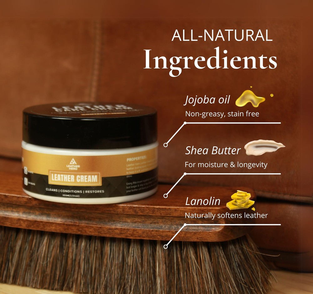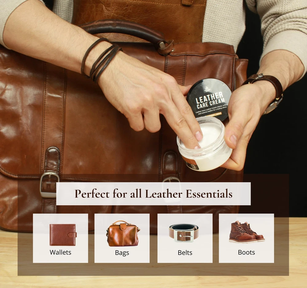 ALL-IN-ONE LEATHER CARE: leather care cream cleans, softens, conditions, and restores all leather types, providing complete care and protection. It will not darken your leather goods. SAFE SKIN-FRIENDLY FORMULA: Our revolutionary formula is made with 100% skincare products, making it the best leather couch cleaner and conditioner on the market. Revive worn-out leather by restoring its natural softness, shine, and color while protecting it from further damage. FAST CLEANING & CONDITIONING: Our leather sofa cleaner and conditioner is a 2-in-1 solution, allowing you to revive saddles, tack, jackets, purses, handbags, car seats, & more without leaving any greasy residue. NON-GREASY & FAST ABSORBING: This leather conditioner balm is quick-drying and non-greasy, leaving your leather surfaces soft and smooth without sticky residue. Its nice and light, and safe on your skin. RESTORE AND PROTECT: with save the day by not only cleaning, but fill your leather with life by blending away scratches and scuffs, conditioning dry leather, and protecting your leather from future damage and wear.
