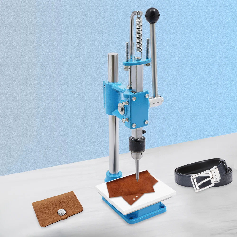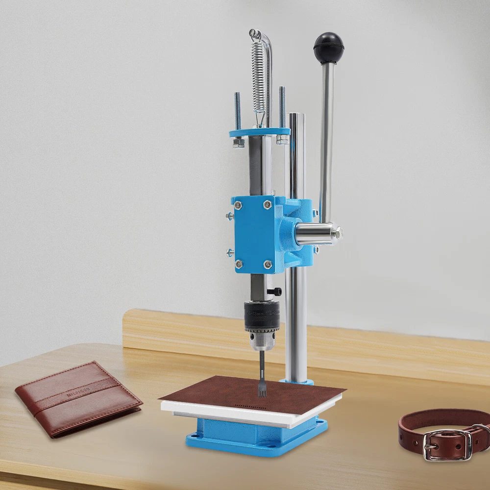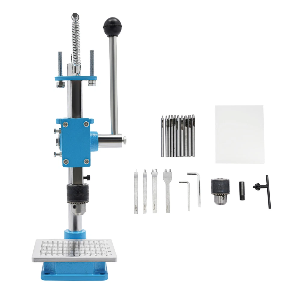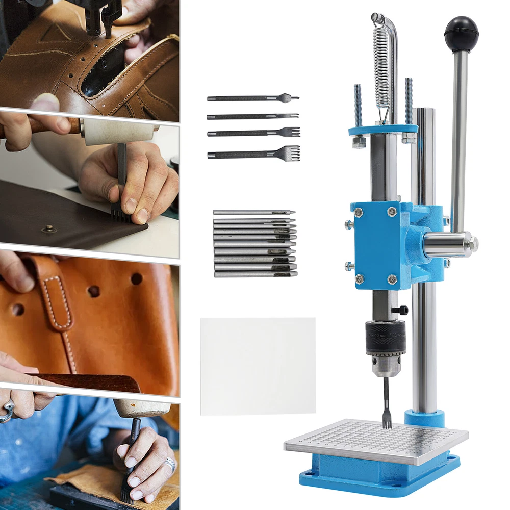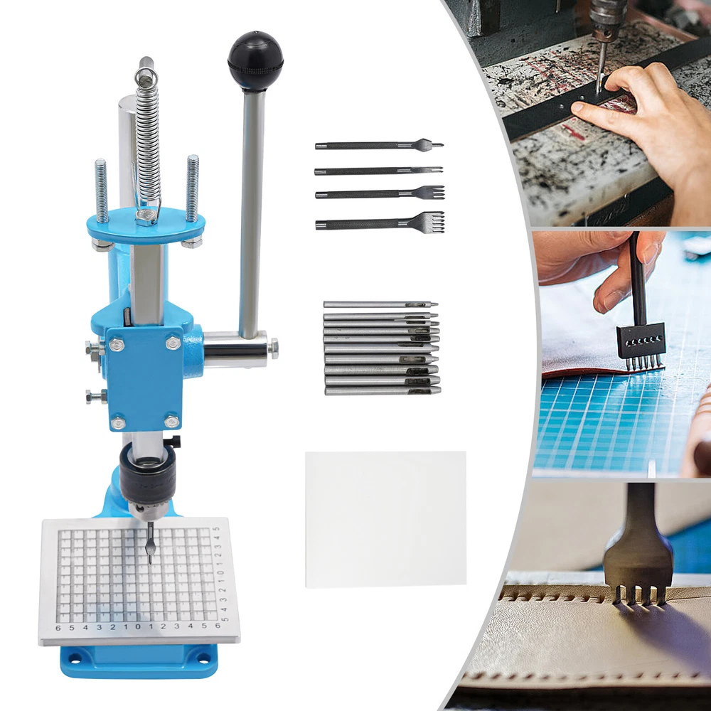 Leather Craft Hole Puncher, Hand Punching Machine, Punch Tools for DIY Leather DESCRIPTION Leather Craft Hole Puncher, Hand Punching Machine, Punch Tools for DIY Leather Craft Description Made of high-quality cast iron and a spray painting process, our drilling machine is customized for craft enthusiasts, leather artisans, and professional studios, making it easy to realize the endless possibilities of your leather creations. With its sturdy construction and smooth punching, it delivers impeccable and professional results for your craft. Whether you are a novice or a veteran, you can master it quickly and enjoy the fun of DIY. Come and take it home! Key Features Build to Last: The product is made of high-quality cast iron material with a spray painting process, with high strength, wear resistance, and long service life. Adjustable Height: You can easily adjust the height (7.87 inches) of the strut by loosening and tightening the screws to meet your usage needs. Low Noise: This product punching can be used instead of a hammer to strike items such as leather (not included), which will make the operation safer and provide you with a relatively quiet working environment without disturbing others. Punching Assistant: With it, you can easily DIY leather crafts at home by punching, piercing, cutting, stamping process and molding stamping, which exercises your hands-on ability. Complete Set : Equipped with 4 prong punches with a pitch of 0.12'' and 8 round punches of different diameters, which can be used with drill chucks (0.06-0.51in) to meet your different process requirements. It comes in a package with all the required accessories, so you don't need to buy additional accessories, thus saving you money and providing you with more convenience. Wide Applications: This product has bearing pressure of 352.74 lbs and embraces many functions such as punching, molding, engraving, cutting, bending, riveting, shaping, extruding, pressing, and DIY manual, which inspires your hands-on ability. Space Saving: It has a small footprint (base size: 5.91*4.72 inches) and can be placed on the desk without delaying the rest of your work. Easy to Clean: Thanks to its smooth surface and simple structure, you can clean the product more easily with a rag or a brush(not included). Excellent Gift: This practical product is a great holiday or housewarming gift for family, friends, and craft enthusiasts so that they can enjoy a more convenient life. Protective Package: To prevent damage to the product due to bumps in transit, we place sponges to protect the product as much as possible. Details Stable Base: The rectangular base(5.91*4.72 in) can keep the product stable during operation, ensuring smoother operation. Scale Plate: It is convenient for you to calibrate the position for more detailed stamping work. PP Plate: It serves as a pad for punching the chopping and punching holes to protect the chopping and punching well. Practical Handle: The ergonomic handle consists of plastic material and labor-saving springs for easy gripping and repeated pressing without fatigue. Fixing Holes: The holes on the bottom are convenient for you to fix this product to the countertop with screws to make it more stable. Application This product can be used in the production of leather goods, including leather bags, belts, leather watch straps, etc. It can also be used to cut soft materials such as hats, jeans, and shoes(not included). It can realize the functions of punching holes, pronging, cutting, stamping process, and forming pressing. How to Install Loosen the screws to adjust the height. Install the drill chuck. Install the hole punch. Tighten the drill chuck. Specifications Color: Blue, Silver Materials: Cast Iron, Plastic Surface Treatment: Spray Painting Assembly Required: Yes Mounting Type: Tabletop Operation Mode: Manual Adjustment Height: 20cm/ 7.87 in Machine Withstand Pressure: ≤160kg/ 352.74 lbs Drill Chuck Clamping Range: 1.5-13mm/0.06-0.51in Chop Spacing: 3mm/ 0.12 in Machine Height: 35cm/ 13.78 in Base Size(L*W): 15* 12cm/5.91*4.72 in Panel Size(W*L): 11*13cm/4.33* 5.12 in Throat Depth: 88mm/ 3.46 in Rack Down Stroke: 50mm/ 1.97 in Panel Hole Centre Distance: 74mm/ 2.91in Rack Diameter: 22mm/ 0.87in Mould Hole Diameter: 12.7mm/ 0.5in Diameter of Blanking Hole: 27mm/ 1.06in Gross Weight: 7kg/15.43lbs Net Weight: 6.5kg/14.33lbs Package Size: 43*23*25cm/16.93*9.05*9.84in Package Included 1*Drilling Machine 1*PP Plate 1*Aluminum Alloy Scale Plate 8*Circular Punches 4* Leather Prong Punches All Accessories for Assembly Notes Please note that leather product is not included. We recommend that you wear protective gloves (not included) for use. Please make sure that the drill bit has been tightened and is in the center position. Please drill slowly to avoid damaging the leather. Please allow the slight color difference caused by the shooting light and 1-3cm error due to manual measurement, and make sure you do not mind before you order. Payment Delivery details Terms of sales About us Contact us Payment We accept ebay payment 。 Fees such as import duties, taxes are not included in the item price or shipping costs. These charges are the buyer's responsibility. Delivery details Shipping: 2-9 working days to: USA Terms of sales We maintain high standards of excellence and strive for hundred percent customer satisfaction. Feedback is very important to us. We hope that you contact us immediately before you give neutral or negative feedback, so that we can address your concerns. It is impossible to address issues if we do not know about them! About us Your satis faction is our ultimate goal. We work hard to earn your trust and future business. Our certified technicians have tested each item before shipping. The unit comes with 1 year limited warranty on all manufacturing defects. a) If you receive a defective item, you may return it or ask for a discount. Please contact us within 14 days after you receive the package. b) What 