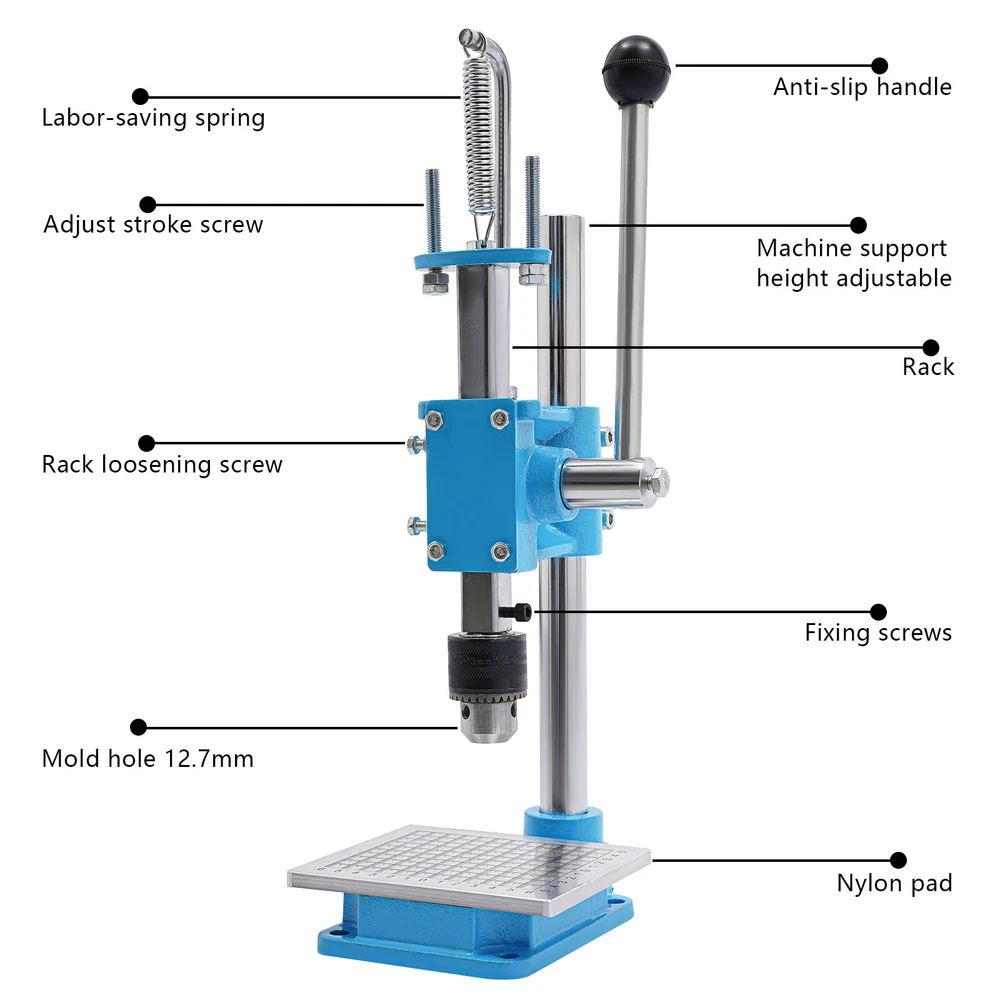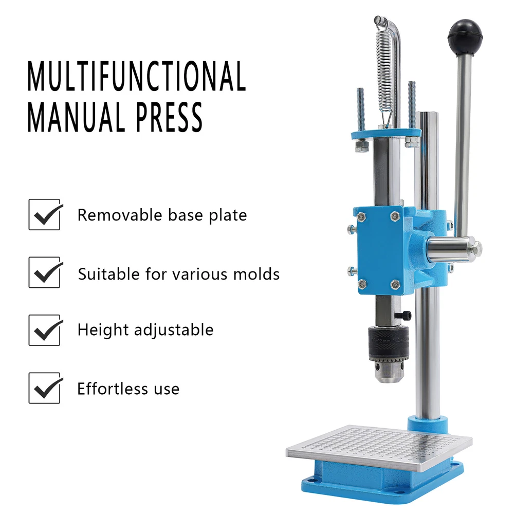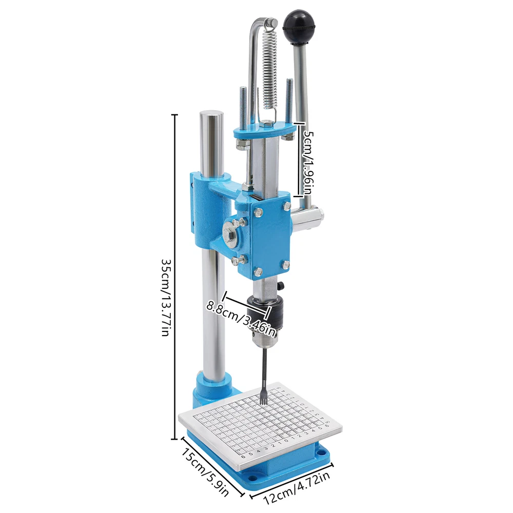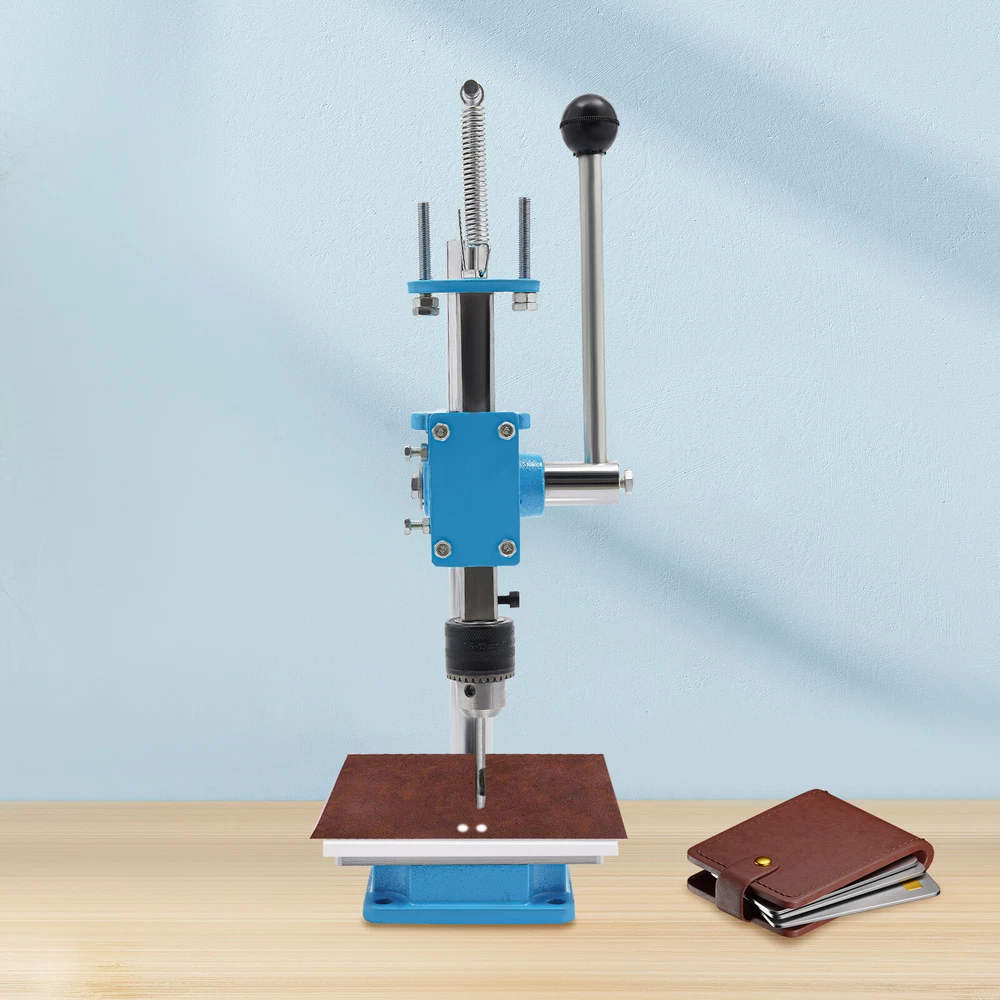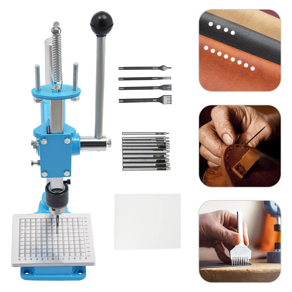 Leather Craft Hole Puncher, Hand Punching Machine, Punch Tools for DIY Leather DESCRIPTION Leather Craft Hole Puncher, Hand Punching Machine, Punch Tools for DIY Leather Craft Description Made of high-quality cast iron and a spray painting process, our drilling machine is customized for craft enthusiasts, leather artisans, and professional studios, making it easy to realize the endless possibilities of your leather creations. With its sturdy construction and smooth punching, it delivers impeccable and professional results for your craft. Whether you are a novice or a veteran, you can master it quickly and enjoy the fun of DIY. Come and take it home! Key Features Build to Last: The product is made of high-quality cast iron material with a spray painting process, with high strength, wear resistance, and long service life. Adjustable Height: You can easily adjust the height (7.87 inches) of the strut by loosening and tightening the screws to meet your usage needs. Low Noise: This product punching can be used instead of a hammer to strike items such as leather (not included), which will make the operation safer and provide you with a relatively quiet working environment without disturbing others. Punching Assistant: With it, you can easily DIY leather crafts at home by punching, piercing, cutting, stamping process and molding stamping, which exercises your hands-on ability. Complete Set : Equipped with 4 prong punches with a pitch of 0.12'' and 8 round punches of different diameters, which can be used with drill chucks (0.06-0.51in) to meet your different process requirements. It comes in a package with all the required accessories, so you don't need to buy additional accessories, thus saving you money and providing you with more convenience. Wide Applications: This product has bearing pressure of 352.74 lbs and embraces many functions such as punching, molding, engraving, cutting, bending, riveting, shaping, extruding, pressing, and DIY manual, which inspires your hands-on ability. Space Saving: It has a small footprint (base size: 5.91*4.72 inches) and can be placed on the desk without delaying the rest of your work. Easy to Clean: Thanks to its smooth surface and simple structure, you can clean the product more easily with a rag or a brush(not included). Excellent Gift: This practical product is a great holiday or housewarming gift for family, friends, and craft enthusiasts so that they can enjoy a more convenient life. Protective Package: To prevent damage to the product due to bumps in transit, we place sponges to protect the product as much as possible. Details Stable Base: The rectangular base(5.91*4.72 in) can keep the product stable during operation, ensuring smoother operation. Scale Plate: It is convenient for you to calibrate the position for more detailed stamping work. PP Plate: It serves as a pad for punching the chopping and punching holes to protect the chopping and punching well. Practical Handle: The ergonomic handle consists of plastic material and labor-saving springs for easy gripping and repeated pressing without fatigue. Fixing Holes: The holes on the bottom are convenient for you to fix this product to the countertop with screws to make it more stable. Application This product can be used in the production of leather goods, including leather bags, belts, leather watch straps, etc. It can also be used to cut soft materials such as hats, jeans, and shoes(not included). It can realize the functions of punching holes, pronging, cutting, stamping process, and forming pressing. How to Install Loosen the screws to adjust the height. Install the drill chuck. Install the hole punch. Tighten the drill chuck. Specifications Color: Blue, Silver Materials: Cast Iron, Plastic Surface Treatment: Spray Painting Assembly Required: Yes Mounting Type: Tabletop Operation Mode: Manual Adjustment Height: 20cm/ 7.87 in Machine Withstand Pressure: ≤160kg/ 352.74 lbs Drill Chuck Clamping Range: 1.5-13mm/0.06-0.51in Chop Spacing: 3mm/ 0.12 in Machine Height: 35cm/ 13.78 in Base Size(L*W): 15* 12cm/5.91*4.72 in Panel Size(W*L): 11*13cm/4.33* 5.12 in Throat Depth: 88mm/ 3.46 in Rack Down Stroke: 50mm/ 1.97 in Panel Hole Centre Distance: 74mm/ 2.91in Rack Diameter: 22mm/ 0.87in Mould Hole Diameter: 12.7mm/ 0.5in Diameter of Blanking Hole: 27mm/ 1.06in Gross Weight: 7kg/15.43lbs Net Weight: 6.5kg/14.33lbs Package Size: 43*23*25cm/16.93*9.05*9.84in Package Included 1*Drilling Machine 1*PP Plate 1*Aluminum Alloy Scale Plate 8*Circular Punches 4* Leather Prong Punches All Accessories for Assembly Notes Please note that leather product is not included. We recommend that you wear protective gloves (not included) for use. Please make sure that the drill bit has been tightened and is in the center position. Please drill slowly to avoid damaging the leather. Please allow the slight color difference caused by the shooting light and 1-3cm error due to manual measurement, and make sure you do not mind before you order. Payment Delivery details Terms of sales About us Contact us Payment We accept ebay payment 。 Fees such as import duties, taxes are not included in the item price or shipping costs. These charges are the buyer's responsibility. Delivery details Shipping: 2-9 working days to: USA Terms of sales We maintain high standards of excellence and strive for hundred percent customer satisfaction. Feedback is very important to us. We hope that you contact us immediately before you give neutral or negative feedback, so that we can address your concerns. It is impossible to address issues if we do not know about them! About us Your satis faction is our ultimate goal. We work hard to earn your trust and future business. Our certified technicians have tested each item before shipping. The unit comes with 1 year limited warranty on all manufacturing defects. a) If you receive a defective item, you may return it or ask for a discount. Please contact us within 14 days after you receive the package. b) What 