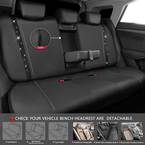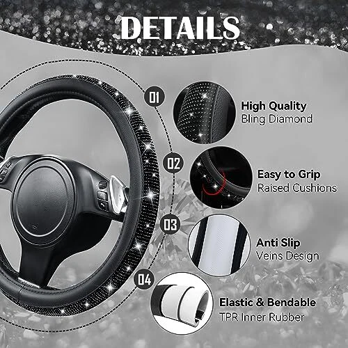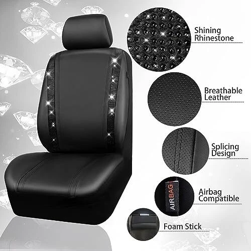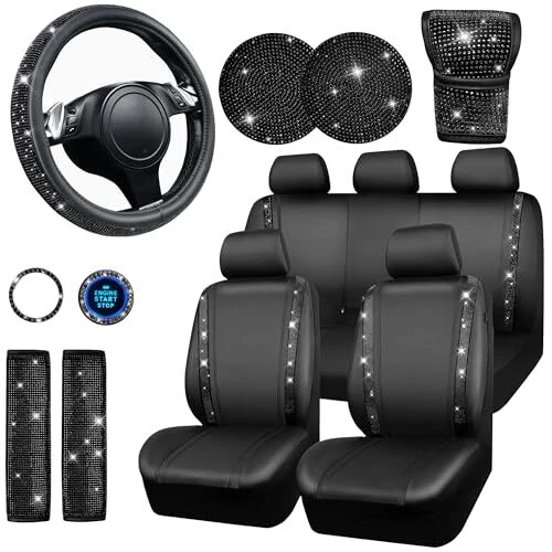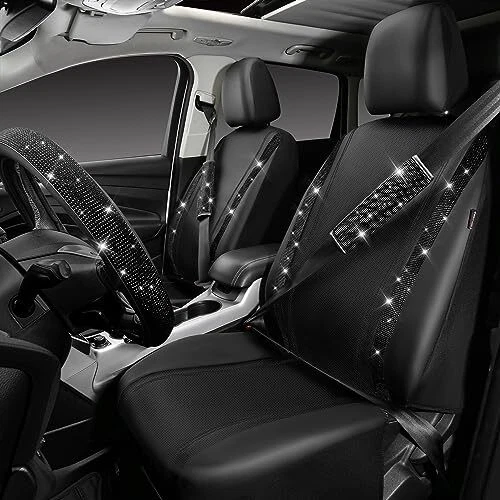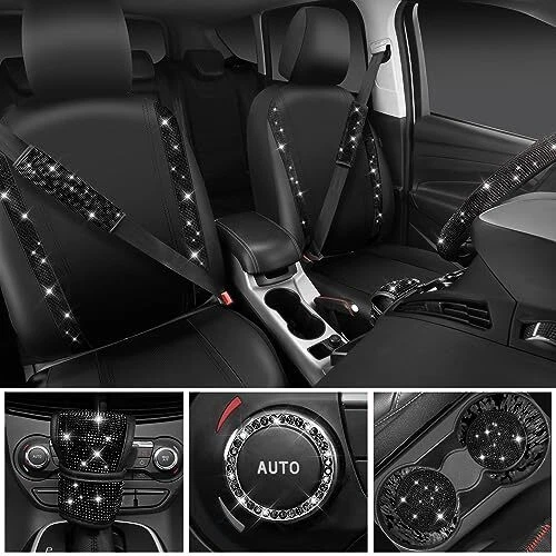 Return Policy Fast Delivery Trusted seller Leather Diamond Bling Seat Covers Full Sets 16 pcs, Bling Car Accessories Set for Women, Sparkly Rhinestone Steering Wheel Cover, Glitter Cute Car Interior Sets for Women Girl, Black Diamond Product Description BLING DIAMOND DESIGN: The bling auto accessories set is designed by real cars and models, and the Bling diamond car kit can perfectly fit 95% of the models on the market. It's the perfect car decoration, perfect for Valentine's Day, birthdays, or a surprise gift for family, friends and colleagues. HIGH-QUALITY MATERIAL: Gorgeous steering wheel flash cover to improve the appearance of steering wheel and interior, diamond seat belt cover to protect your driving safety, two diamond silicone coasters can make the cup holder no longer dirty, diamond Seat Belt Cushion give you a different feel, the full interior will be sparkling and eye-catching in the car. EASY TO INSTALL: Universal sizes Fits most cars. 16 pcs fit most full-size trucks and SUVs, or oversized cars. The Leather diamond front seat cover and rear seat covers made of premium Leather with pretty white rhinestones made. The steering wheel cover can be straightened about 14-15.5 inch in diameter, the coaster diameter is about 2.7 inches, the shoulder straps are about 9.2 x 2.3 inches, the ring is about 1.6 inches, the gear cover is about 5 x 3 inches. SUPER VALUE PACKAGE: Pack includes 16 Pcs: Two front seat covers, back seat covers, Two seat hats, 1 Diamond Steering Wheel Cover, 1 Diamond Gear Cover, 2 Diamond Seat Belt Covers, 1 Bling One Button Start Rings, 2 Diamond Cup Holder Coasters. Simple and fashionable design, diamond decoration. Flashing under the light and through the windshield makes your car unique and charming. EXCELLENT SERVICE: Our Brand is and we offer high quality CAR STEERING WHEEL COVER, Car Floor Mats, Car seat covers, and other car accessories set. We put product quality and your trust first. We do our best to provide you with quality service. Shipping Returns Payment Shipping Shipping is FREE to all addresses other than APO/PO boxes in the lower 48 states. All our stock ships from US-based warehouses. Shipped via USPS or UPS (depending on location and package weight) Unless stated otherwise, all orders will ship within 24-72 hours of your payment being processed. Check our feedback to see the great reviews of FAST shipping we offer. Returns Seller does not accept returns Payment We currently accept payment via eBay managed payments only. Once payment is cleared, we will dispatch your shipment within 1-3 business days. Please refer to the "Shipping" tab for more information regarding shipping speed to your destination.