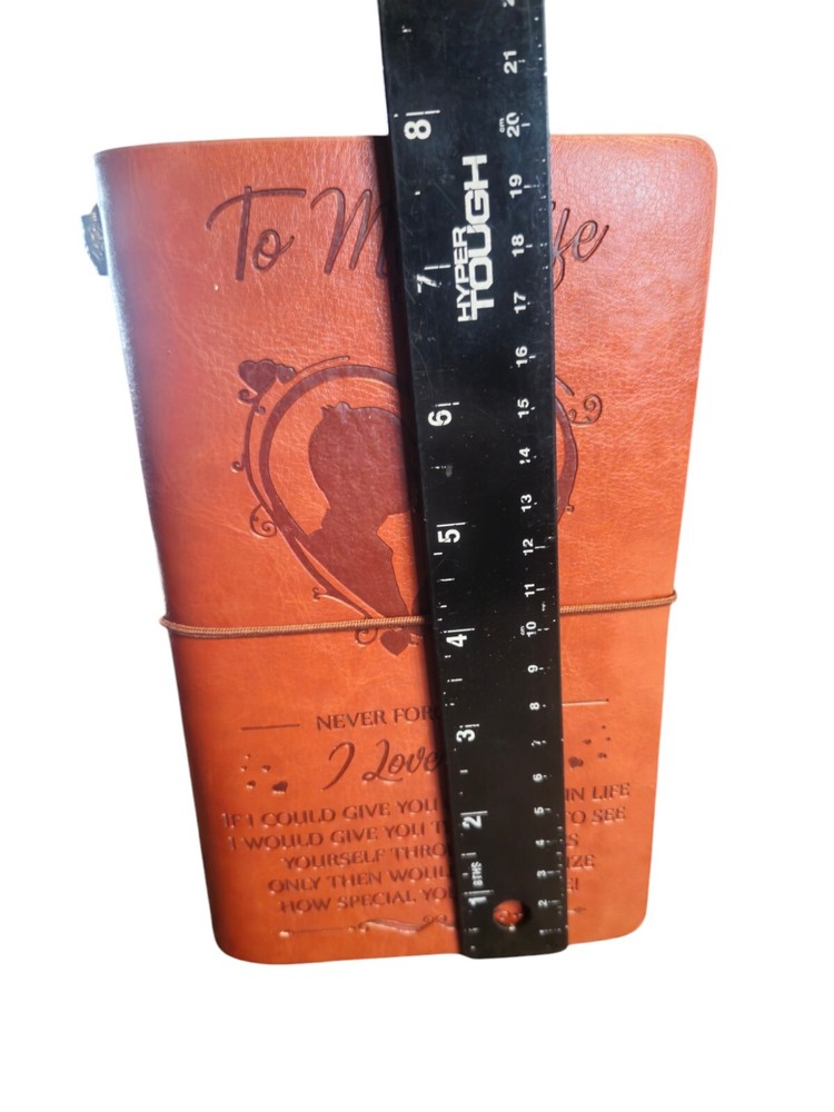 This would make a great gift for a wife from Husband on her Birthday Mothers Day Christmas or Just because she needs to know you Love her! It says... To My Wife Never forget that I Love You If I could give you one thing in life I would give you the ability to see yourself through my eyes only then would you realize how special you are to me! ❤️❤️❤️Two pages were written on with personal items so they were removed. Otherwise in good condition.See all photos of this beauticul item and sentiment. The product is a leather journal notebook designed for a wife, featuring a credit card and coupon holder. Measuring 8 inches by 4.75 inches, it is a thoughtful gift idea for mothers. The leather cover provides a durable and stylish exterior for the journal, making it suitable for daily use or as a special keepsake.