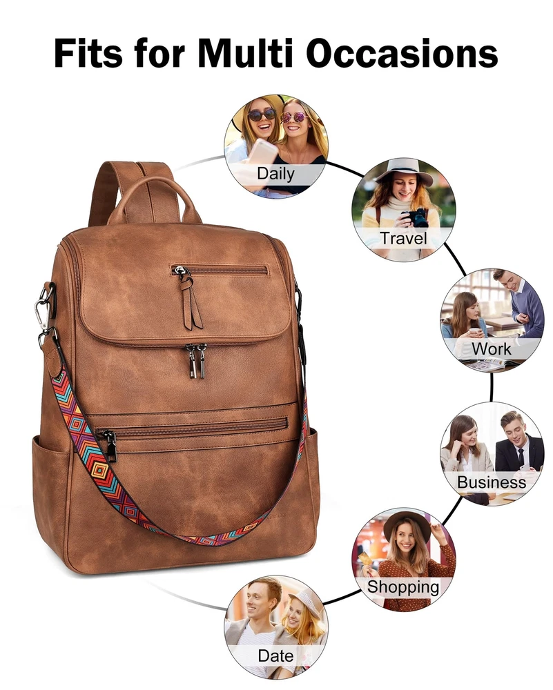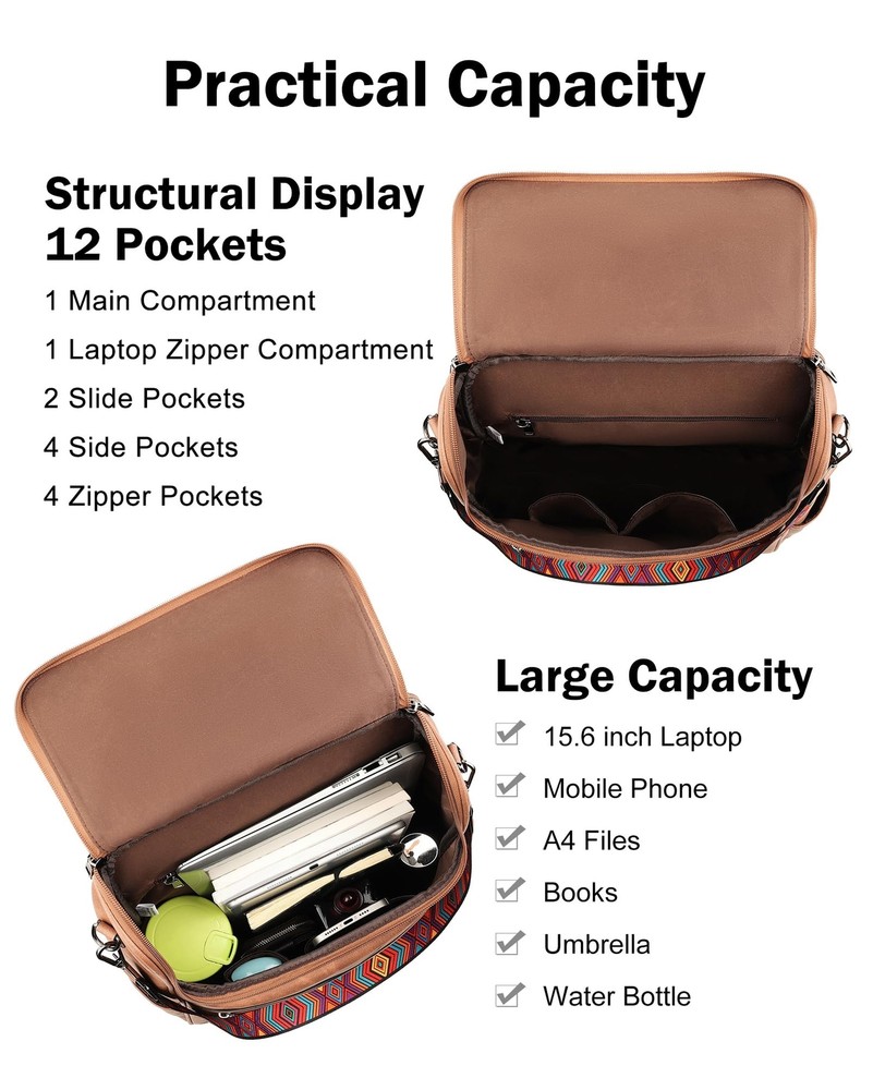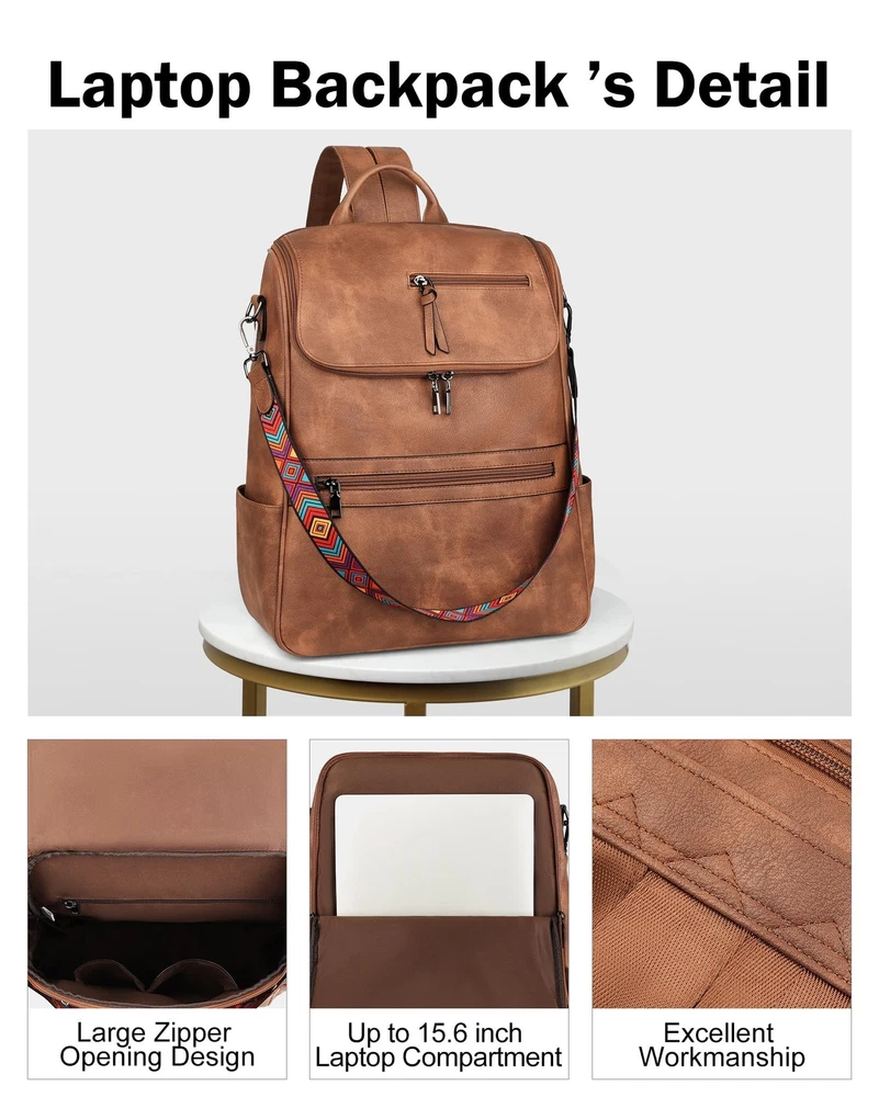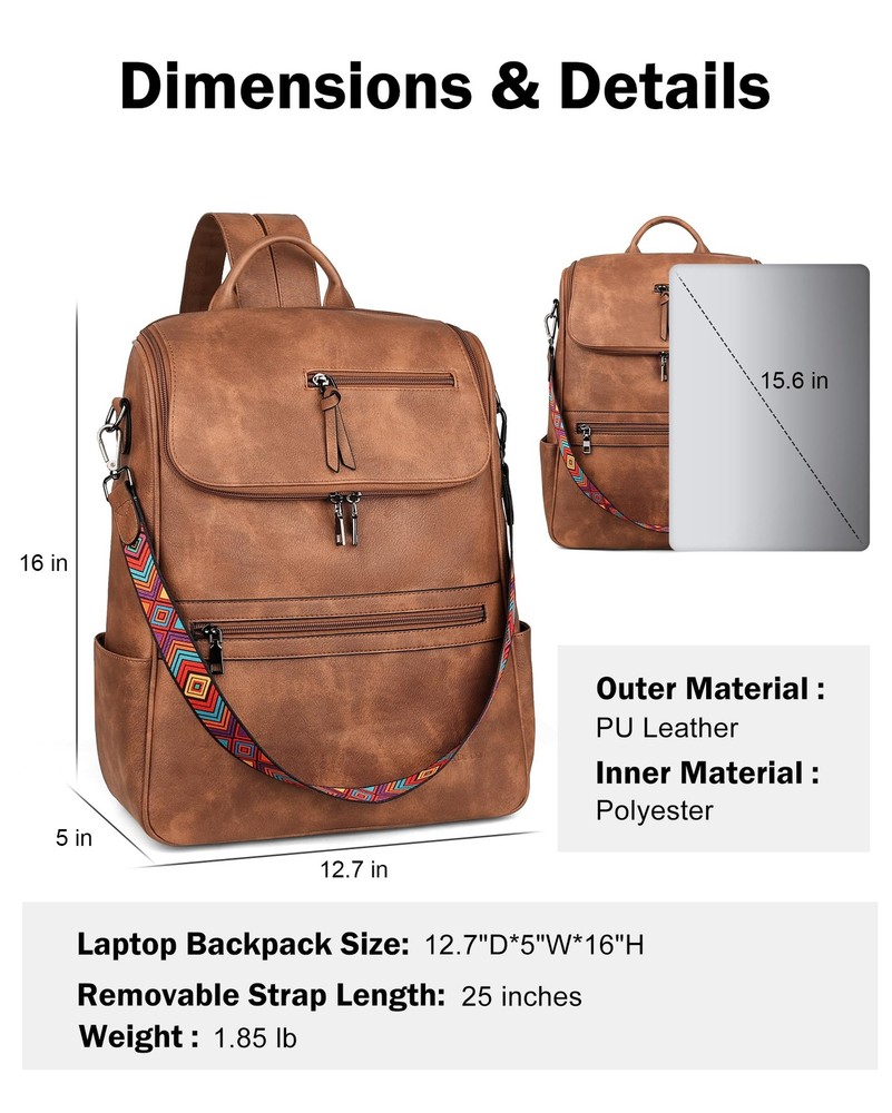 Independent Laptop Compartment: This is a leather laptop backpack that can store laptop less than 15.6 inches. The independent laptop zipper compartment provides better protection for the laptop. The zipper with a large opening at the top is easy to access and store the laptop, making it very convenient to store or take out, without disturbing the storage of other items. Large Capacity Backpack: This computer backpack has a total of 12 pockets, 1 main compartment, 1 laptop zipper compartment, 2 slide pockets, 4 side pockets and 4 zipper pockets. The unique clamshell design not only increases the capacity, but also makes it more convenient to use. The women laptop backpack is roomy spacious and you can carry what you want with you, such as A4 files, iPad, kindle, phone, umbrella, water bottle, cosmetics and everyday items. Size & High Quality Materials: 12.7"W*5"D*16"H, 1.85 lb. This women's leather laptop backpack is made of the latest waterproof PU vegan leather, soft and retro, quality hardware, smooth zipper without sticking, and reinforced design at the connection between the shoulder strap and backpack, making the leather backpack more durable. So this is a sturdy and stylish laptop backpack. Shoulder Backpack: This backpack laptop bag for women with a detachable strap can be converted into a shoulder backpack or handbag to meet the needs of different occasions. So the leather laptop backpack with laptop sleeve suitable for a variety of occasions, such as shopping, work, travel, dating, camping, dancing or hiking, for 2-3 days business trip. Service: All products of are produced by our own factory, and the quality is guaranteed. If you encounter any problems or problems of this laptop backpack, we will have the ability to give you the best solution. you feel free to email us about any product-related problems. So we insist that this womens laptop backpack is a great choice for you or a gift choice for you lover.