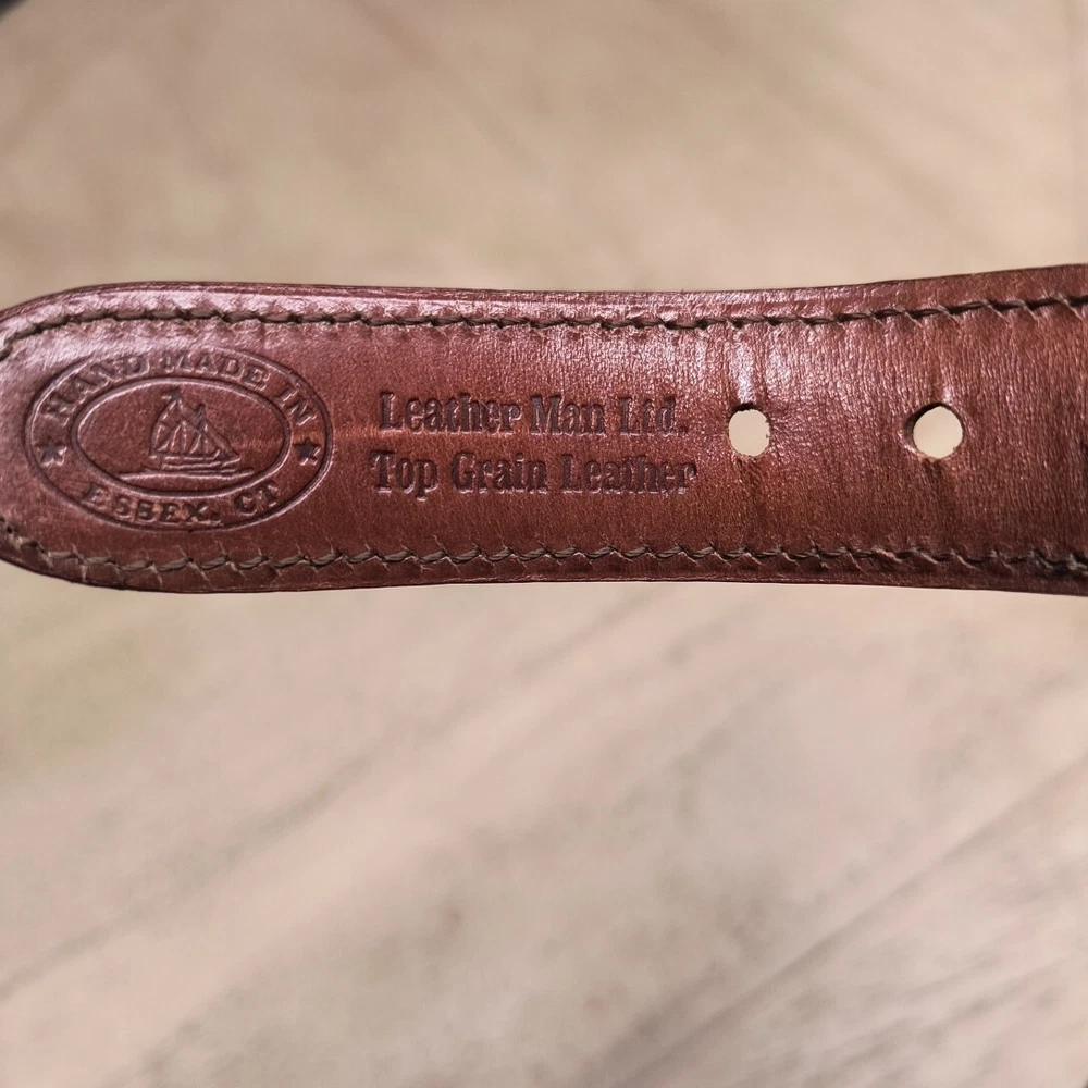 Brand: Leather Man Ltd Style: Casual Belt Theme: Nautical Belt Width: 1.25 Inches Size: 48 Type: Belt Handmade: Yes Accents: Solid Brass Buckle, Top Quality Leather Trim Color: Blue Pattern: Solid Hardware Material: Brass Features: Adjustable, Buckle Department: Men Material: Brass, Cotton, Leather Country/Region of Manufacture: United States Size Type: Regular