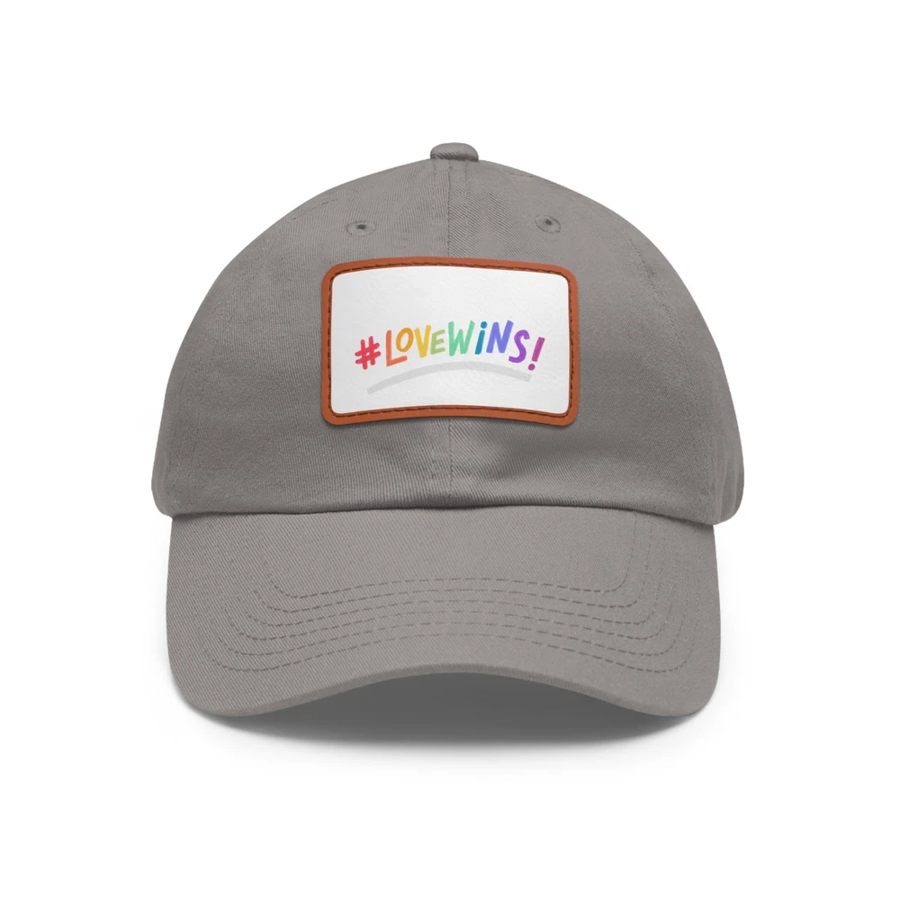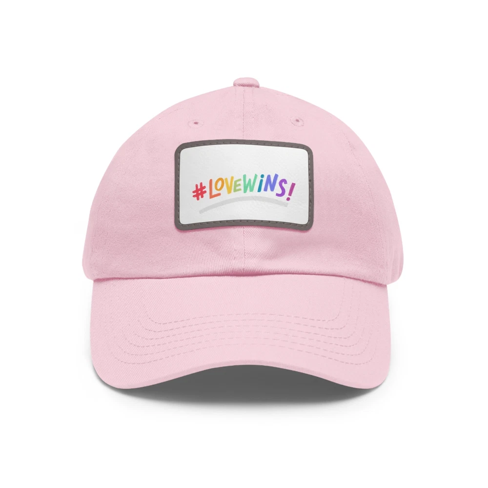 A stylish and modern hat featuring a leather patch with decorative stitching. Perfect for those who want to show pride and love, especially relevant for Valentine's Day. This hat is great for men and women who believe love wins. Product features - Decorative stitching for handmade look - Classy vintage look with buckle closure - Durable chino twill fabric - 100% bio-washed chino twill and faux leather materials - Unstructured and low-profile design Care instructions - Hand wash only.