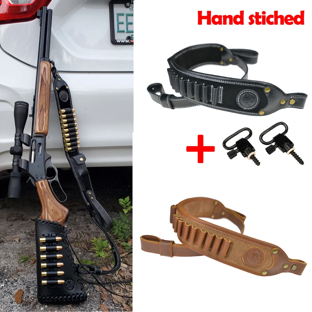 Made of high-quality first layer cow hide and suede leather makes you feel comfortable when carry. The Rifle Shoulder Strap has slots for 9pcs .270.308 .30-06, 22/250,.243, .20 7mm/08, 6.5 Creedmoor 410GA cartridges, come with a littlepocket to put your earplugsand also can hold the cloth for wiping the telescope. Magnetic buttons for easy opening and closing. High-quality hardware and heavy-duty stitching are durable. Both ends of the shoulder strap are 1 inch wide, suitable for most rifle swivels. The Hunting Shotgun Belt is equipped with leather handle. It will be an excellent hunting accessory for your rifle. Check our store to find more products. Adjustment end includes stitched leather keeper loops, adjustable from 33.5" to 41.5".