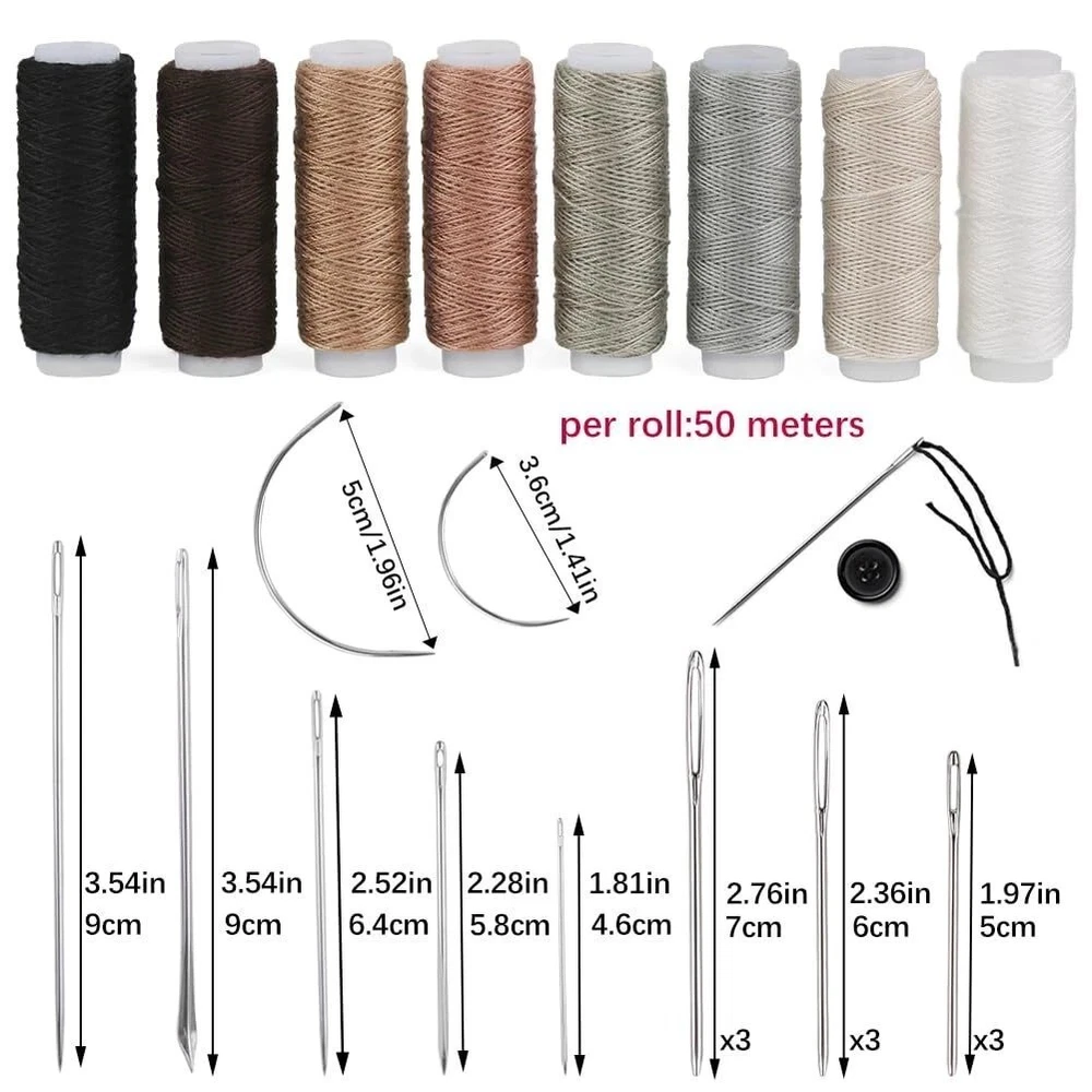 About this item Upholstery Repair Sewing Kit: 8 x upholstery thread cord, 7 x hand sewing needle, 9 x big eye blunt needles, 1 x sewing awl, 1 x hook awl, 1 x inch tape measure, 1 x sewing thimble, 1 x needle bottle, 1 x yarn scissors, 2 x seam rippers. Rich combinations can meet your different needs. Various Sizes of Sewing needles: Our leather tool kit has needles of various sizes and shapes, including blunt needles and pointed needles, triangular pointed needles, and curved needles. The needle is strong and sharp. Easy to Use: Whether you are a professional or a beginner, you will find this repair kit convenient and easy to use. Especially suitable for DIY hand sewing lovers. Wide Application: Our 32-piece upholstery repair kit can be used for car seats, sofas, umbrellas, carpets, interiors, coats, tents, mattresses, fur. You can sew different leather, fabric, denim, canvas, or tarpaulin. Sewing Kit for Handicraft Lovers: Upholstery repair tools suitable for beginner and proficient. And it can be used as a wonderful sewing kit for parents, family, friends, especially for DIY hand stitching lovers. They will be happy with it that you did it for them.