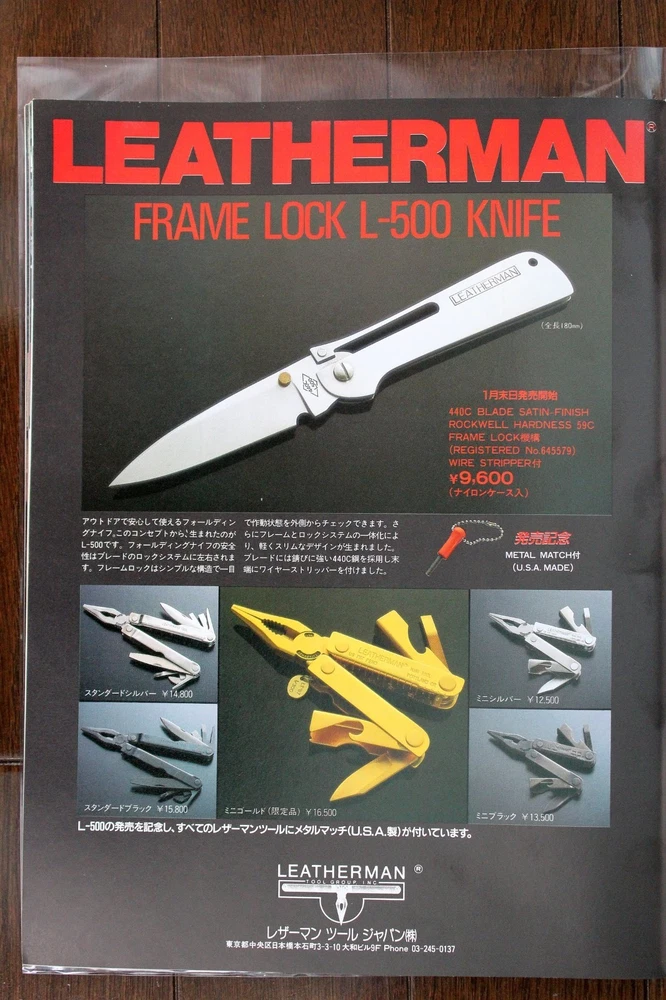 Das Leatherman L-500 Frame Lock ist ein sehr seltenes Klappmesser , das Ende der 1980er Jahre exklusiv für den japanischen Markt hergestellt wurde. Es verfügt über einen stabilen Frame-Lock-Mechanismus und ein minimalistisches, zugleich robustes Design – charakteristisch für die frühen Messerexperimente von Leatherman, bevor das Unternehmen vor allem durch seine Multitools bekannt wurde. Aufgrund der begrenzten Auflage und der Marktexklusivität gilt das L-500 heute als ein äußerst seltenes und begehrtes Sammlerstück . Auf dem letzten Foto ist ein Auszug aus dem japanischen Knife Magazine Nr. 8 vom Februar 1988 mit einer Werbung für dieses Messer zu sehen.
