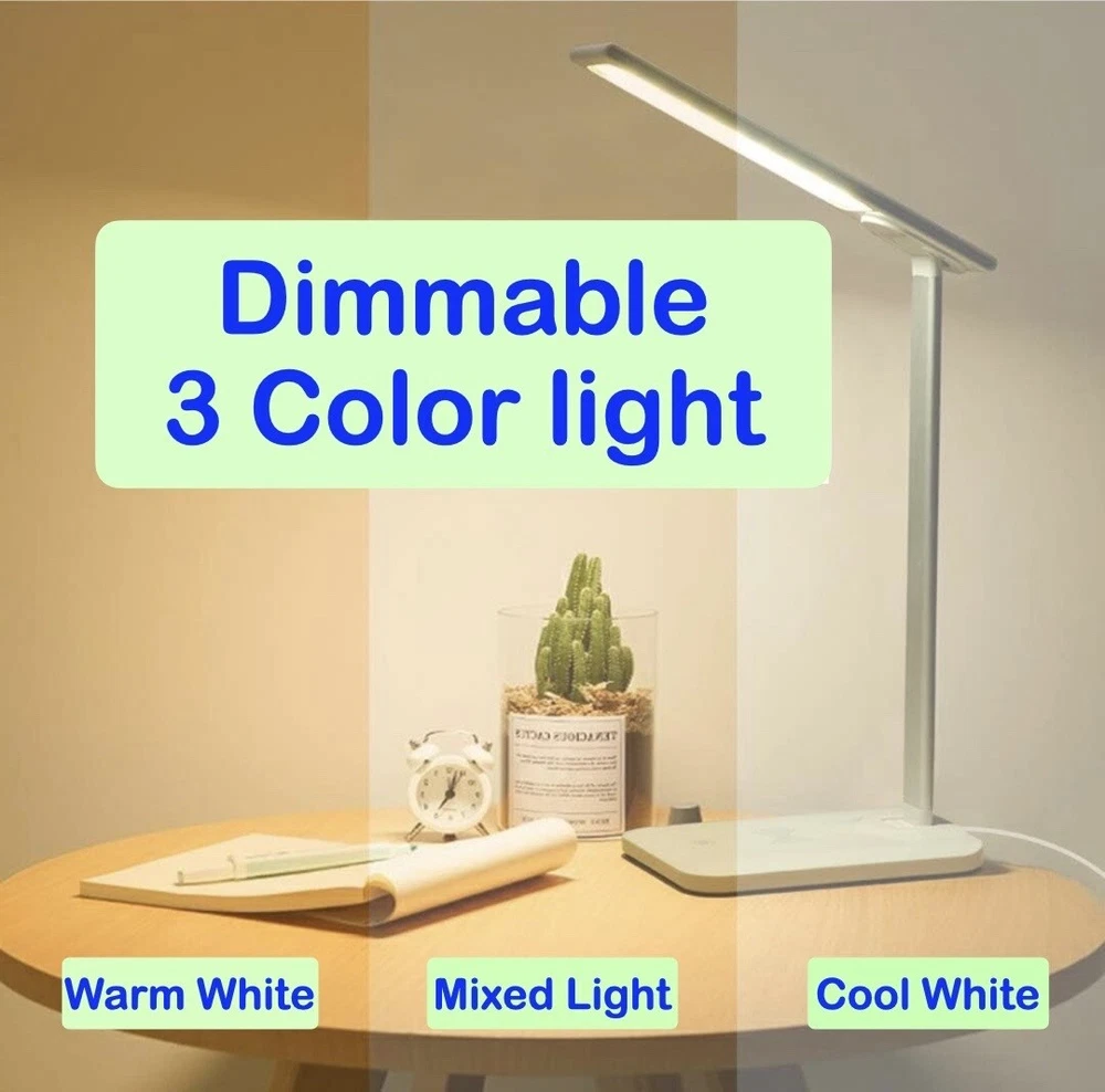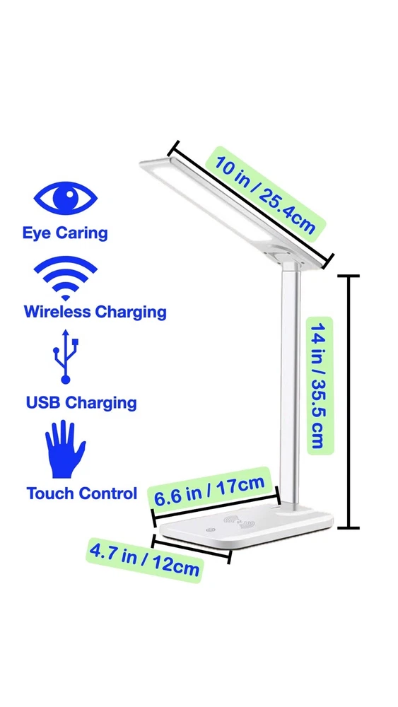Light weight 3 color dimmable eye-caring LED light,compatible with apple and android wireless charging smartphones, it comes with additional USB port, fully adjustable,foldable for easy carrying. Dimmable 3 color lighting modes: white, soft white and mixed.