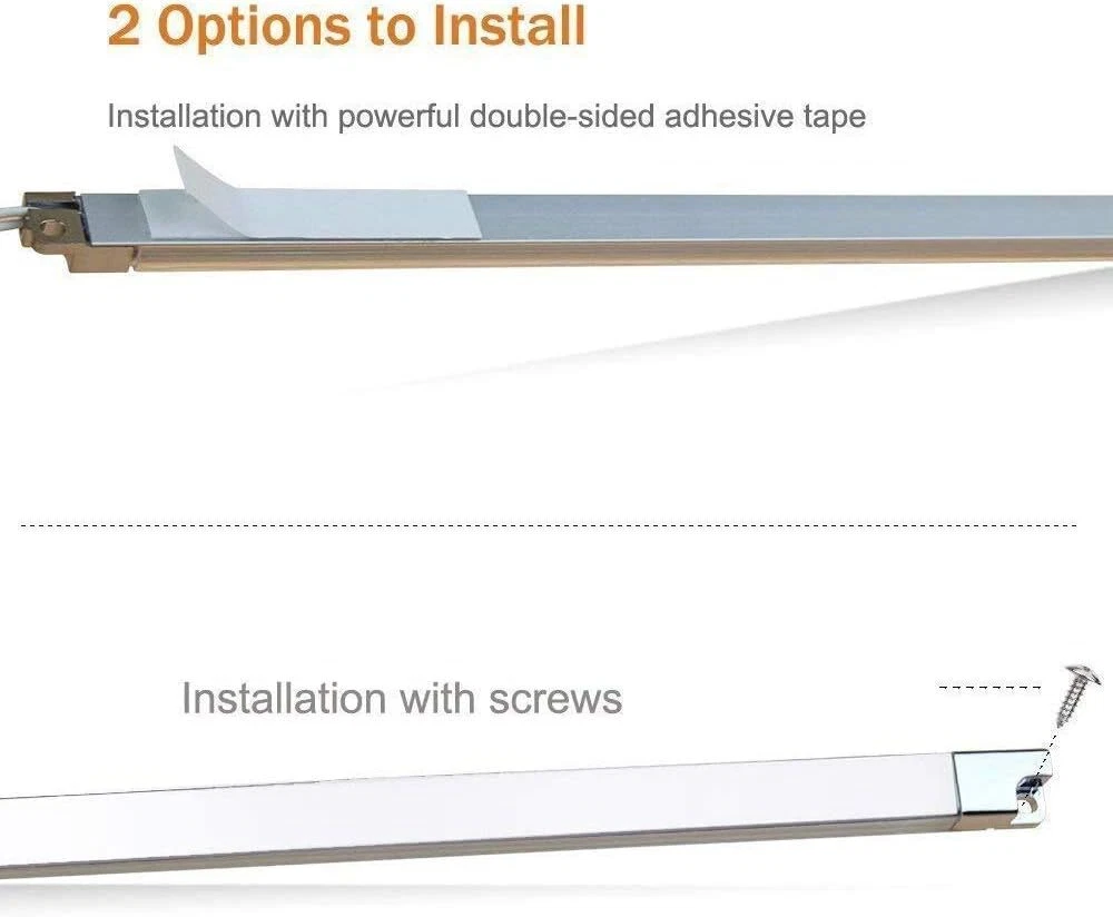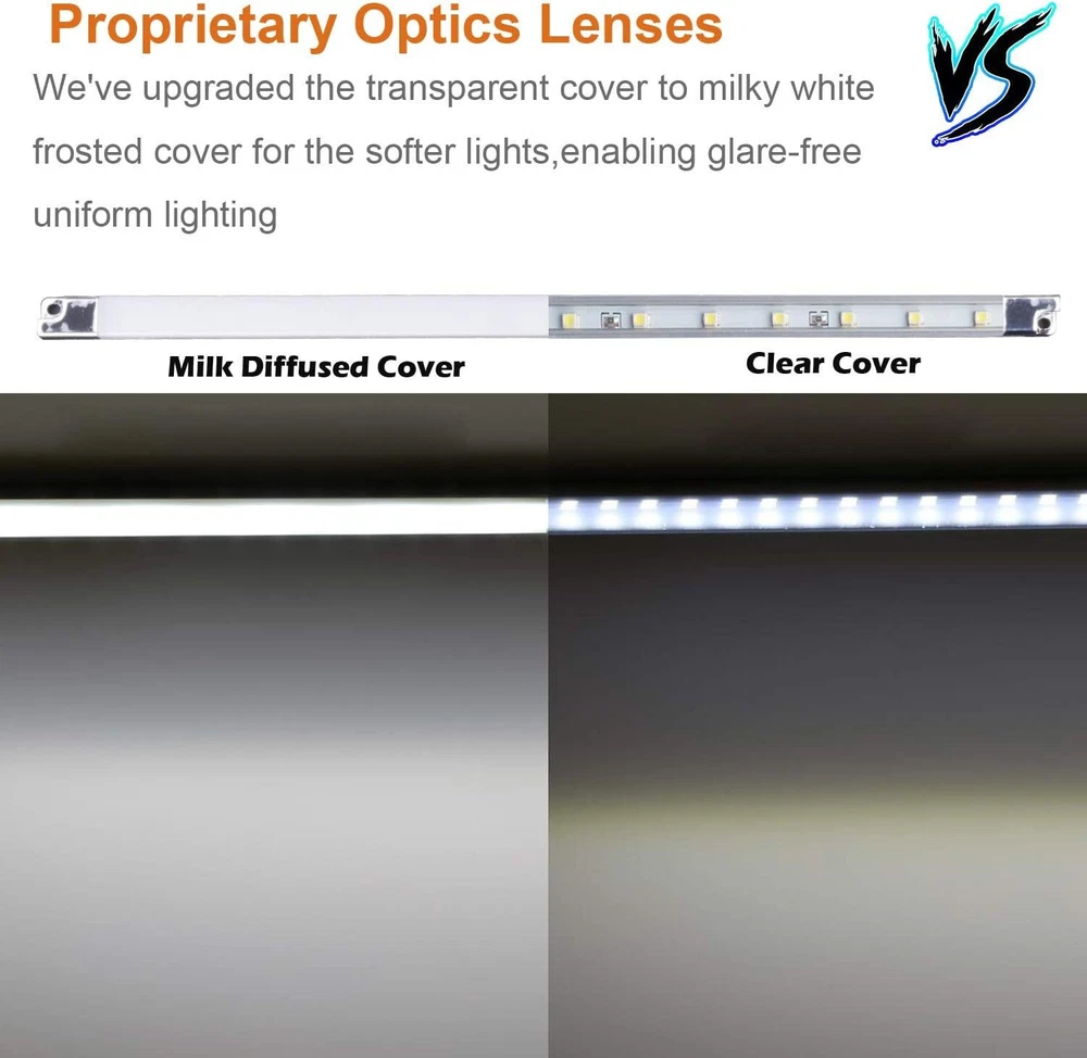 Cool White (6000K) Cabinet Strip Light Bars : Per light bar costs only 1.2 Watt, delivers 100 lumen , which is 400 lumens and 4.8W in total for each kit. Advanced technology: safer, ultra bright, amazing performance.Long life-span and low light decay,Bulb Life 50000.00 Hours Energy Efficient: Saves more than 90% energy when compared with traditional halogen lamp Design Patented, UL,CE certified,1 year warranty With adhesive tape on the back and screws for easy installation,suitable for fitting to all types of under cabinet, book shelves and kitchen cupboards.
