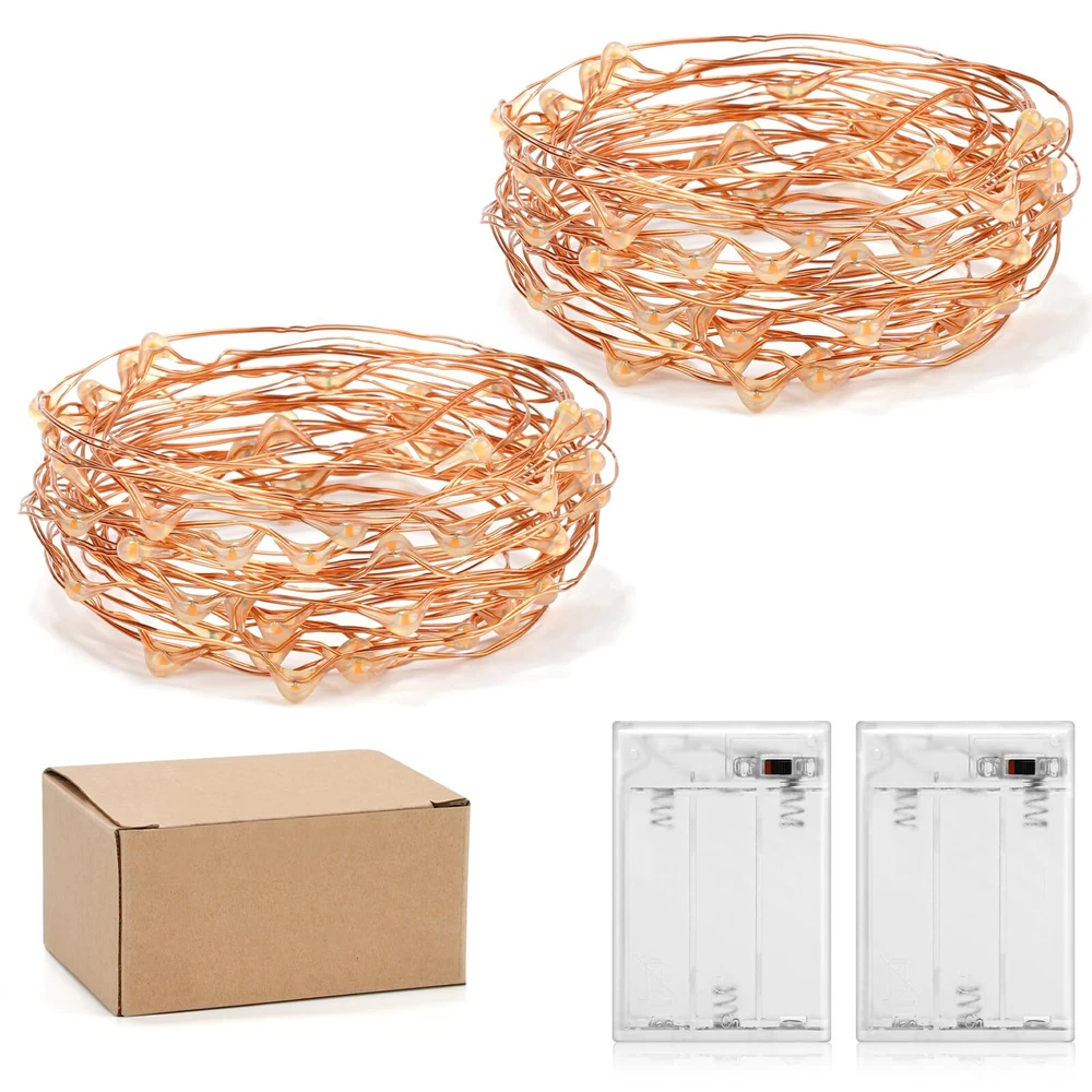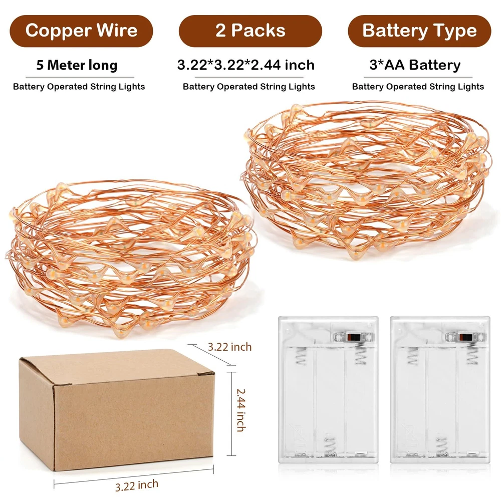 Description: 1.Fairy string lights for wedding season & party decorations. 2.Household embellishment - bedroom, mason jars, fence, patio, garden, tent...feel free to wrap the string lights (copper wire or silver wire) anywhere you like! 3.Hand craft - You can use those LED lights to make shiny wedding dress, or DIY night lights 4. high-quality and easily warp, you can put them in any places, it is also durable. Specification: Material: Copper wire Color: Warm White Length: 16 feet Light wire material: ABS / PVC transparent cable Beam angle: 360° Working temperature: -30°C ~ 80°C Power supply: 3 X AA batteries Package includes: 16 feet Starry Light X 2 Packed well *SUPER BRIGHT 50 LED STRING LIGHTS: These Best 50 LEDs Micro LED Battery Operated String Lights Lamp are perfect for using as a lighting addition to any decorative project. delicate copper wire hosts 50 very small LED bulbs that are about size of the rise grain and are intensely bright. With steady 360 degree viewing angle they illuminate in every direction. *INDOOR STARRY LIGHTS: (No Timer Function) 50 Super Bright Yellow Color LEDs Lights on 16 Ft Long Copper Ultra-Thin Wire with 4 Inches Distance Between LED Bulbs and 12 Inches Clear Cable Between Wire and Battery Box. *EASY TO SHAPE AND MOLD: Newest Clear and Small Battery Box That is Easy to Hide Requires 3 AA Batteries (Not Included). *ENERGY EFFICIENT, NO HEAT PROBLEMS: The ultra slim thin copper wire, Bendable but Sturdy Wire with LED Lights is waterproof. *CAREFREE AFTER-SALES SERVICE:Please be confident to buy fairy lights. Don't like it once received? Just return it by Amazon. We have a professional customer service team, If you have any questions during the use, please feel free to contact us.
