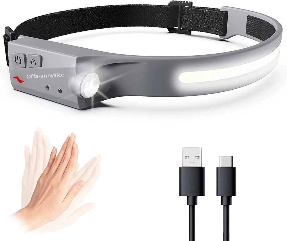 230° Wide Beam & 350 Lumens: Different from the traditional headlamp, our camping headlamps have a 230° lighting range that can reach a distance of 100 square meters around you. With 350 Lumens output that can be clearly seen even from 150ft away, enough to deal with all the darkness. Wave Induction & 5 Lighting Modes: With the side wave induction sensor, you can easily turn on/off the headlamp. and press the power switch to cycle through 5 lighting modes. Rechargeable Headlamp & Long Lasting: Built-in 1200mAh high-capacity battery that can be charged by USB cable(included) up to 8 hours of continuous use. Charging time: within 2.5h fully charged. Lightweight & IPX4 Waterproof: Only 2.4 ounces, the ultralight design will make you forget you're wearing it. Professional IPX4 level waterproof function, no need to worry about rains or snow. Perfect for camping, hiking, cycling, fishing, or car repairing.