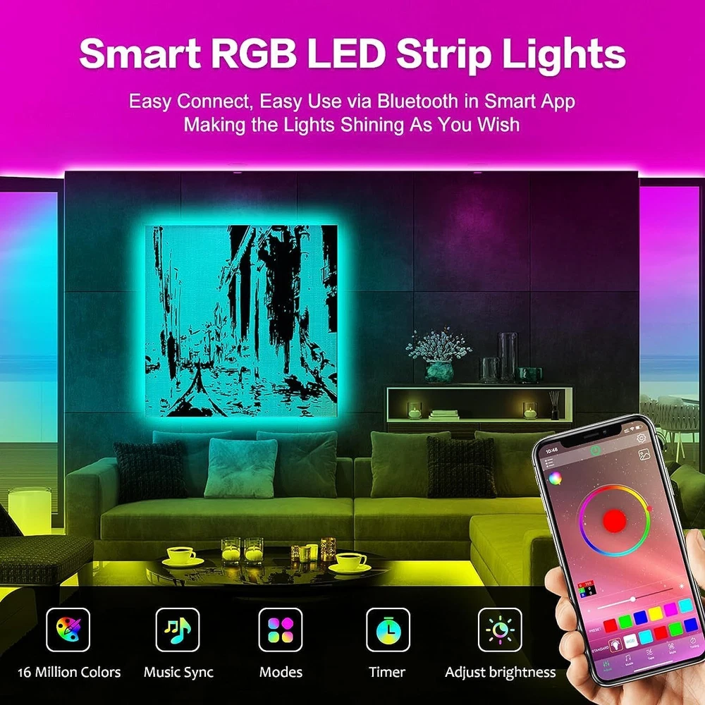 Super Quick and Easy Installation: The LED strip lights come with strong self-adhesive tape and can firmly stick on any clean and smooth surfaces like wooden and lacquer wall. Just follow the instruction on user manual, the whole set will only take several minutes to install. Long 100ft LED Strip: The LED lights for bedroom 100 ft is long enough to reach around your entire room and light up the whole place. You can install the RGB LED strip lights for bedroom, living room, kitchen, bar, gaming room, home theatre, corridor, staircase, etc. Wide Application: Besides everyday use, the RGB LED strip lights can also be used for wedding, anniversary, birthday, engagement, graduation, Christmas, Easter, Halloween, New Year, Thanksgiving, etc. These color changing LED lights can bring you a fantastic visual feast. Music Sync & Mic Mode: The LED strips will change colors and pulsate to the beat of the music on the phone. With a built-in high sensitive Mic, the LED strips will also react to the surrounding sounds detected by the Mic. These modes can produce spectacular light shows and dynamic decors to liven up the parties and holidays. Smart APP Control: The LED lights can be freely controlled via 'Happy Lighting' APP . These LED strip has lots of different modes, such as flashing, quick jumping, fading, etc. You can also create your own lighting effect and DIY with the APP. Timer Settings: The lights can automatically turn on/off at the scheduled time. Such smart LED lights for bedroom can make your room cozy and comfortable before bedtime and wake you up in soothing lighting every morning.