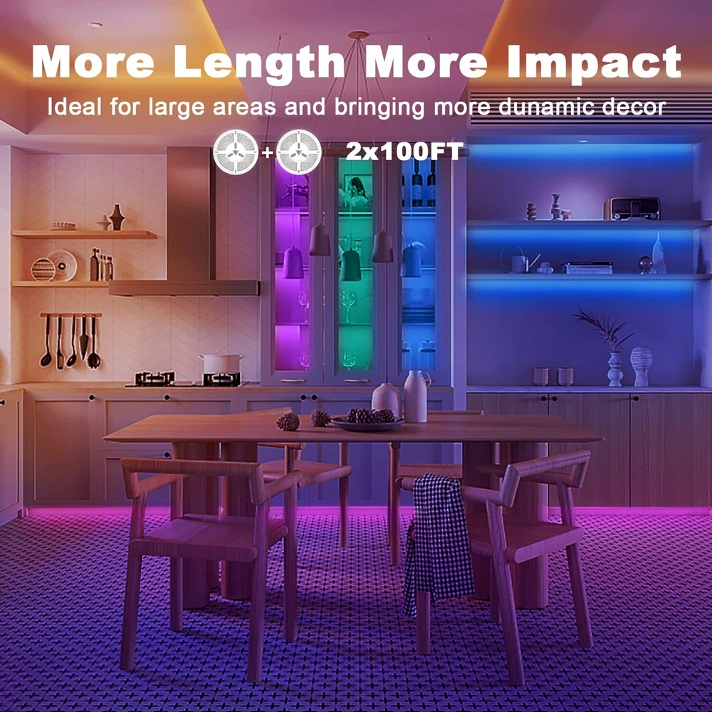 Packing List: 2*100feet led lights 1*instruction manual 1*remote controller 1*adapter [Smart APP and IR Remote Contorl]: Download the app with a stable bluetooth connection,control your LED lights with 16 million colors to choose from; 23 dynamic modes to switch at any time (remote control with DIY mode) in different speeds [Improve Life Scenes]: The LED light bar with a sensitive microphone can easily convert different atmospheres in the same space to synchronize with your favorite music, change the lights with the music rhythm, easily create a party atmosphere, and add color to your holiday [Timing Setting]: Choose your favorite color and preset timer at will. The Led light bar will automatically turn on/off at the set time. Repeat this setting according to the date you set or adjust the brightness as needed [Easily Setup]: It is easy to install and cut, and can customize the length according to your specific design. Just be careful cut along the copper wire markings. Tear off the strong adhesive tape on the lamp belt, fix the strip lamp on a clean and dry surface, and finish it in a few minutes [Practical and flexible]: It is long enough to meet multiple scenario options. There are 200 feet (2 rolls of 100 feet), and the strips are trimmed to fit your space. It is enough to illuminate the bedroom, kitchen, living room and bar, and easily transform the different atmosphere of the same space