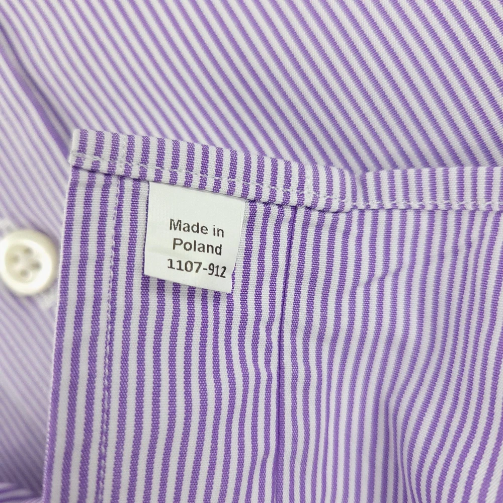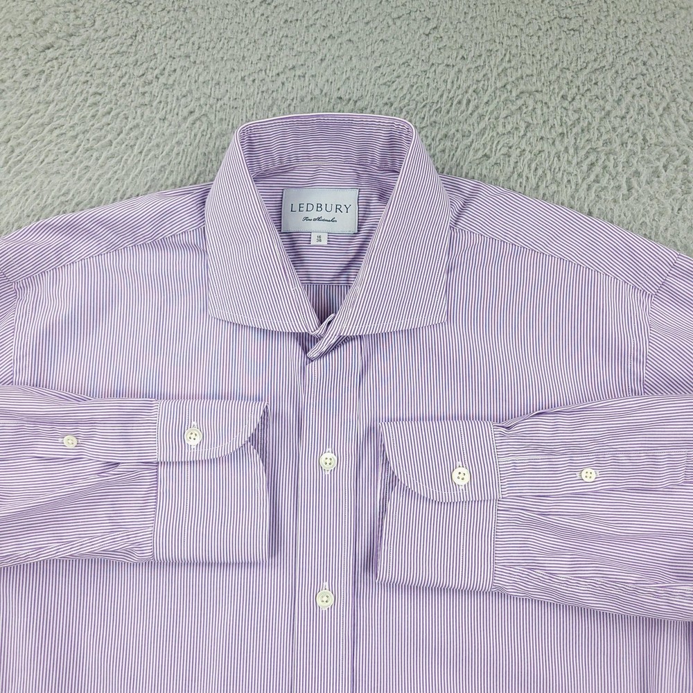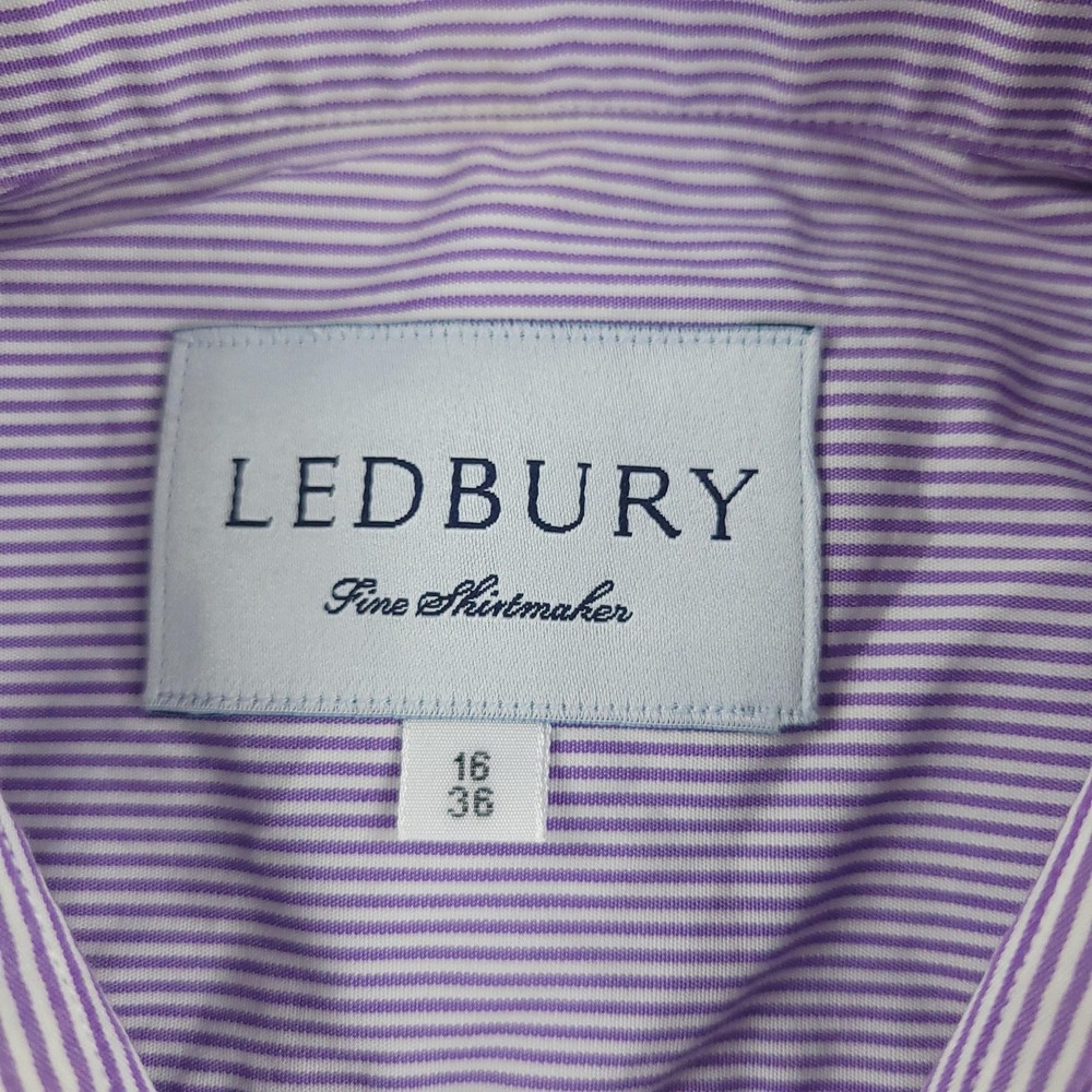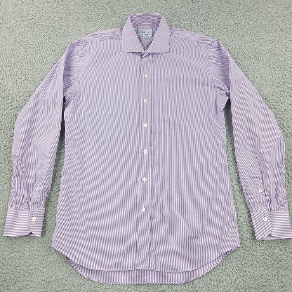 Ledbury Dress Shirt Mens 16 Purple Stripe 100% Cotton Long Sleeve Brand: Ledbury. Style: Mens long sleeve button-up dress shirt with full button front and spread collar. Color: Purple and white thin vertical stripe pattern. Size on tag: Mens 16 Material: 100% cotton woven fabric. Made in Poland. Features: Full button front placket with pearly buttons, long sleeves with button barrel cuffs and sleeve plackets, spread collar designed to be worn with or without a tie, no chest pocket for a clean front, curved shirttail hem suitable for wearing tucked or untucked, lightweight all-season cotton fabric with a regular fit silhouette ideal for business or office wear, Ledbury Fine Shirtmaker woven neck label, interior fabric content tag stating 100% cotton, interior Made in Poland label with code 1107-912. Measurements are included in the photos, compare measurements with your item to ensure proper fit. Items are added daily click here to Visit My Store Combined shipping for US customers is 1.99 for each additional item Items are cleaned per eBay standards & policies