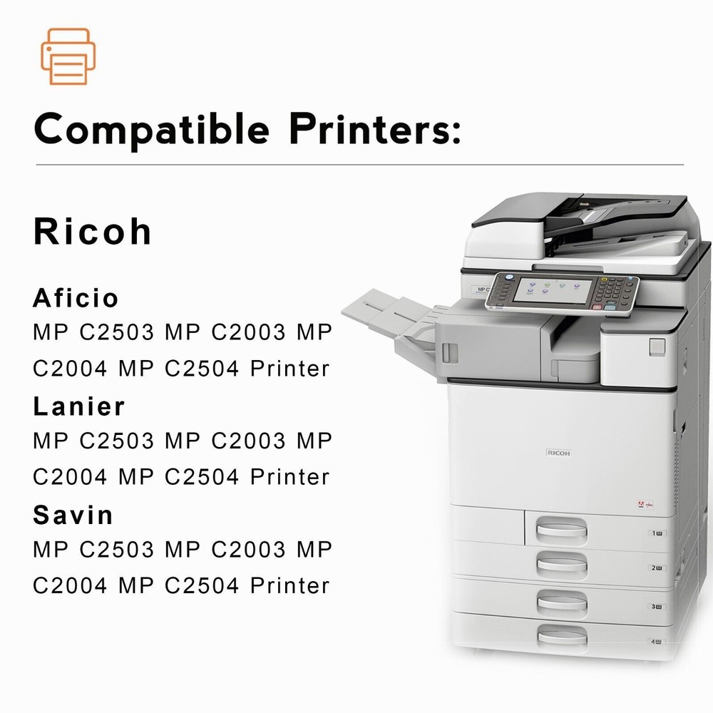 For use in Ricoh Aficio Lanier Savin MP C3003, MP C3503, MP C3004, MP C3504 Printers PREMIUM Toner kit contains 1 of each CMYK cartridge PAGE YIELD: 15,000 pages/black and 9,500 pages/color, based on the ISO/IEC 19798 industry standard of 5% page coverage BRIGHT Colors and BOLD Black prints. QUICK Shipping and Delivery. MODEL COLOR OEM# Yield @ 5% Aficio MP C3003,C3004,C3503,C3504 - Black 841918 15,000 Aficio MP C3003,C3004,C3503,C3504 - Cyan 841921 9,500 Aficio MP C3003,C3004,C3503,C3504 - Magenta 841920 9,500 Aficio MP C3003,C3004,C3503,C3504 - Yellow 841919 9,500 ✅ Toner supplies made with new components that match the strict OEM standards. Easy installation and error-free printing throughout the life cycle of the cartridge. ✅ 100% Factory Guarantee and Technical Support throughout the life cycle of the toner. Your satisfaction is our top priority because we believe in the quality of our products. 1. Open the front cover of the machine. 2. Pull out the toner cartridge slowly. 3. Take out the new toner cartridge from the box 4. Hold the toner cartridge and shake it five or six times. 5. Check the orientation of the toner cartridge and insert it carefully. 6. Close the front cover of the machine