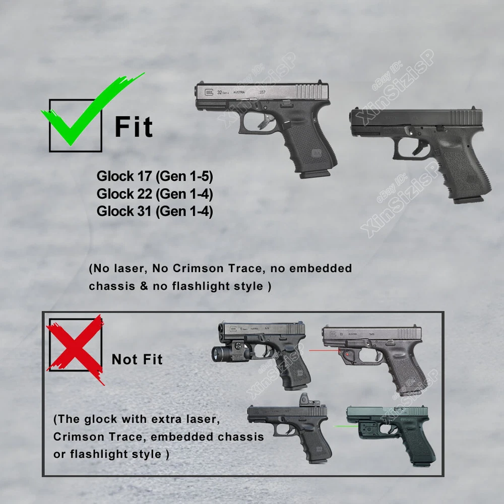 High Quality Military & Police Grade Polymer IWB Holster Specially Designed For Fast Draw During Duty Or Shooting Competition. Left Hand Draw Inside Waistband Holster Holster fit Glock 17 Gen1-4 4.49" 9mm Luger Glock 17M 4.49" 9mm Luger Glock 17 RTF2 9mm Luger Glock 17 Pro 4.49" 9mm Luger Glock 17T 9mm Luger Glock 17C Gen3-4 4.49" 9mm Luger Glock 17L Gen1-2 6.02" 9mm Luger Glock 22 Gen2-4 .40 S&W Glock 31 Gen3-4 .357 SIG Glock 37 Gen3-4 .45 GAP Materials & Durable Made of durable high-tech Kydex materials - Stronger than leather will wear out, the Kydex holster will not wear out and get flimsy. CARRY WITH CONFIDENCE: Please feel free to use our portable concealed holster to protect for Glock 17 Pistol. This is our high-quality KYDEX IWB Holster tailored for Glock 17 / Glock 22 / Glock 31 model. It is not only highly precise, but also rugged and durable, and can be hidden and portable, so you can protect yourself anytime, anywhere. Concealed Carry inside the waistline carry The combat-proven Holster by Tactical Scorpion Gear is a step forward in holster design and technology. COMPATIBILITY: The holster will fit any standard size 1.5 inch belt or lower. It WILL NOT fit Glocks with any aftermarket attachments (i.e. laser, flashlight, etc) however aftermarket sights are ok. Ease And Comfort Easy on / Easy off - No need to undo your belt every time you wear your holster.Sweat-proof- Protect your weapon from salty perspiration and not absorb sweat.Adapt to every environment In the Package: · 1*Holster Shipping: Ships same day or next except Sundays and Holidays ! Free shipping! Ship by USPS First Class Package. 100% MONEY BACK GUARANTEE. Any question please be free to contact with us .Thanks!