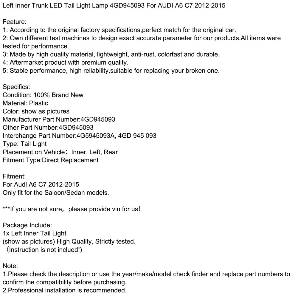 NEW-00004 Left Inner Trunk LED Tail Light Lamp For AUDI A6 C7 2012-15 DESCRIPTION Left Inner Trunk LED Tail Light Lamp 4GD945093 For AUDI A6 C7 2012-2015 Feature: 1: According to the original factory specifications,perfect match for the original car. 2: Own different test machines to design exact accurate parameter for our products.All items were tested for performance. 3: Made by high quality material, lightweight, anti-rust, colorfast and durable. 4: Aftermarket product with premium quality. 5: Stable performance, high reliability,suitable for replacing your broken one. Specifics: Condition: 100% Brand New Material: Plastic Color: show as pictures Manufacturer Part Number:4GD945093 Other Part Number:4GD945093 Interchange Part Number:4G5945093A, 4GD 945 093 Type: Tail Light Placement on Vehicle:Inner, Left, Rear Fitment Type:Direct Replacement ***Note:The Indicator Light is Amber Color. Suggest Replacing Entire Set Together. Fitment: For Audi A6 C7 2012-2015 Only fit for the Saloon/Sedan models. ***If you are not sure,please provide vin for us! Package Include: 1x Left Inner Tail Light (show as pictures) High Quality, Strictly tested. (Instruction is not inclued!) Note: 1.Please check the description or use the year/make/model check finder and replace part numbers to confirm the compatibility before purchasing. 2.Professional installation is recommended. About Us Shipping Terms Of Sale Contact Us Areyourshop has committed to do our utmost to serve more vehicles models with the most competitive products both in price and service, including headlights, foglights, taillights,headlight assembly, etc., aiming at the largest group of customers. Paired with our fast shipping and satisfaction guarantee, we’re able to ensure that all the customers can get the product when they need it. Customer Satisfactory 1.We back our commitment with superb service, 100% full money back and a customer satisfaction guarantee. 2.I am here and ready to assist you with any questions or concerns you might have before or after the purchase. 3.My goal is to make sure you are a happy customer and pleasant shopping with us. Feedback If you are satisfied with the purchase and our total service, your comment is very important in our business success. Please take a minute to leave us a positive feedback with an overall Detailed Selling Rating (DSR) of 5. Our eBay account setup auto feedback, so eBay system gives you automatically Positive feedback back after your positive feedback left. If you plan to give us a neutral/negative feedback Or open ebay/paypal case, please write to us immediately so that we can do our best to resolve your problem. United States Buyers Parcel will via USPS or UPS from us United States warehouse Shipping Time Usually ,Parcel will be delivered 2-7 working day include Handling time. Sometimes shiping time may has a little delay, such as Bad wether,Holidays We stand behind everything that we sell and will do everything possible to assure you are satisfied. When you receive your purchase if you are not 100% satisfied, please sent me ebay message and we will do our best to make you happy. If you still want to return your purchase, simply ship the item(s) back to us and we will refund your original purchase price and the original shipping charge. Buyers are responsible for the postal cost of returning the items. We must be notified of the intent to return your item within 30 days of receiving the item. Items returned must be in the same condition that they were received. How to return 1,Please ask us for return address . 2,Shipping back the package . The RMA#(Return Merchant Authorization Number = Your ebay ID) must be clearly written on the return package ,Otherwise the package will be refused. 3,Sent us the return tracking number. 4,All returns will be inspected prior to a credit being issued. If you have any questions, welcome to send us ebay message. We strive to answer all questions and resolve any problems as quickly as possible. Business Hours: HongKong Time GMT+8:00 Monday-Saturday 9:00-17:00 About Us About Item All items sold by us are being described to the best of our abilities, as accurate as possible, and with utmost conscientiousness on our part. However, to avoid any potential oversights, I respectfully request your assistance in helping us to make this a mutually satisfactory transaction by THOROUGHLY reviewing item description and photos, and asking all questions PRIOR TO BIDDING. Customer Satisfactory 1.We back our commitment with superb service, 100% full money back and a customer satisfaction guarantee. 2.I am here and ready to assist you with any questions or concerns you might have before or after the purchase. 3.My goal is to make sure you are a happy customer and pleasant shopping with us. Feedback If you are satisfied with the purchase and our total service, your comment is very important in our business success. Please take a minute to leave us a positive feedback with an overall Detailed Selling Rating (DSR) of 5. Our eBay account setup auto feedback, so eBay system gives you automatically Positive feedback back after your positive feedback left. If you plan to give us a neutral/negative feedback Or open ebay/paypal case, please write to us immediately so that we can do our best to resolve your problem. Shipping United States Buyers Parcel will via USPS or UPS from us United States warehouse Shipping Time Usually ,Parcel will be delivered 2-7 working day include Handling time. Sometimes shiping time may has a little delay, such as Bad wether,Holidays Terms Of Sale We stand behind everything that we sell and will do everything possible to assure you are satisfied. When you receive your purchase if you are not 100% satisfied, please sent me ebay message and we will do our best to make you happy. If you still want to return your purchase, simply ship the item(s) back to us and we will refund your original purchase price and the original shipping charge. Buyers are responsib