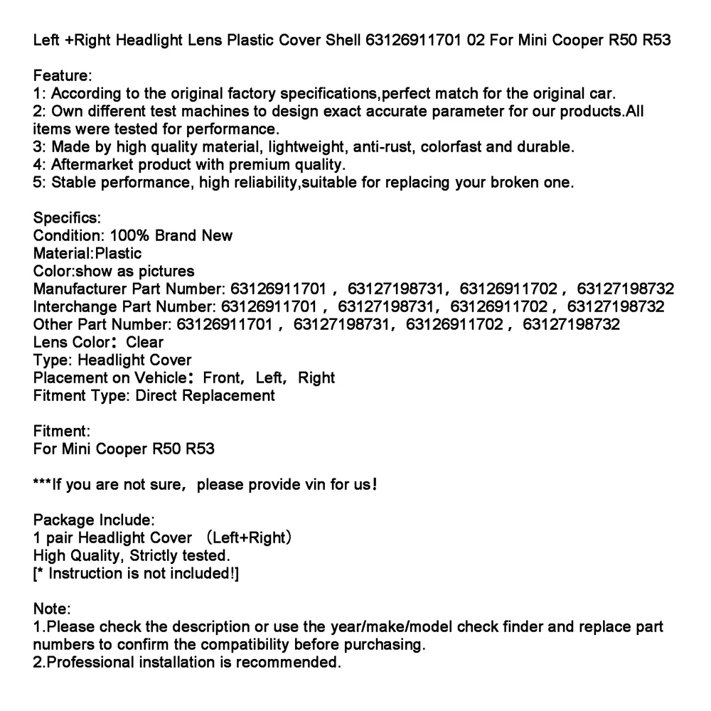 You may also like New OSRAM Original 94196 H4 75/70W P43T 24V Halogen Headlight Lampbulb BILUX USA 13.85 USD Free shipping Xenon Headlight Headlamp Ballast 6G Control Module 89034934 For SEAT ALTEA EXEO 32.85 USD Free shipping 1PC Car Clear Headlight Headlamp Lens Cover Shell For BMW E38 1999-2001 Left 28.85 USD Free shipping For Philips 11362U3551X2 Ultinon Rally 3551 LED-HL H11 12-24V 50W 6500K 73.85 USD Free shipping New Philips Bulb Rally Vision Halogen Headlamp 12569 12V 100/90W H4/9003/HB2 USA 14.85 USD Free shipping For Philips 11066AU60X2 Ultinon Pro6000 LED-AMBER W21/5W intense AMBER 80/16lm 26.85 USD Free shipping Fit For Philips HS1 Ultinon Essential Moto +100% Brighter 6500K White Light AV 21.85 USD Free shipping Xenon Headlight TMS Driver Module 63117316187 For BMW F10 F11 F07 X5 F15 F85 ... 67.85 USD Free shipping For Philips 11498RU60X2 Ultinon Pro6000 LED-RED P21W intense Red 75lm 26.85 USD Free shipping For Philips 12188NAC1 Car Standard Auxiliary Bulbs PSY24W 12V24W PG20/4 M2 17.91 USD 18.85 USD Free shipping 5% off 1x For Philips WY16W Car Auxiliary Bulb 12V16W 12067A AV 10.85 USD Free shipping Xenon Headlight AFS Cornering Leveling Control Module 7L6941329B For AUDI A6 92.85 USD Free shipping Left +Right Headlight Lens Plastic Cover Shell 63126911701 02 For Mini Cooper R50 R53 Feature: 1: According to the original factory specifications,perfect match for the original car. 2: Own different test machines to design exact accurate parameter for our products.All items were tested for performance. 3: Made by high quality material, lightweight, anti-rust, colorfast and durable. 4: Aftermarket product with premium quality. 5: Stable performance, high reliability,suitable for replacing your broken one. Specifics: Condition: 100% Brand New Material:Plastic Color:show as pictures Manufacturer Part Number: 63126911701 ,63127198731,63126911702 ,63127198732 Interchange Part Number: 63126911701 ,63127198731,63126911702 ,63127198732 Other Part Number: 63126911701 ,63127198731,63126911702 ,63127198732 Lens Color:Clear Type: Headlight Cover Placement on Vehicle:Front,Left,Right Fitment Type: Direct Replacement Fitment: For Mini Cooper R50 R53 ***If you are not sure,please provide vin for us! Package Include: 1 pair Headlight Cover (Left+Right) High Quality, Strictly tested. [* Instruction is not included!] Note: 1.Please check the description or use the year/make/model check finder and replace part numbers to confirm the compatibility before purchasing. 2.Professional installation is recommended. -About US Founded in 2012, VIPJQ have professional development and sales, and are involved in various products, providing customers with various high-quality products. Since its establishment, VIPJQ has always adhered to the service concept of "customer first" and the management concept of "pursuit of quality", and is committed to providing customers with high-quality original designs. We commit to provide you the best innovative, quality products & professional services with competitive prices. We value every customer, and we look forward to providing solutions for your business needs to help your business achieve its goals, please contact us immediately! We are all about you! We are a Japanese seller,but with large warehouse in USA. We are profesional on Auto Parts,Car Parts,Motorcycle Parts,3C,other hot sale items and so on. We aim to provide to customers high quality product and best service. -About Shipment&Returns The item usually will be dispatched within 3 days after you ordered.All are free shipping. And it usually takes 3-10 working days to delivery depends on buyers' address or other majeure on the way. If you are not satisfied with the items and want to return the item,we hope you could message us first,we will give you the return details, we think we could give you the best service to save your time and money.Thank you. -About Feedback&Customer Service If you are enjoy your shopping here,not only enjoy the items but also the service,we are appreciate you could give us a 5-star feedback. If you are not satisfied with the item,before you give us the negative feedback,we hope we could give you the best solution through our commutication. We think we could do it if you give us the chance.Thank you.