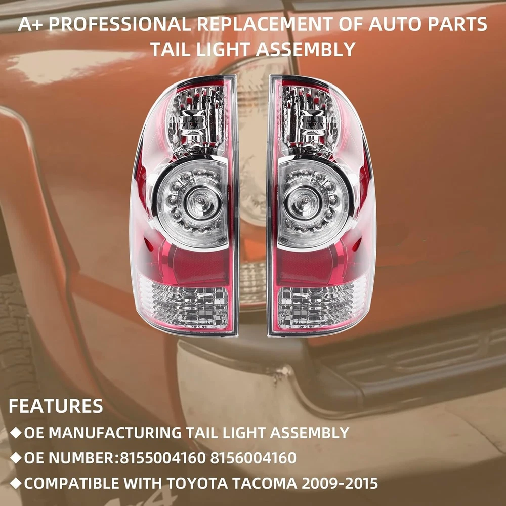 About this item 【Replacement Part Number】8155004160 8156004160 【Compatible With】Second generation Toyota Tacoma 2005-2015,toyota tacoma tail lights 【Package list】Left Driver Light Assembly x1pc,Right Passenger Light Assembly x1pc 【Features】This is an Aftermarket Tail Light Assembly,include driver side one and passenger side one.They are OEM standard, you can install them directly. 【Function】Replace damaged taillights to ensure safe driving at night. Product Description Our product pictures are all taken by ourselves, which truly show the quality and characteristics of the products, so you can buy without worry When your lampshade is full of water vapor, which affects the brightness of the lamp,you need to change them.Our product maybe a good choice Features OE Manufacturing Tail Light Assembly OE Number:8155004160 8156004160 Compatible with Toyota Tacoma 2005-2015, Second generation Package List:Left Light Assembly x1pc,Right Light Assembly x1pc Material:High quality LED light and stable ABS plastic High-performance connector, Reliable and not easy to deform Three bulb installation locations, which can replace broken bulbs, which is convenient and quick LED lamp beads, the light is brighter, and the service life is longer Question: Is this compatible with a Toyota Yaris 2007? Answer: No,these tailLamp is conpatible with Toyota tacoma 2005-2015,the second generation. ------------------------------------------------------------------------------------------------------------------------------------------------------------------------- Question: Does your tail light meet OEM standards? What is the manufacturer number? Answer: Yes, our tail light is OEM standard,part number is 8155004160 8156004160 ------------------------------------------------------------------------------------------------------------------------------------------------------------------------- Question: It comes one pc or one pair? Answer: It comes one pair like the pictures ------------------------------------------------------------------------------------------------------------------------------------------------------------------------- Question: Is it LED type? Answer:Yes,this tailLight Assembly is LED type ------------------------------------------------------------------------------------------------------------------------------------------------------------------------- Shipping We offer FREE shipping on all orders! We ship within Three business days of payment, usually sooner. We use a selection of shipping services such as UPS, FedEx, USPS etc. We only ship to the lower 48 states, no APO/FPO addresses or PO Boxes allowed. Local pickups and combined shipping options are not provided at this time. Return You can return a product for up to 30 days from the date you purchased it. Any product you return must be in the same condition you received it and in the original packaging. Please keep the receipt. Payment We accept payment by any of the following methods: PayPal Please pay as soon as possible after winning an auction, as that will allow us to post your item to you sooner! Feedback Customer satisfaction is very important to us. If you have any problem with your order, please contact us and we will do our best to make you satisfied. Contact Us If you have any queries, please contact us via ebay. We usually respond within 24 hours on weekdays. Please visit our eBay store to check out other items for sale! Thank you for shopping at our store. Disclaimer We are working with different suppliers in USA to deliver the item to your doorstep. If you have any issues regarding the item, Feel free to ask.