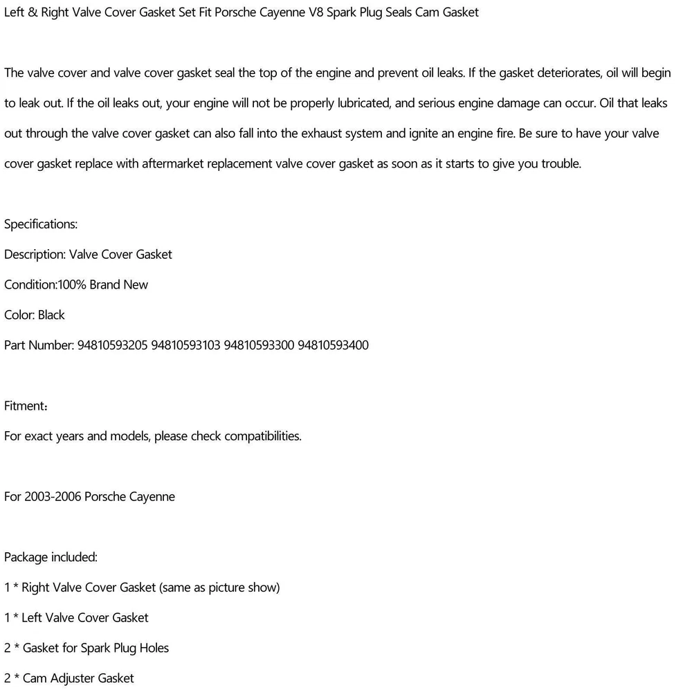 You may also like Low Pressure Turbocharger fit Mercedes-Benz W176 W246 C117 X117 X156 A2700902280 35.85 USD Free shipping Turbo Turbocharger + Gaskets for Ford Fiesta Focus C-Max Transit 1.0L 1761178 259.85 USD Free shipping Turbo Turbocharger For Fiat Viaggio Bravo Ottimo 1.4 T-Jet 55235154 807072 199.85 USD Free shipping Turbo Diverter Solenoid Valve 11658636606 for BMW Mini R55 R56 R57 R58 R59 R60 33.85 USD Free shipping Intake Charge Pipe for BMW M2 M235i 335i 435i N55 F20 F30 RWD 2012-2016 69.85 USD Free shipping Common Rail Fuel Pump Pressure for Citroen for Peugeot 2.0 HDi 0281002493 D5 56.85 USD Free shipping Turbocharger Solenoid Valve For BMW X3 X5 3.0L 4.4L 11657602293 756103-0008 29.31 USD 30.85 USD Free shipping 5% off Electronic Turbocharger Actuator for Jaguar / Land Rover 2.2D 49477-01214 100.85 USD Free shipping Turbocharger Boost Solenoid Valve for BMW 320i 328i 335i 428i X5 11747626351 28.85 USD Free shipping Turbocharger Wastegate Actuator 06K145613B Fit For VW Passat B7 1.8 2014-2017 99.85 USD Free shipping Turbo Boost Pressure Control Valve for BMW 1 3 5 6 7 X3 X5 X6 11747796338 26.85 USD Free shipping Turbo Boost Control Solenoid Valve for Vauxhall Insignia 2.0 Diesel 55575611 27.85 USD Free shipping Left & Right Valve Cover Gasket Set Fit for Porsche Cayenne V8 Spark Plug Seals Cam Gasket The valve cover and valve cover gasket seal the top of the engine and prevent oil leaks. If the gasket deteriorates, oil will begin to leak out. If the oil leaks out, your engine will not be properly lubricated, and serious engine damage can occur. Oil that leaks out through the valve cover gasket can also fall into the exhaust system and ignite an engine fire. Be sure to have your valve cover gasket replace with aftermarket replacement valve cover gasket as soon as it starts to give you trouble. Specifications: Description: Valve Cover Gasket Condition:100% Brand New Color: Black Part Number: 94810593205 94810593103 94810593300 94810593400 Fitment: For exact years and models, please check compatibilities. For 2003-2006 for Porsche Cayenne Package included: 1 * Right Valve Cover Gasket (same as picture show) 1 * Left Valve Cover Gasket 2 * Gasket for Spark Plug Holes 2 * Cam Adjuster Gasket -About US Founded in 2012, VIPJQ have professional development and sales, and are involved in various products, providing customers with various high-quality products. Since its establishment, VIPJQ has always adhered to the service concept of "customer first" and the management concept of "pursuit of quality", and is committed to providing customers with high-quality original designs. We commit to provide you the best innovative, quality products & professional services with competitive prices. We value every customer, and we look forward to providing solutions for your business needs to help your business achieve its goals, please contact us immediately! We are all about you! We are a Japanese seller,but with large warehouse in USA. We are profesional on Auto Parts,Car Parts,Motorcycle Parts,3C,other hot sale items and so on. We aim to provide to customers high quality product and best service. -About Shipment&Returns The item usually will be dispatched within 3 days after you ordered.All are free shipping. And it usually takes 3-10 working days to delivery depends on buyers' address or other majeure on the way. If you are not satisfied with the items and want to return the item,we hope you could message us first,we will give you the return details, we think we could give you the best service to save your time and money.Thank you. -About Feedback&Customer Service If you are enjoy your shopping here,not only enjoy the items but also the service,we are appreciate you could give us a 5-star feedback. If you are not satisfied with the item,before you give us the negative feedback,we hope we could give you the best solution through our commutication. We think we could do it if you give us the chance.Thank you.